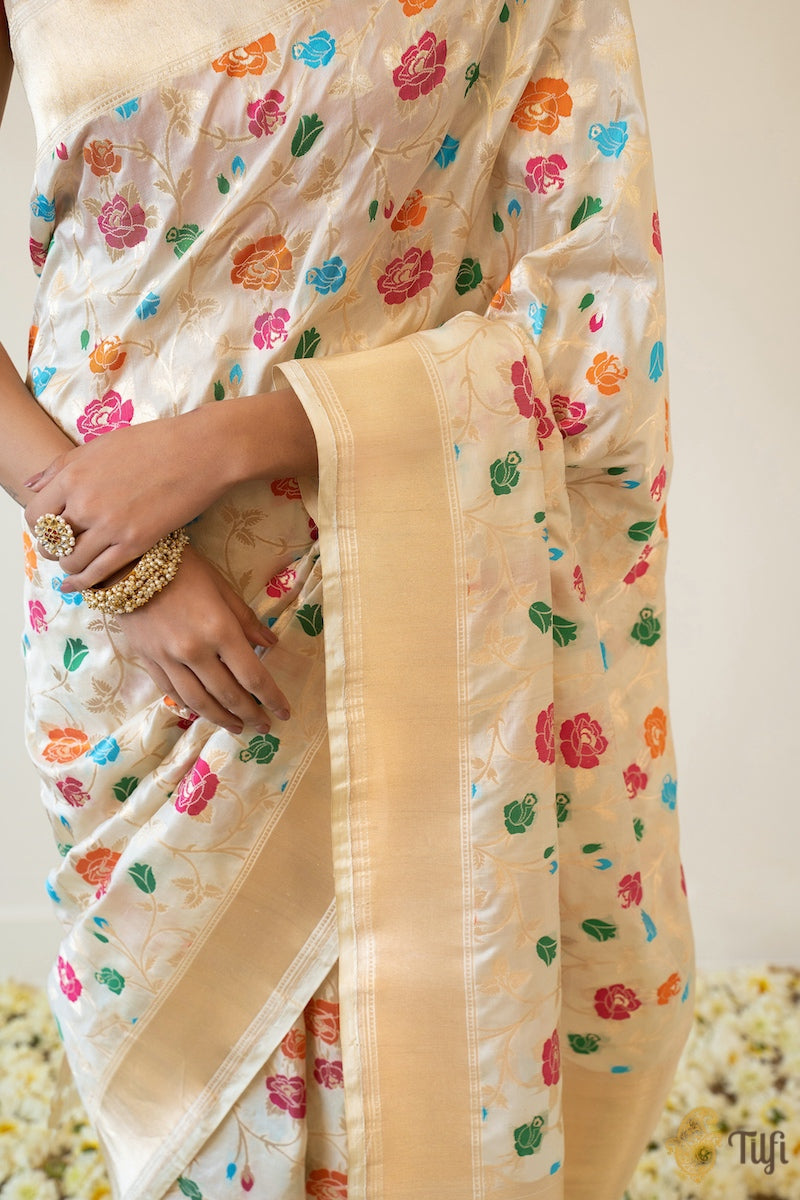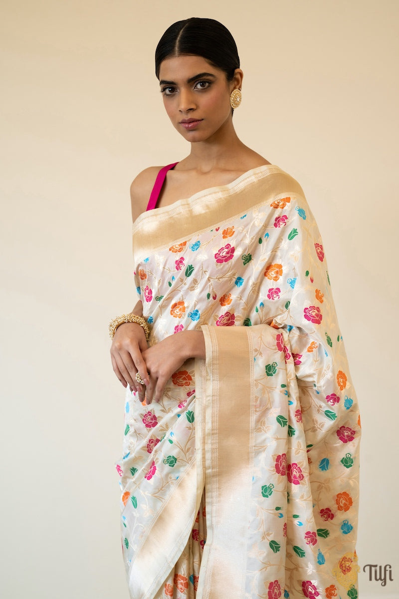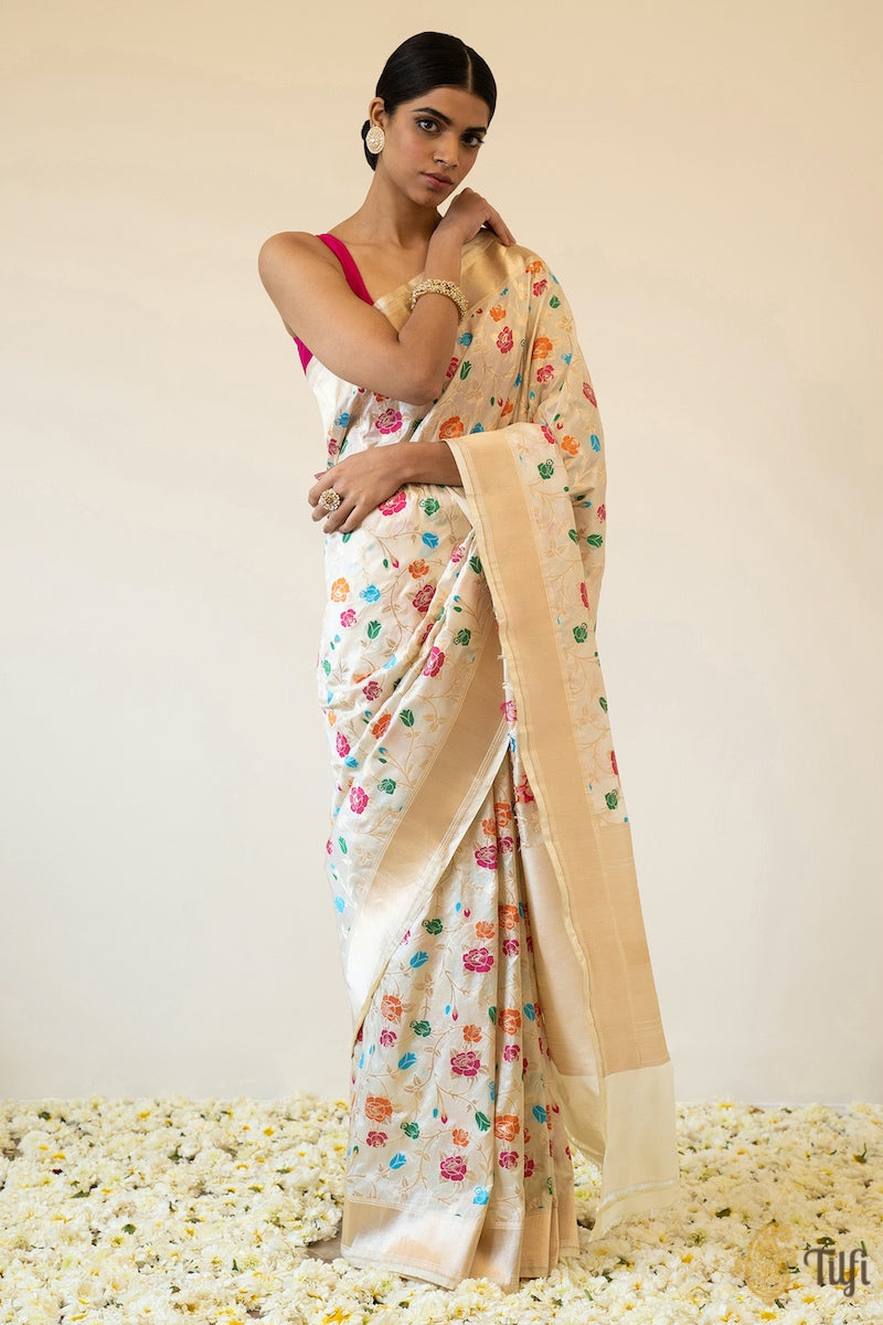 Speciality - A beautifully handwoven allover floral jaal with multicoloured Meenakari, creating a veritable bouquet on the yards of cloth.
