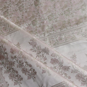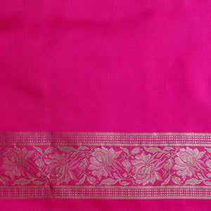 Technique - The finest Tanchoi weaving technique, which employs one or more warps and multiple coloured wefts to produce a self-design which covers the body of the saree. Meenakari involves the painstaking addition of supplementary coloured resham threads during the hand-weaving process.