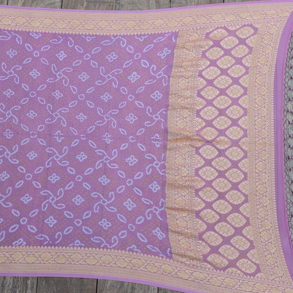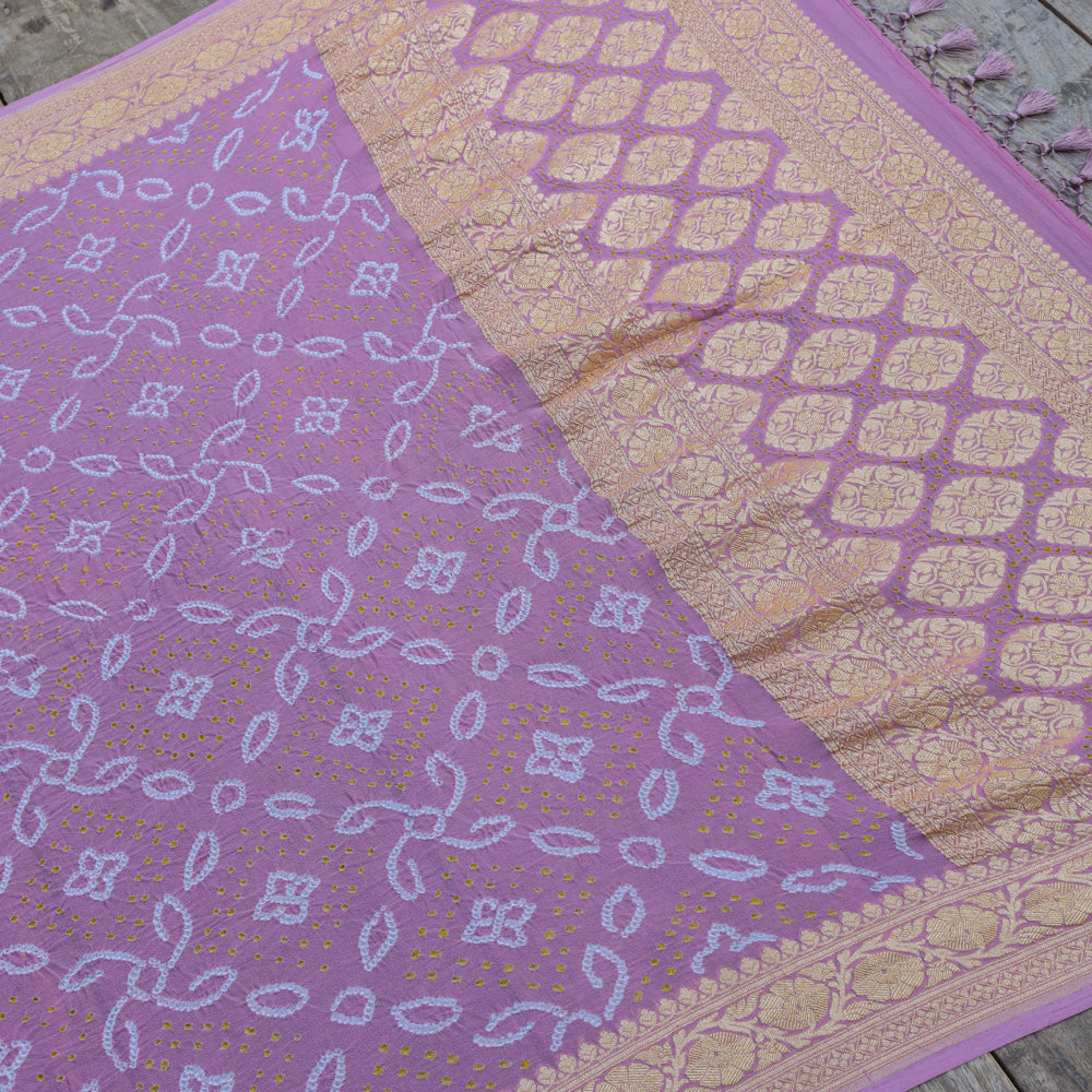 A celebration of Indian textile arts, this handwoven Banarasi dupatta has been hand-dyed in the classic Kutchi Bandhani technique. Made on pure Khaddi Georgette, the body is adorned with mesmerizing patterns in vivid colours to bring on the festive spirit, and complemented with classic and intricate golden zari work on the borders.