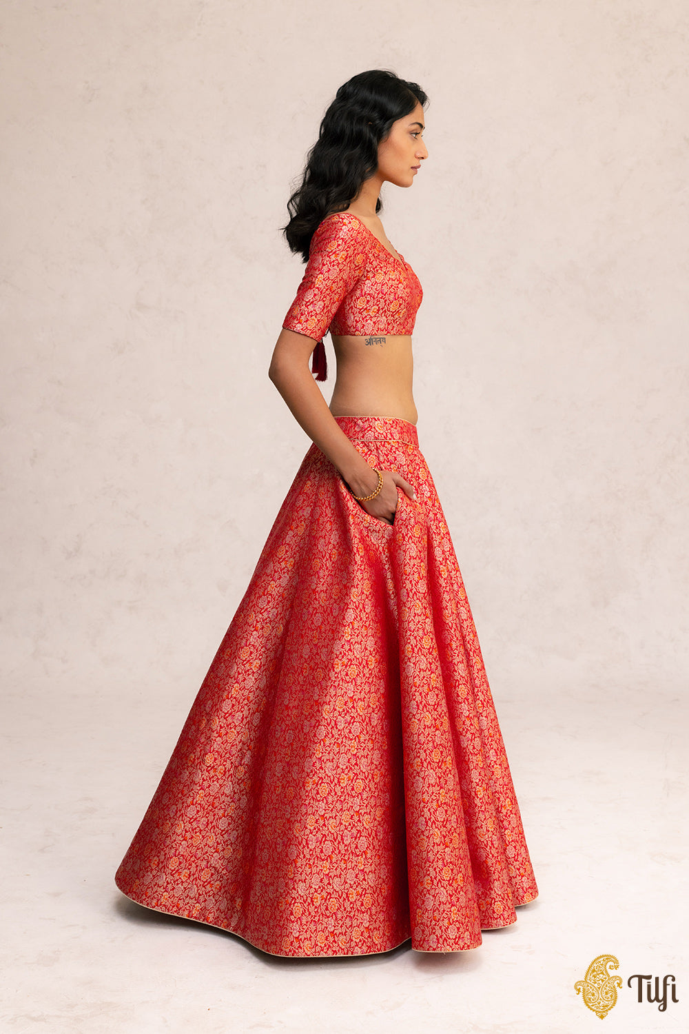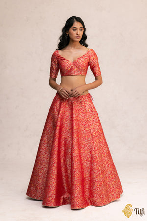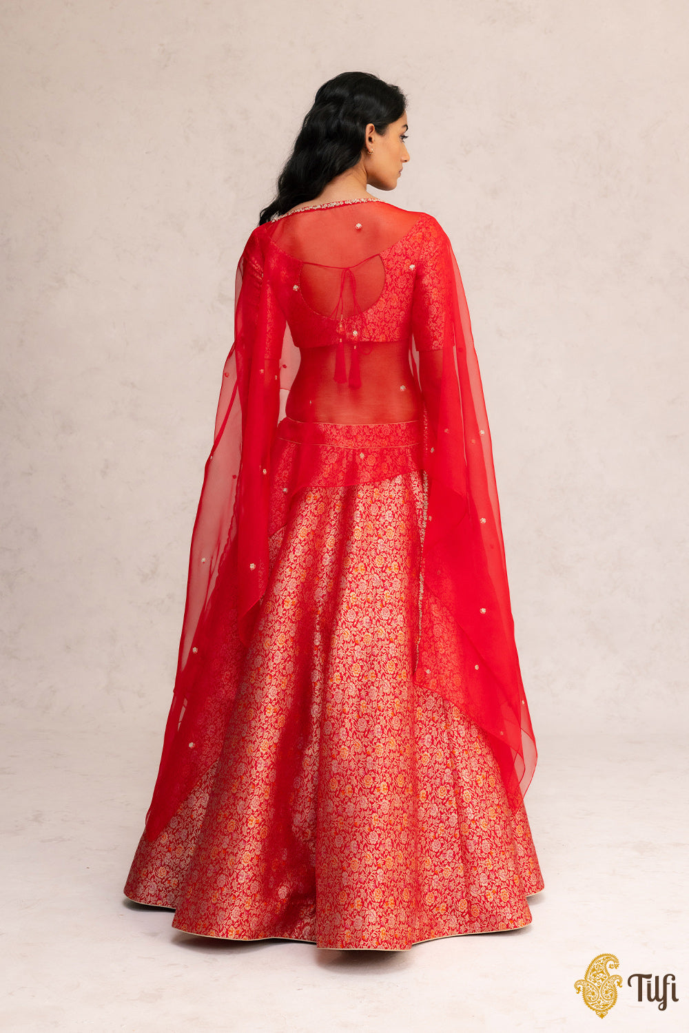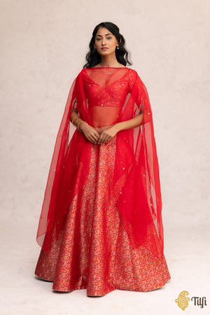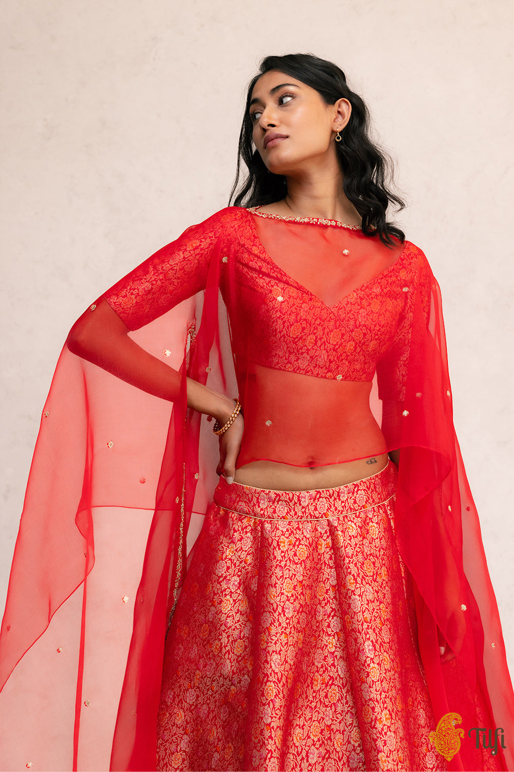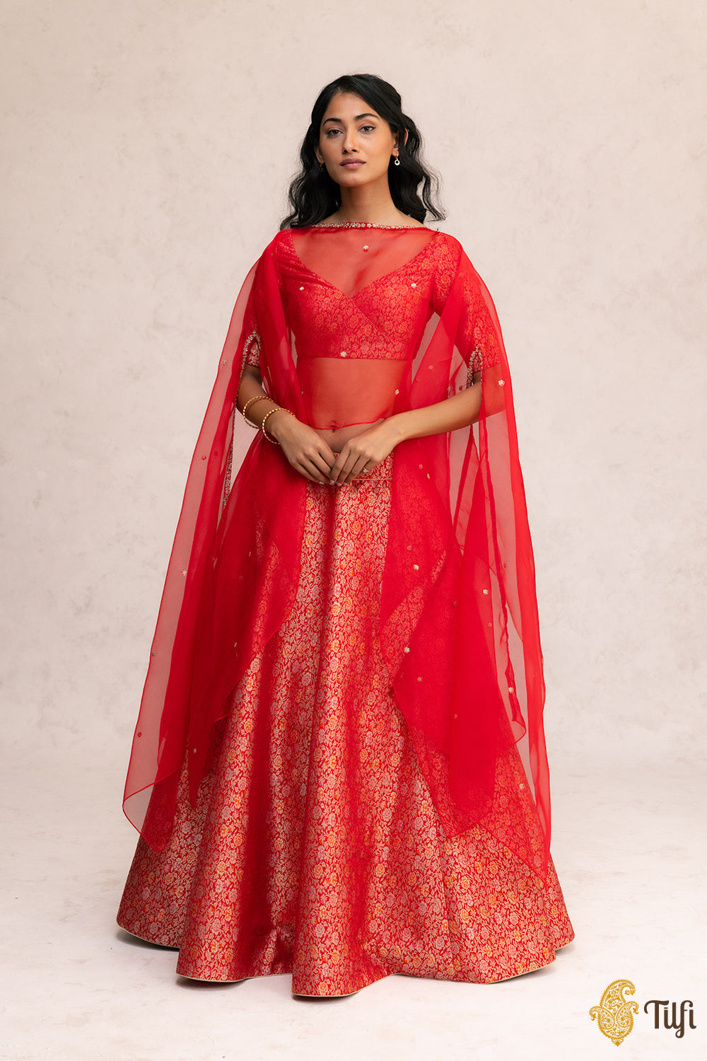 A bright red lehenga featuring a brocade blouse, skirt and a contemporary cape dupatta. Theflared long skirt is covered with intricate all-over rose jaal patterns, handwoven using gold zari and detailed with resham meenakari in orange and pink hues.Fine hand embroidery embellishes a gossamer organza silk cape dupatta, completing the set to create a classic yet versatile silhouette.