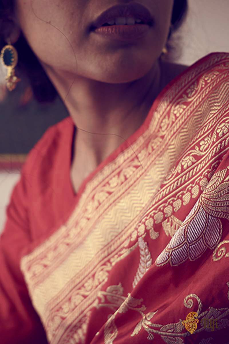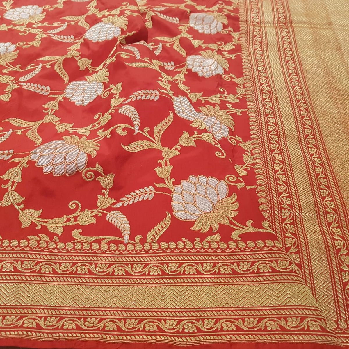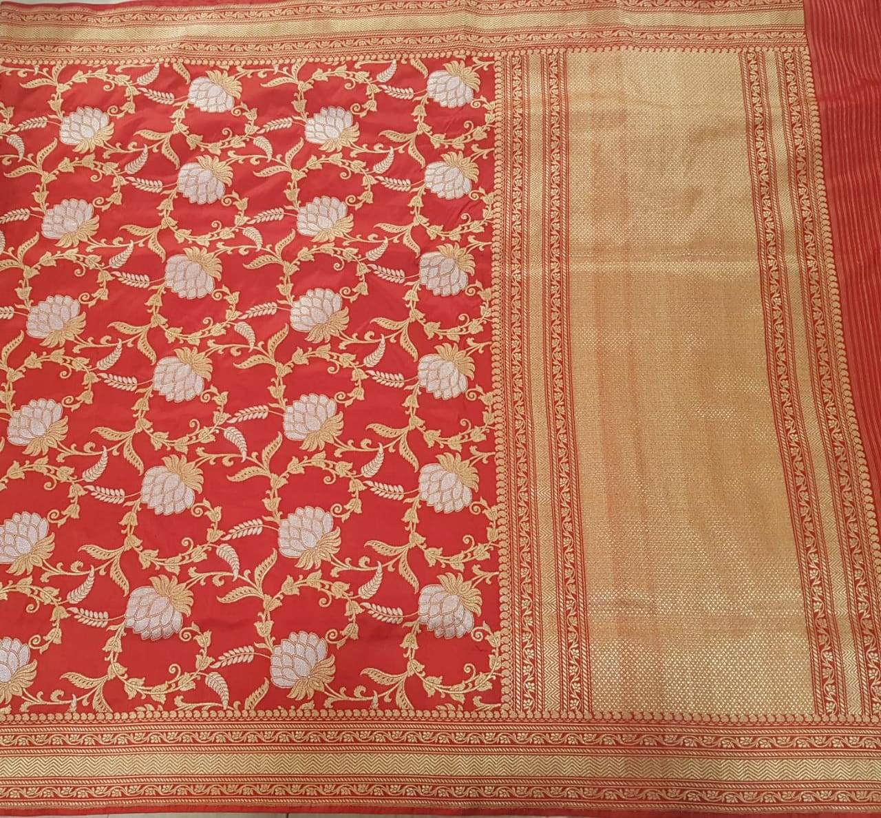 • Speciality - Luxury is in the details of this handwoven masterpiece with a rich and intricate Roopa Sona or Gold and Silver zari floral jaal. Breathtaking Banarasi opulence!