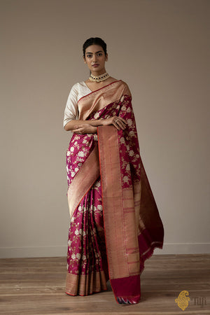 A beautiful, delightful and absolutely luxurious Banarasi dream! A magnificent gold and silver jangla with an artistic pattern and opulent use of zari. Who wouldn’t swoon over this classic that is ornamented with roses, vines and all things fine?