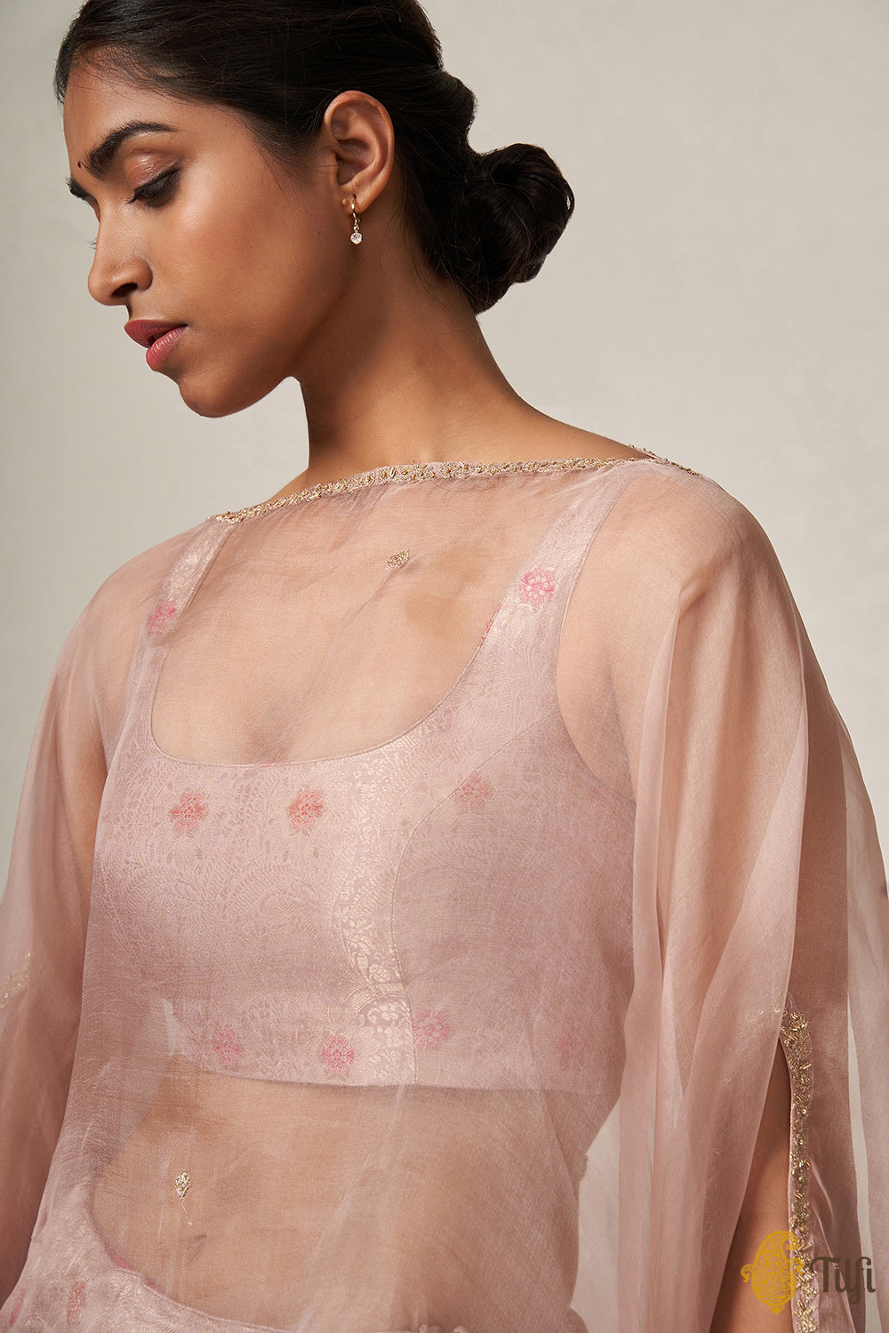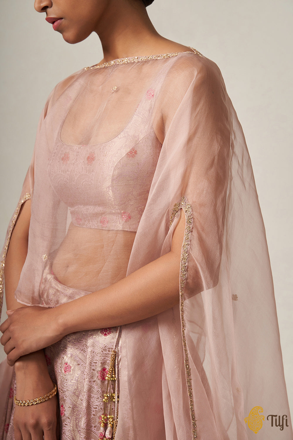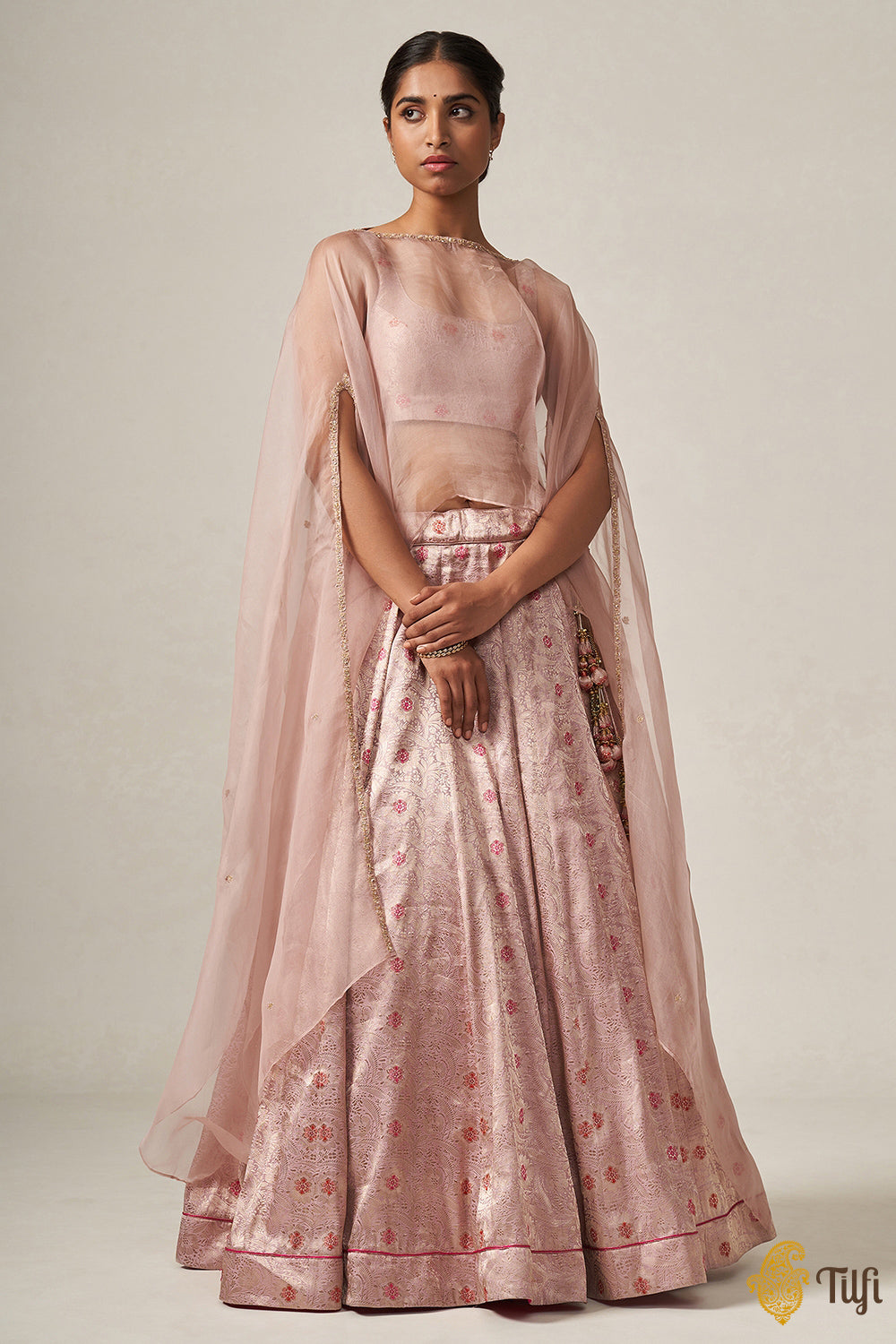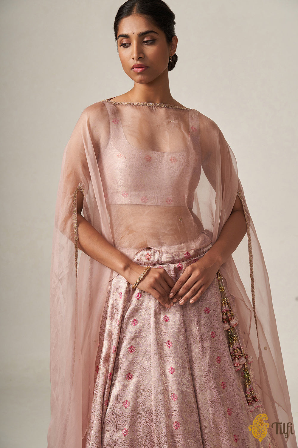 A delicate and effortless ensemble, steeped in our handloom heritage. The best of Banarasi craftsmanship and finery, paired with the soft, fleeting romance of delicate hand-embroidery on gossamer organza. A brocade blouse and skirt and a versatile, contemporary cape.