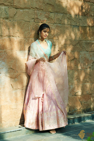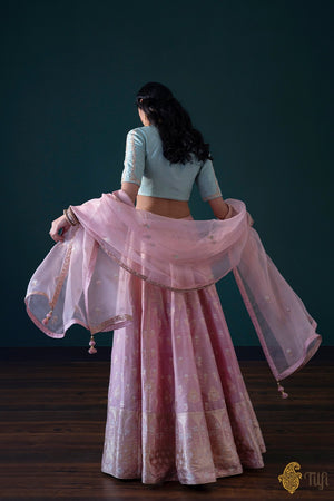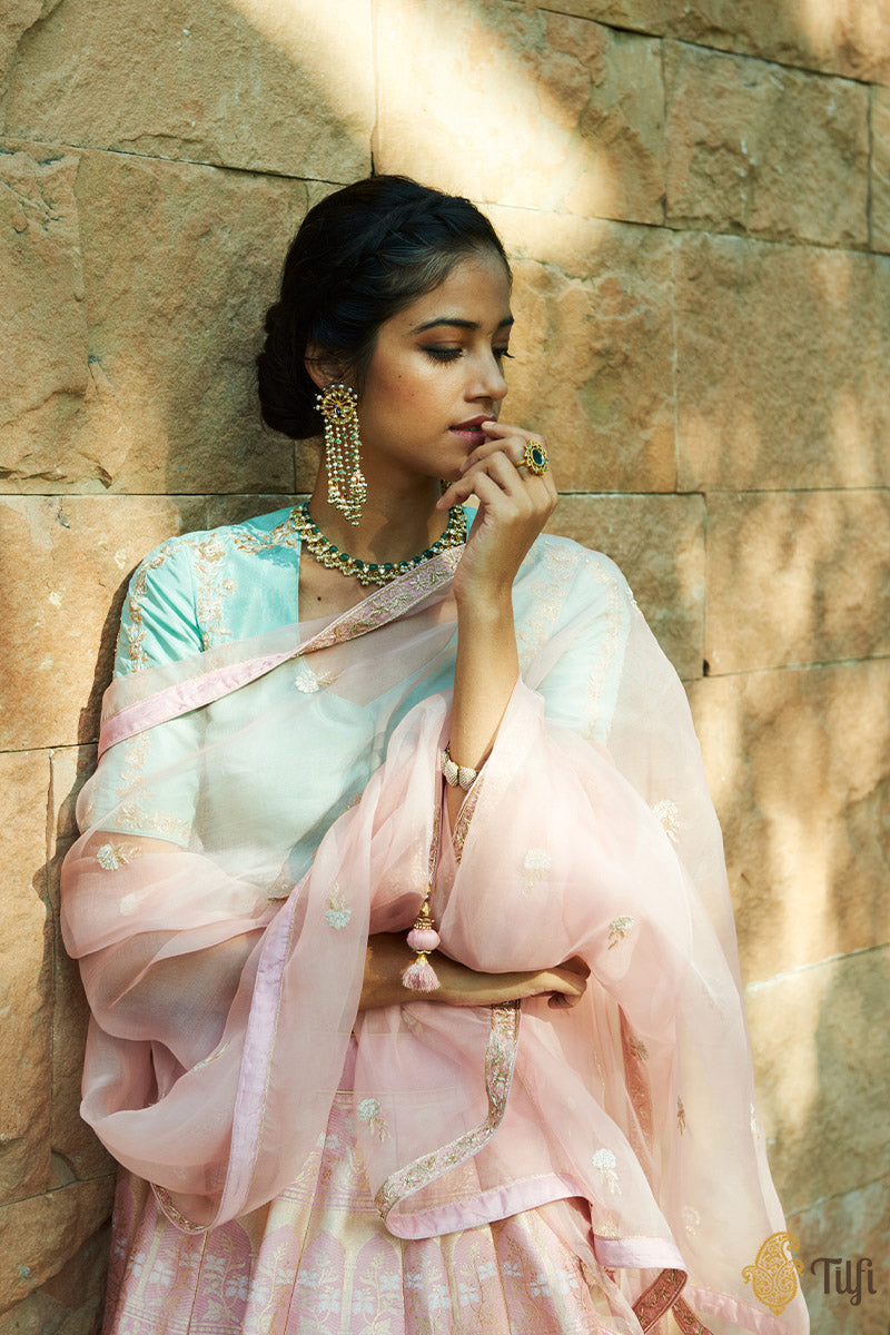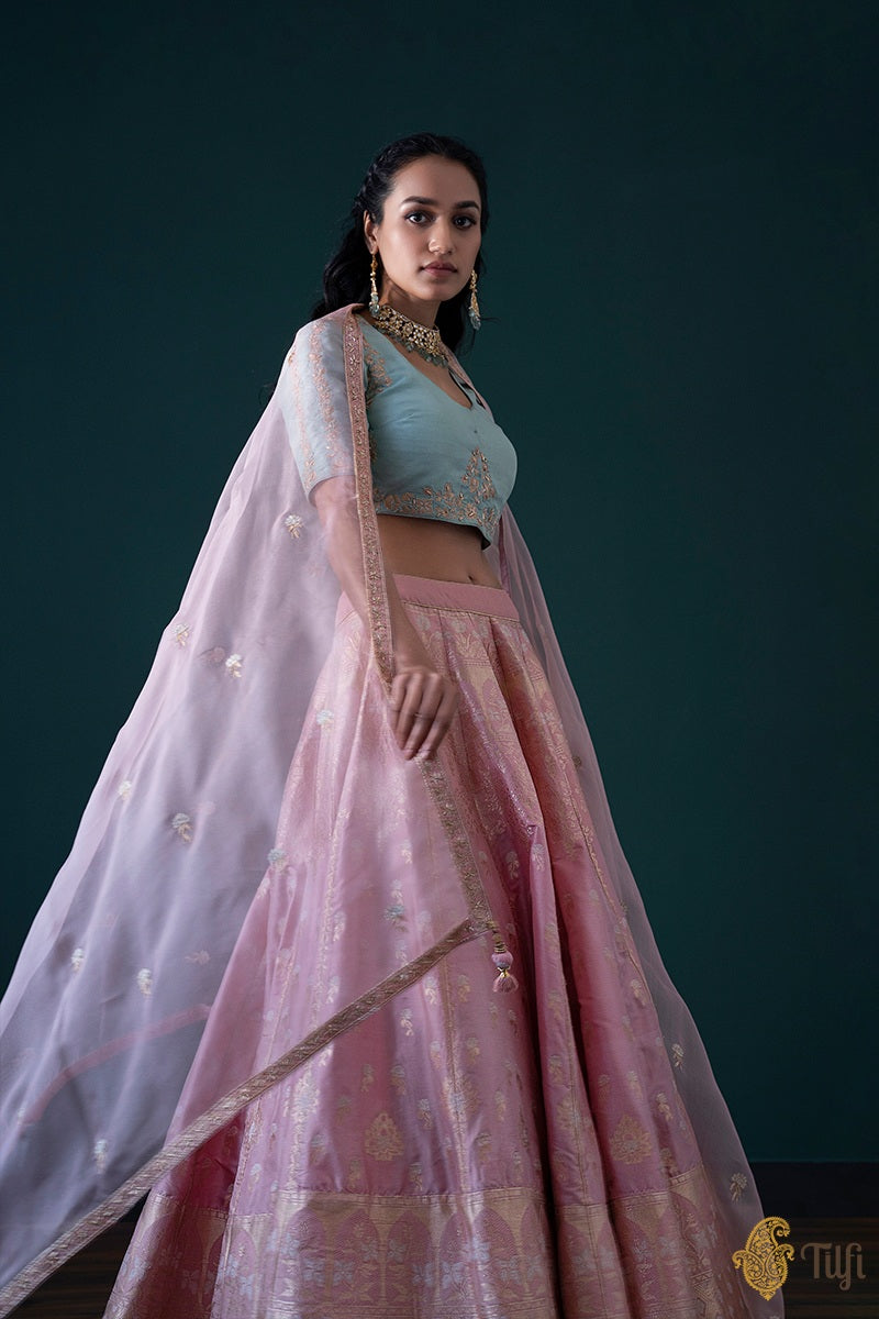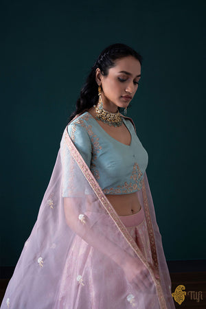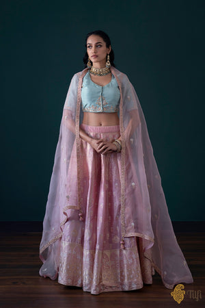 Speciality - This beautiful lehenga is handwoven in classic roopa sona zari with delicate floral bootis. The odhani features beautiful, painstaking aari hand-embroidery all across its borders and bootis and two-toned zari. Completed with a softly textured and ornately hand-embroidered raw silk blouse.