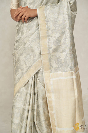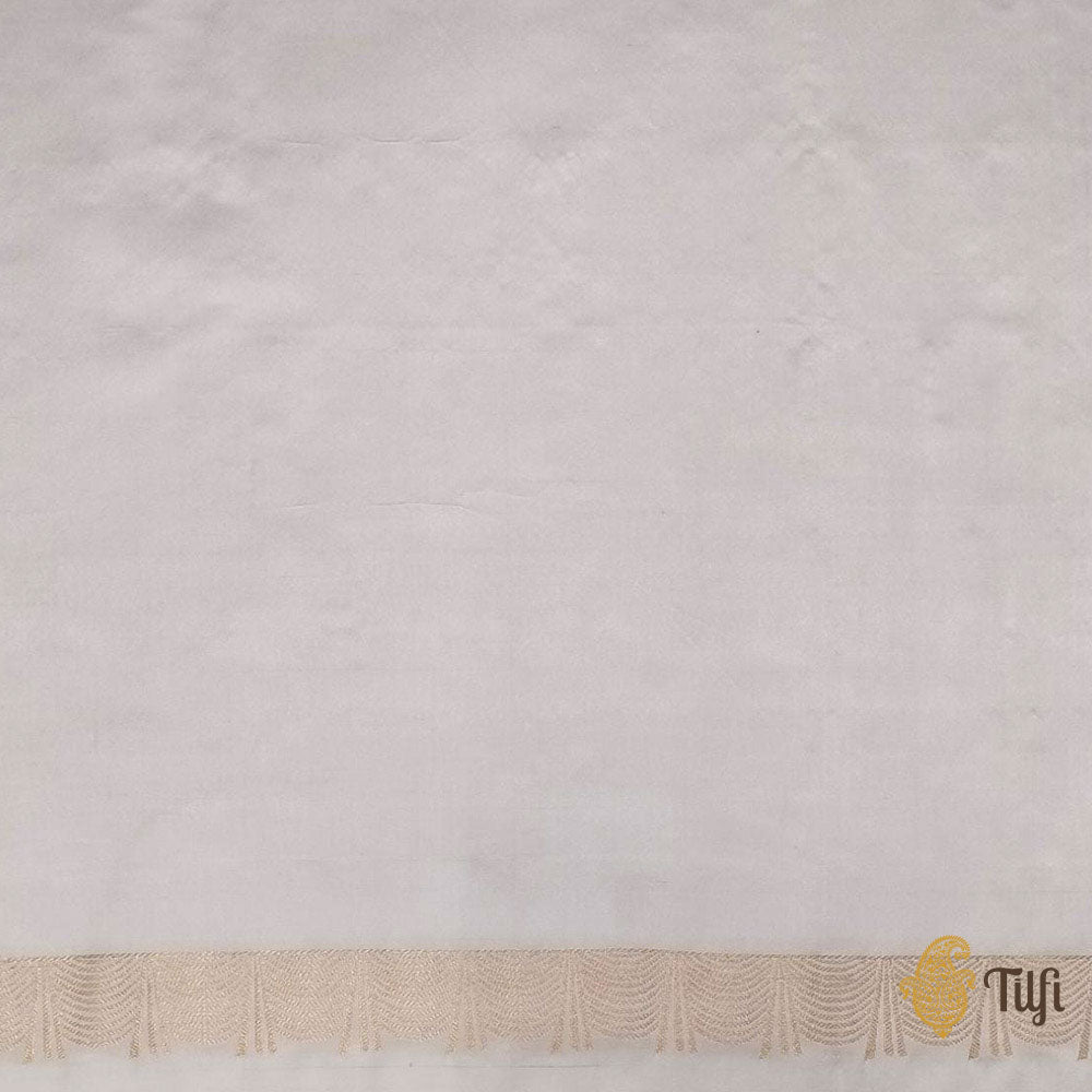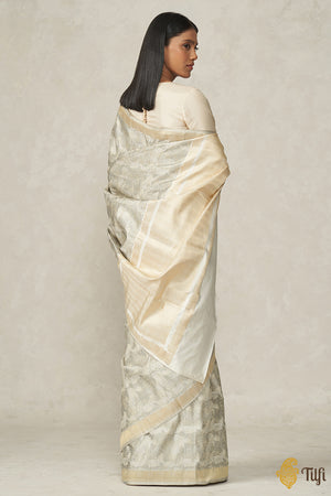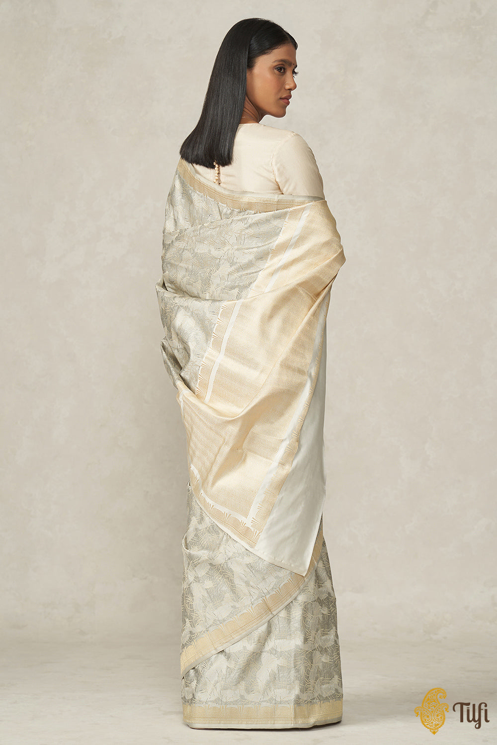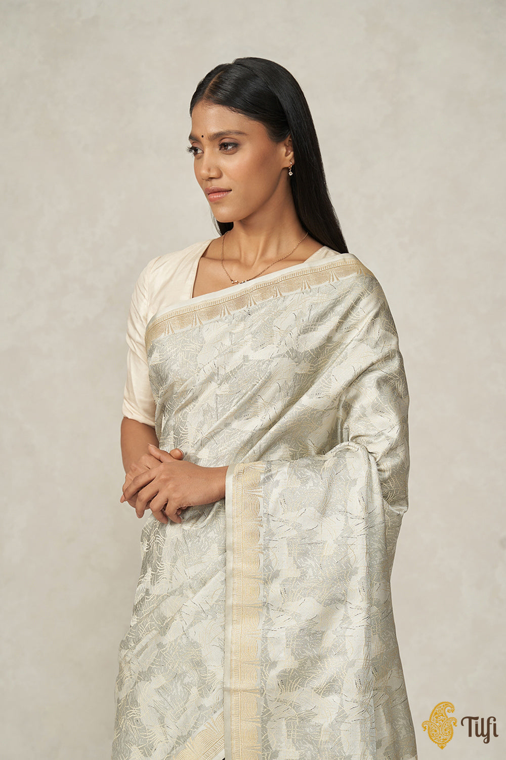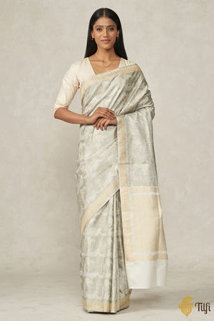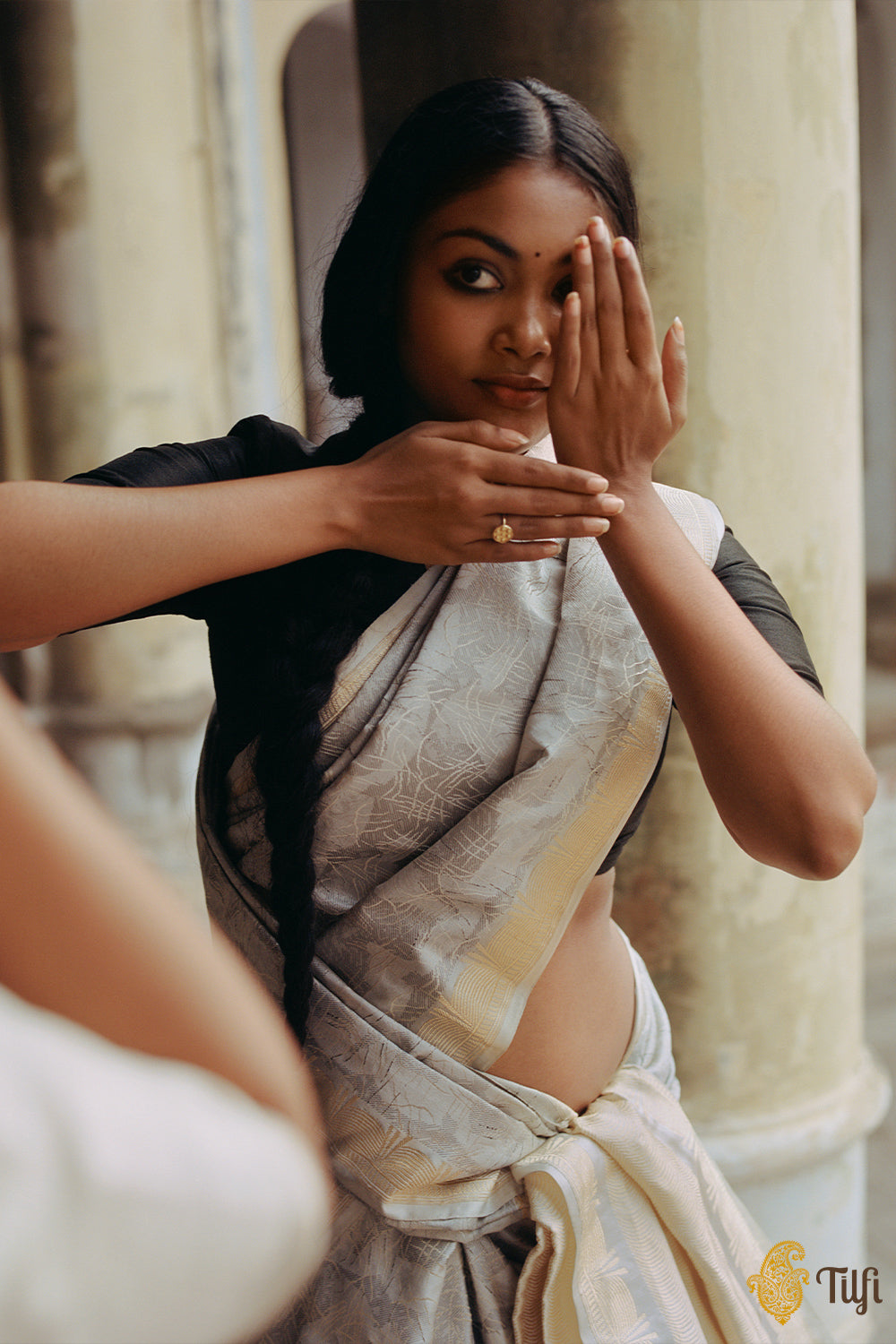 Inspired by the art of camouflage witnessed in nature, our Sunayana saree employs the Tanchoi weave in unexpected ways. Breaking free from the traditional regularity of pattern placements in Banarasi weaves, Sunayana plays with strokes and colours with a whimsical dose of zari for a handwoven modern classic.