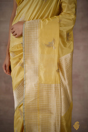 Speciality - Dainty sparrows, individually woven in zari and meenakari, adorn the body of this luxurious drape. Inspired by the Oriental art of scroll paintings, our weave transports the viewer to a tranquil scene. Peony Pavilion unfolds as a revelation, demanding dedicated attention to reveal the blooming delicacy of its poetic language.