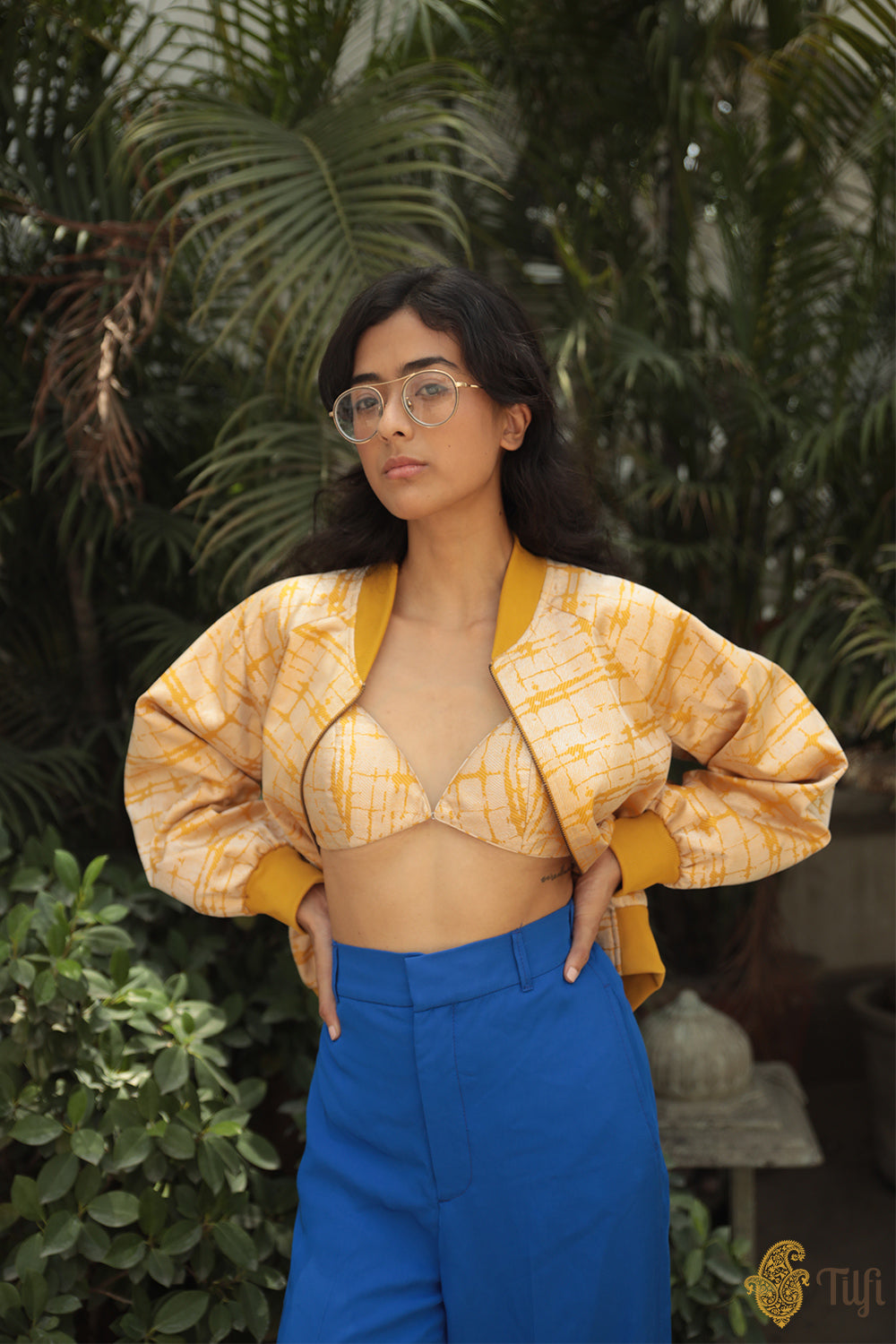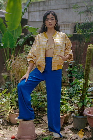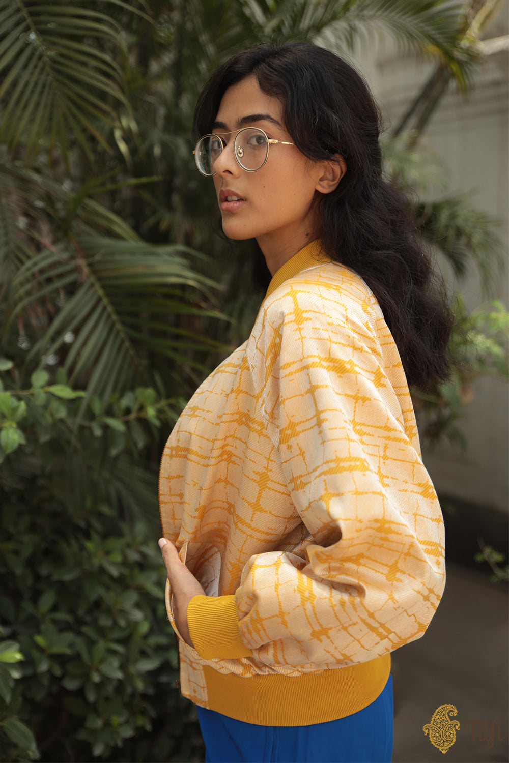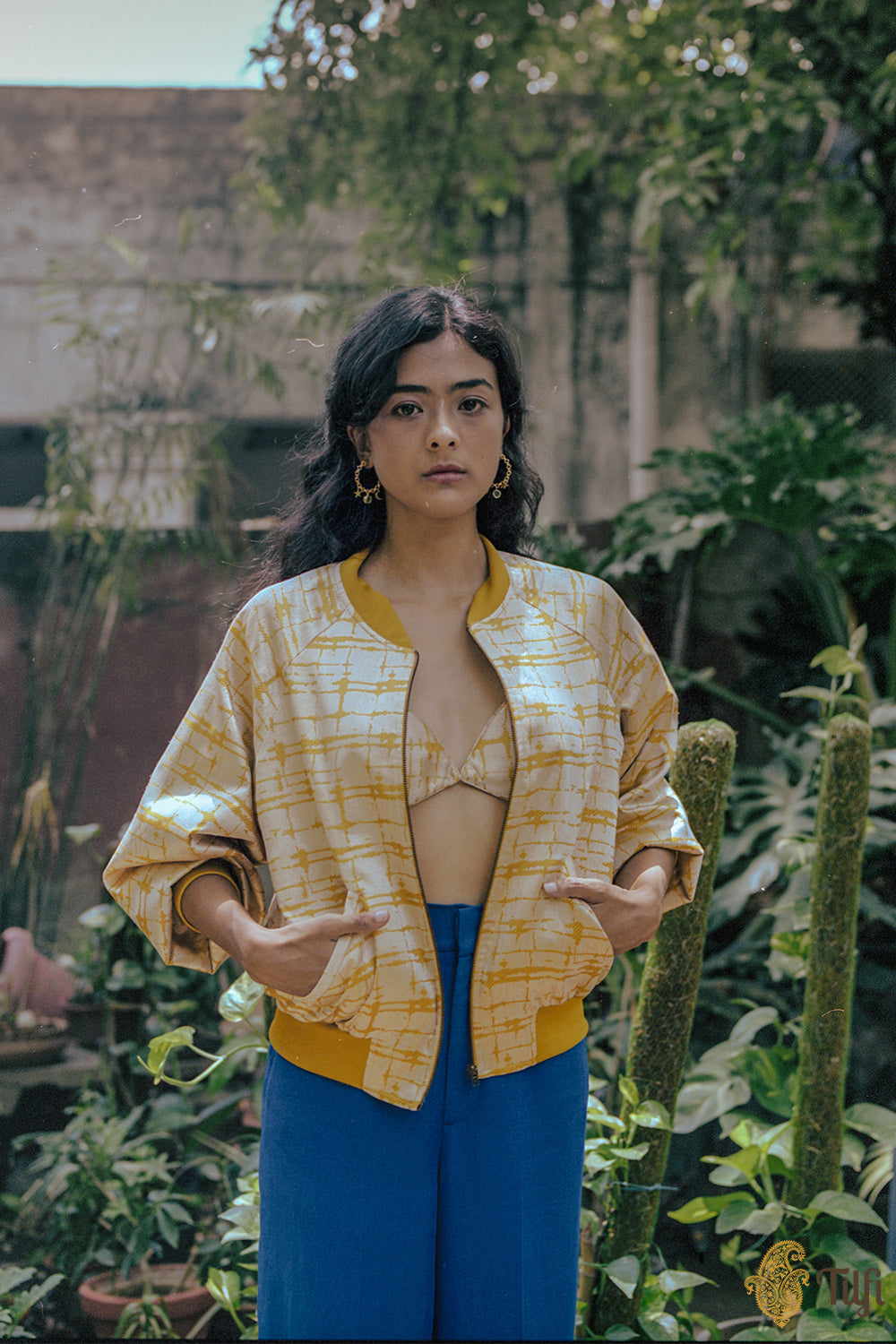 Made using the finest handwoven silk, our androgynous Bomber jacket presents a delightful play between relaxed silhouettes and traditional Banarasi weaves. Patterned with an abstract web woven in resham, this easy accent has all hallmarks of the classic - quintessential ribbed collars, front zip closure, effortless side-pockets and a generous fit.