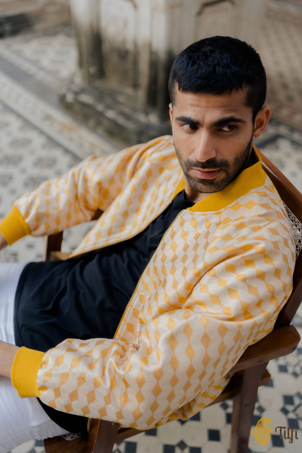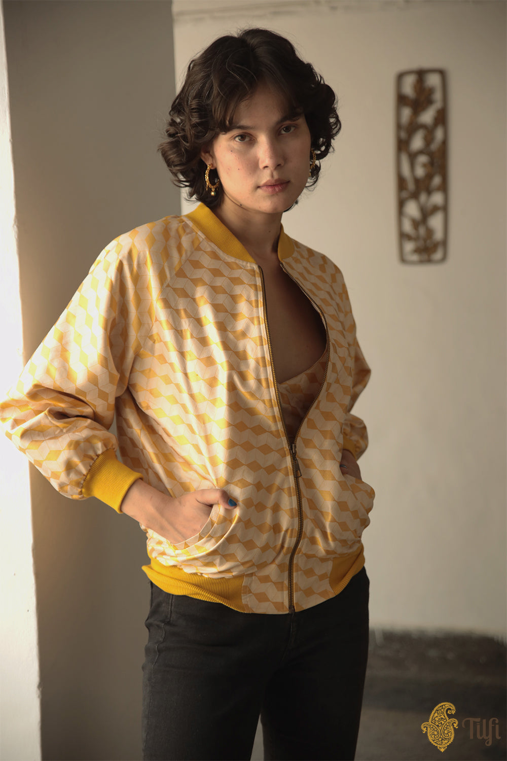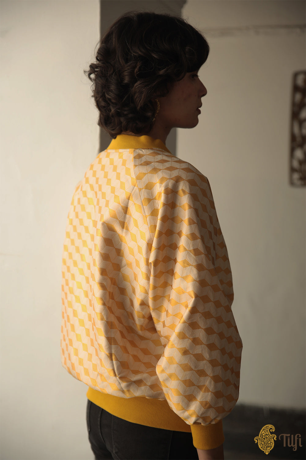 Made using the finest handwoven silk, our Bomber jacket presents a delightful play between relaxed silhouettes and traditional Banarasi weaves. Patterned with an abstract web of cubes woven in resham, this easy accent has all hallmarks of the classic - quintessential ribbed collars, front zip closure, effortless side-pockets and a generous fit.