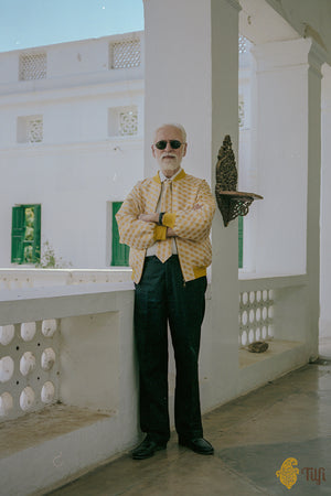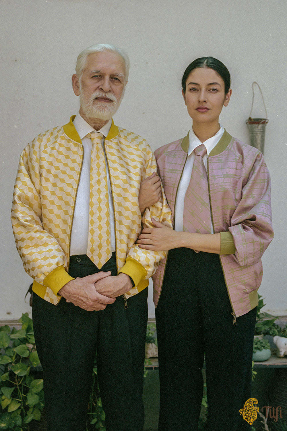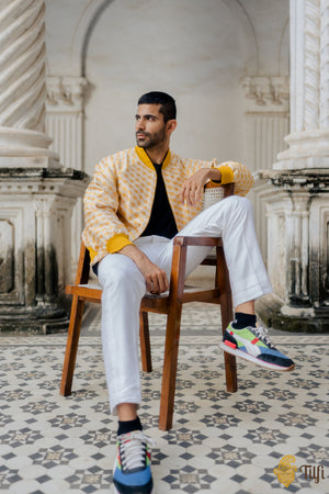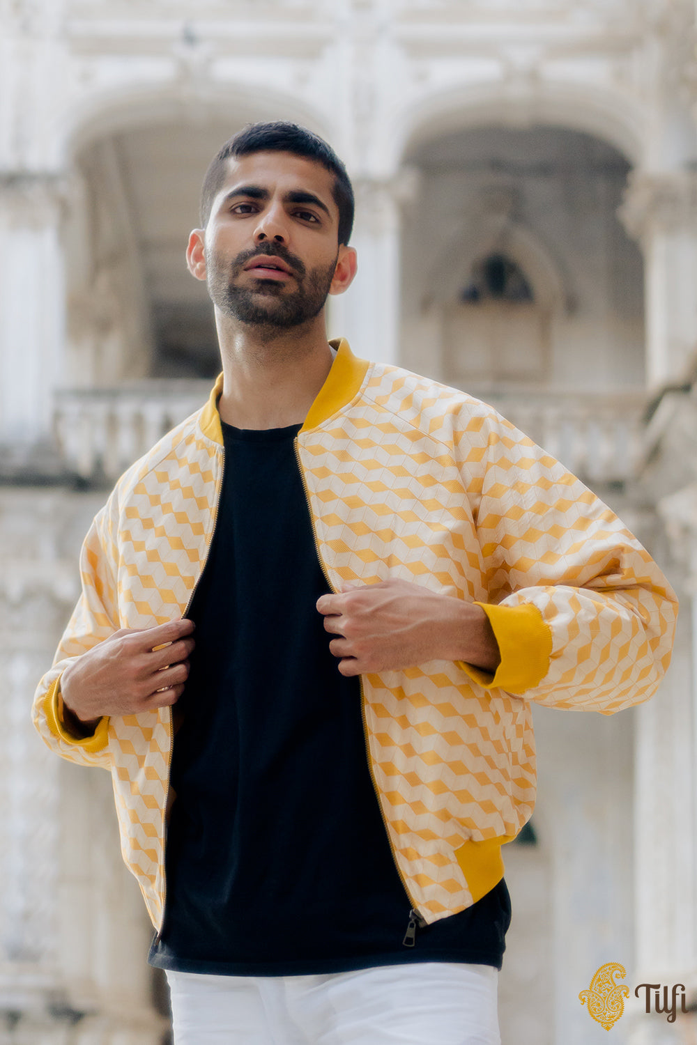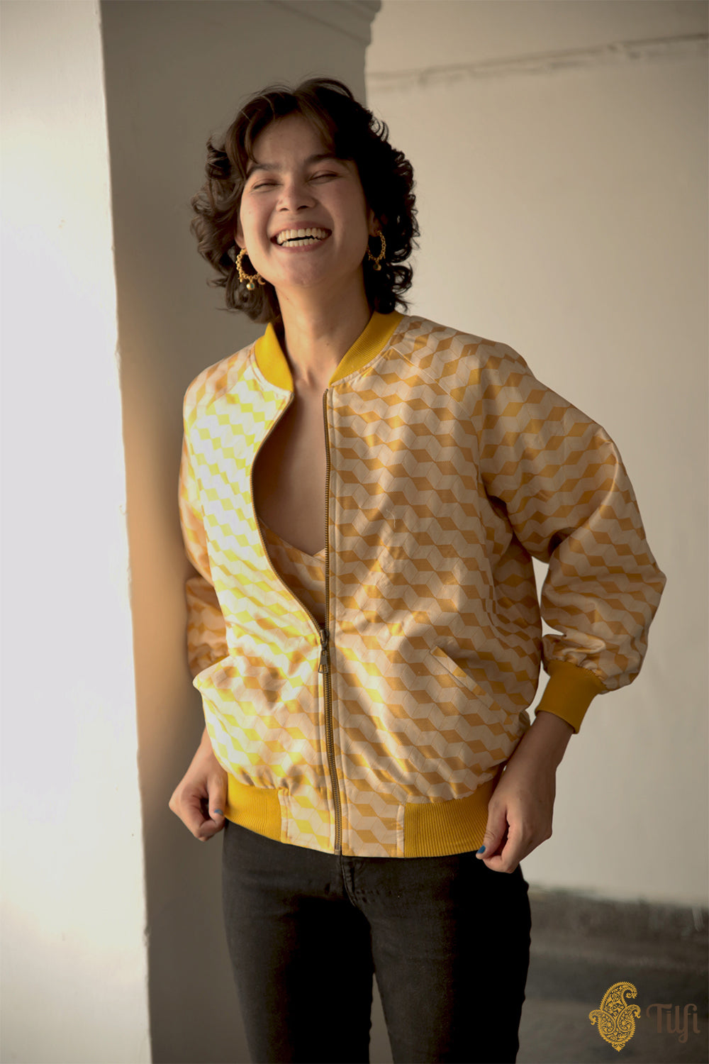 Made using the finest handwoven silk, our Bomber jacket presents a delightful play between relaxed silhouettes and traditional Banarasi weaves. Patterned with an abstract web of cubes woven in resham, this easy accent has all hallmarks of the classic - quintessential ribbed collars, front zip closure, effortless side-pockets and a generous fit.