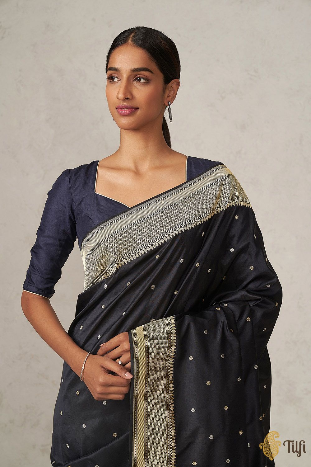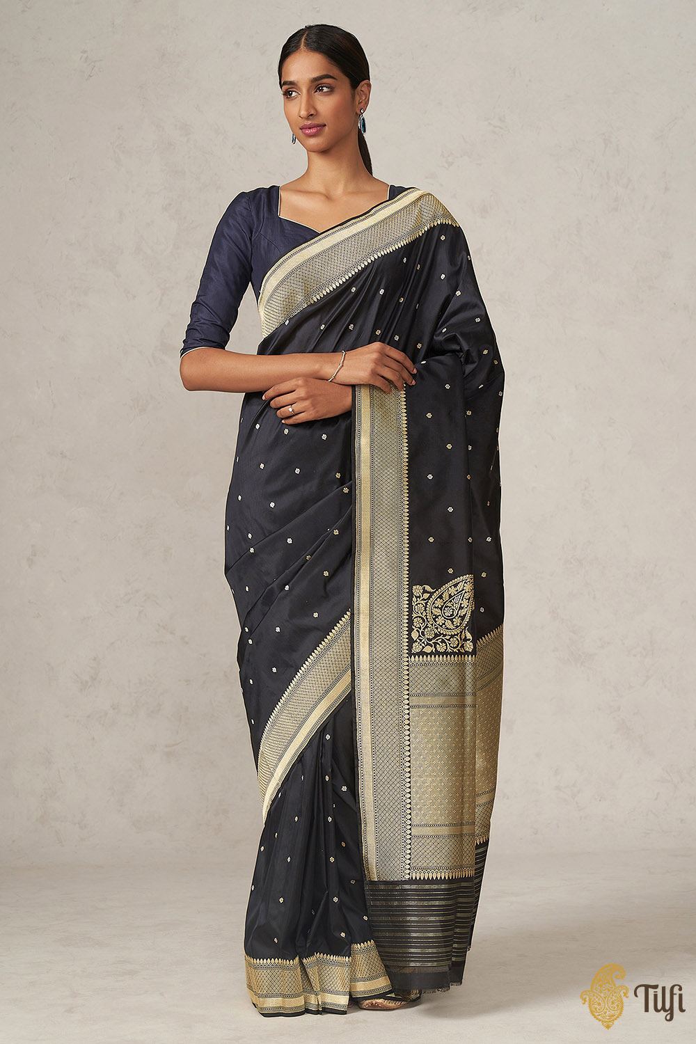 Alluring original Banarasi sarees, dupattas, lehengas, suits, blouses, and fabrics in black. Handwoven artistry in pure natural katan silk, georgette, tussar, cotton, and kora-organza fabrics.