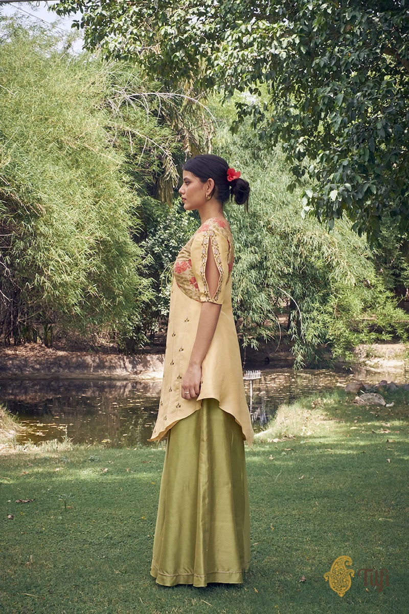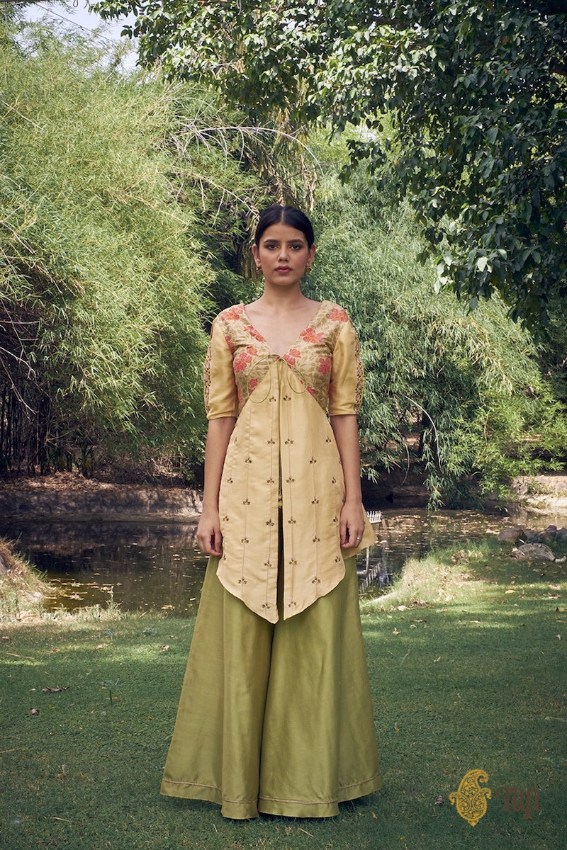 An enchanting collection of handloom Banarasi sarees, dupattas, lehengas, suits, blouses, and fabrics in green. Exquisitely woven textiles in pure natural katan silk, georgette, tussar, cotton, and kora-organza.