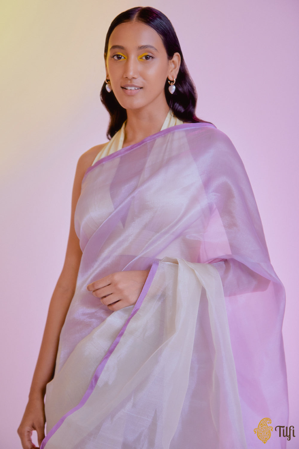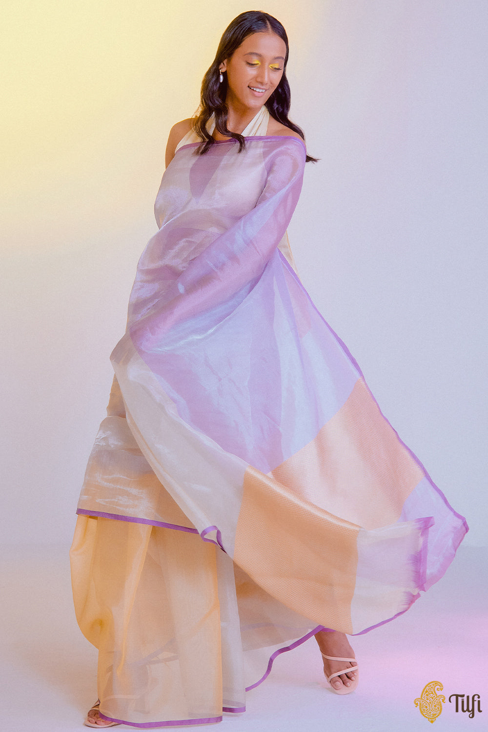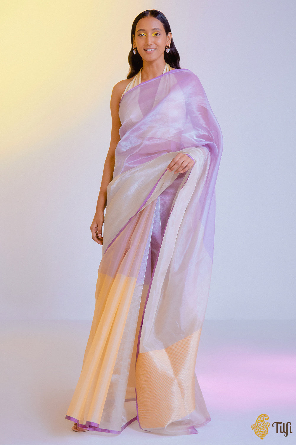 Speciality - This ethereal saree is a vibrant combination of pastel hues, woven in pure Kora silk tissue. Its diaphanous body has two-tones across halves using dyed warp yarns and a striking zari pallu woven in kadhua meenakari.