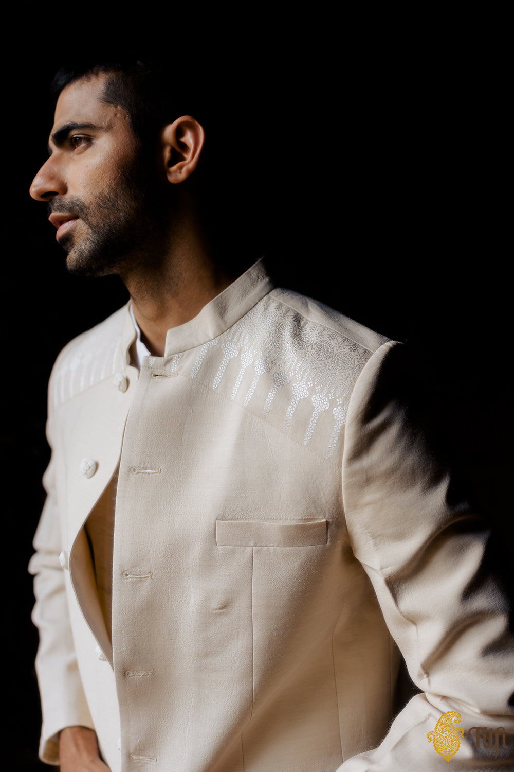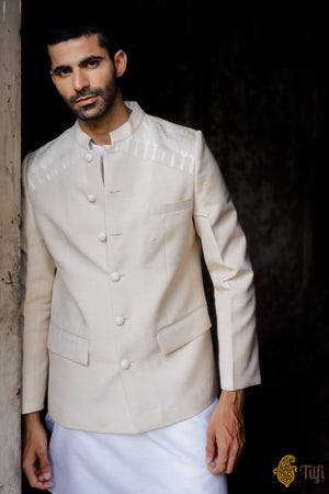A sleek beige full-sleeved pure Monga silk bandhgala subtly patterned with geometric and ceramic designs across the shoulders. Sharply tailored with clean cuts for a classic silhouette.