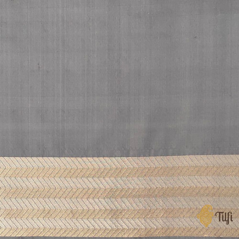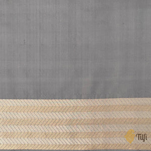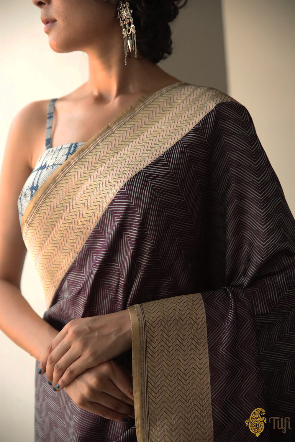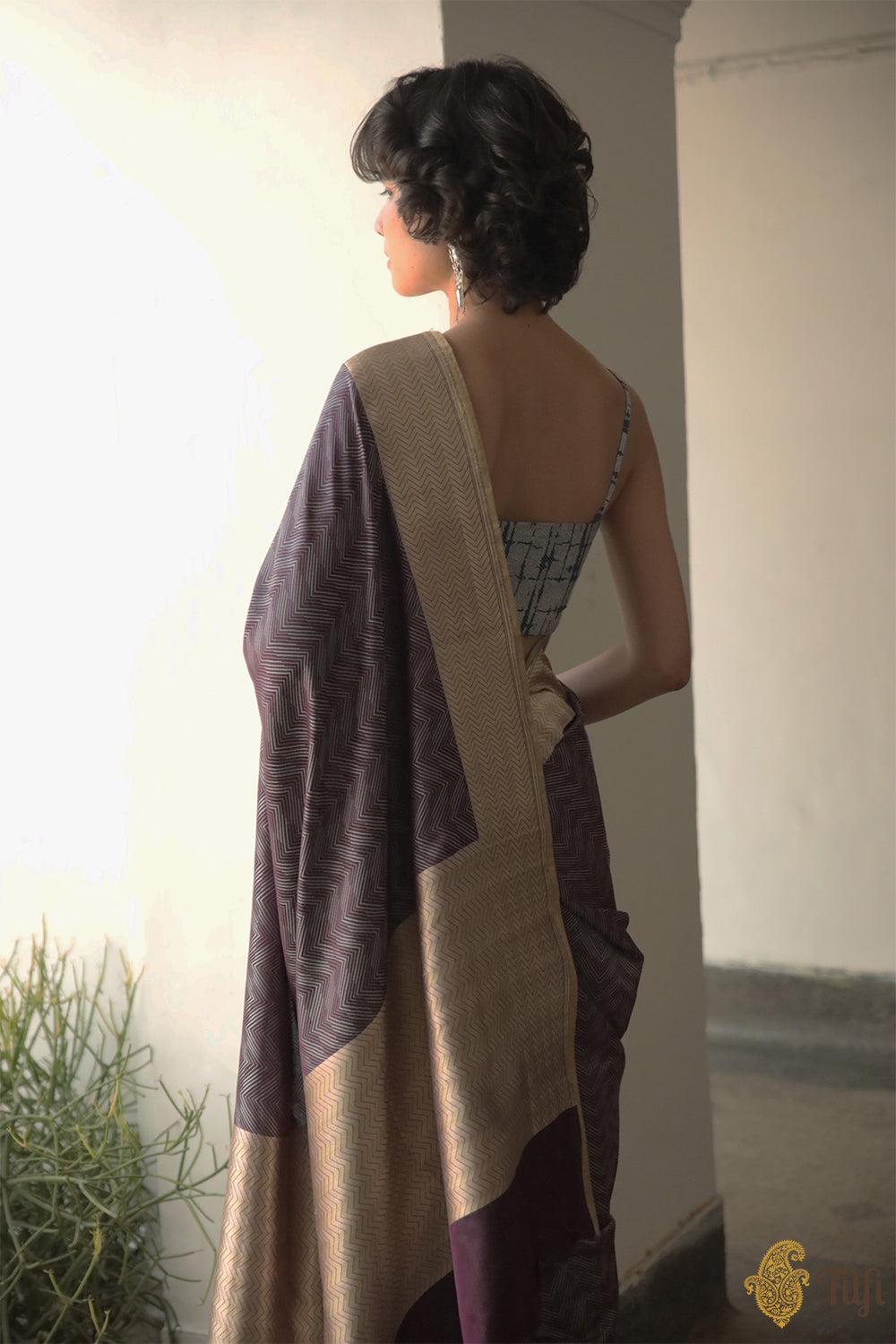 Inspired by the rich visual art of Bridget Riley, this contemporary classic plays on the forms of a chevron to stunning graphic effect. A delicately patterned body in resham and a glorious roopa sona zari kadhua border for a magnificent marriage of Optical Art and our textile heritage.