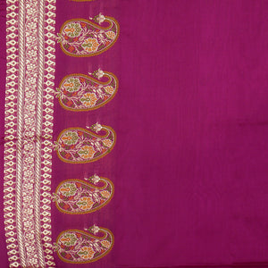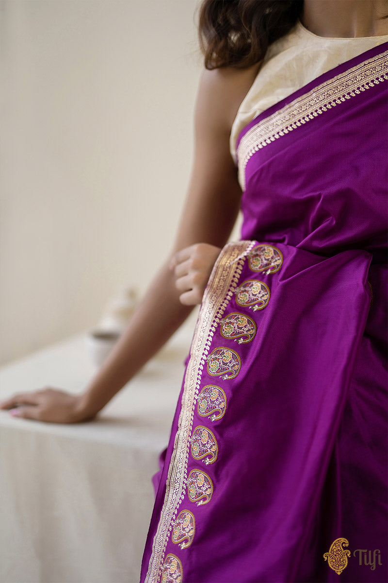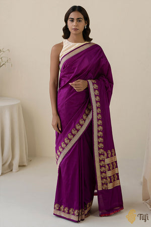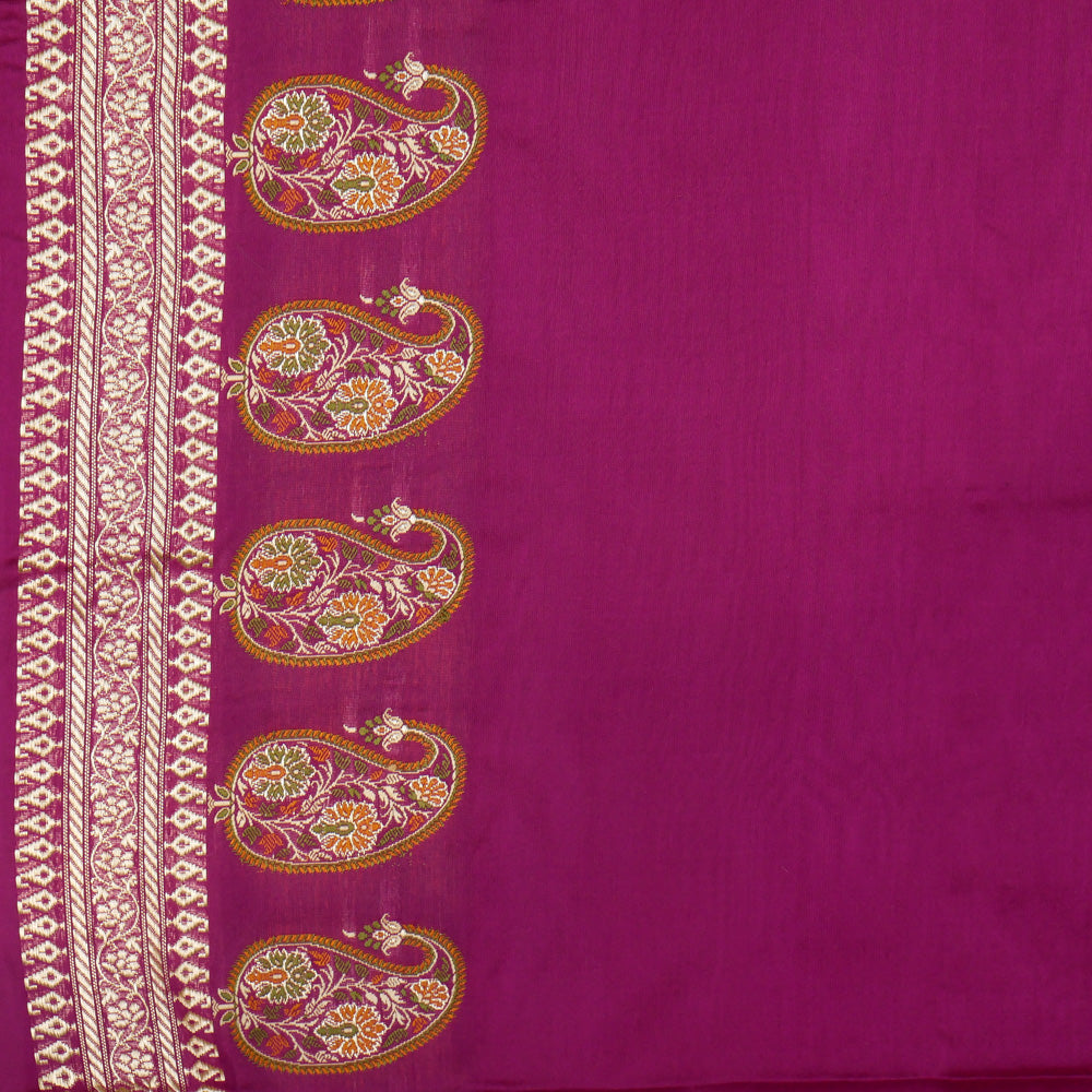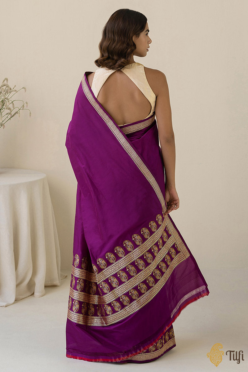 Exuding old-world charm, this is a timeless Banarasi masterwork. Recreated from a saree from our private collection, this is a lovingly handwoven katan silk classic with artistic kadhua weave paisley bootas along its border. Who wouldn't be captivated?