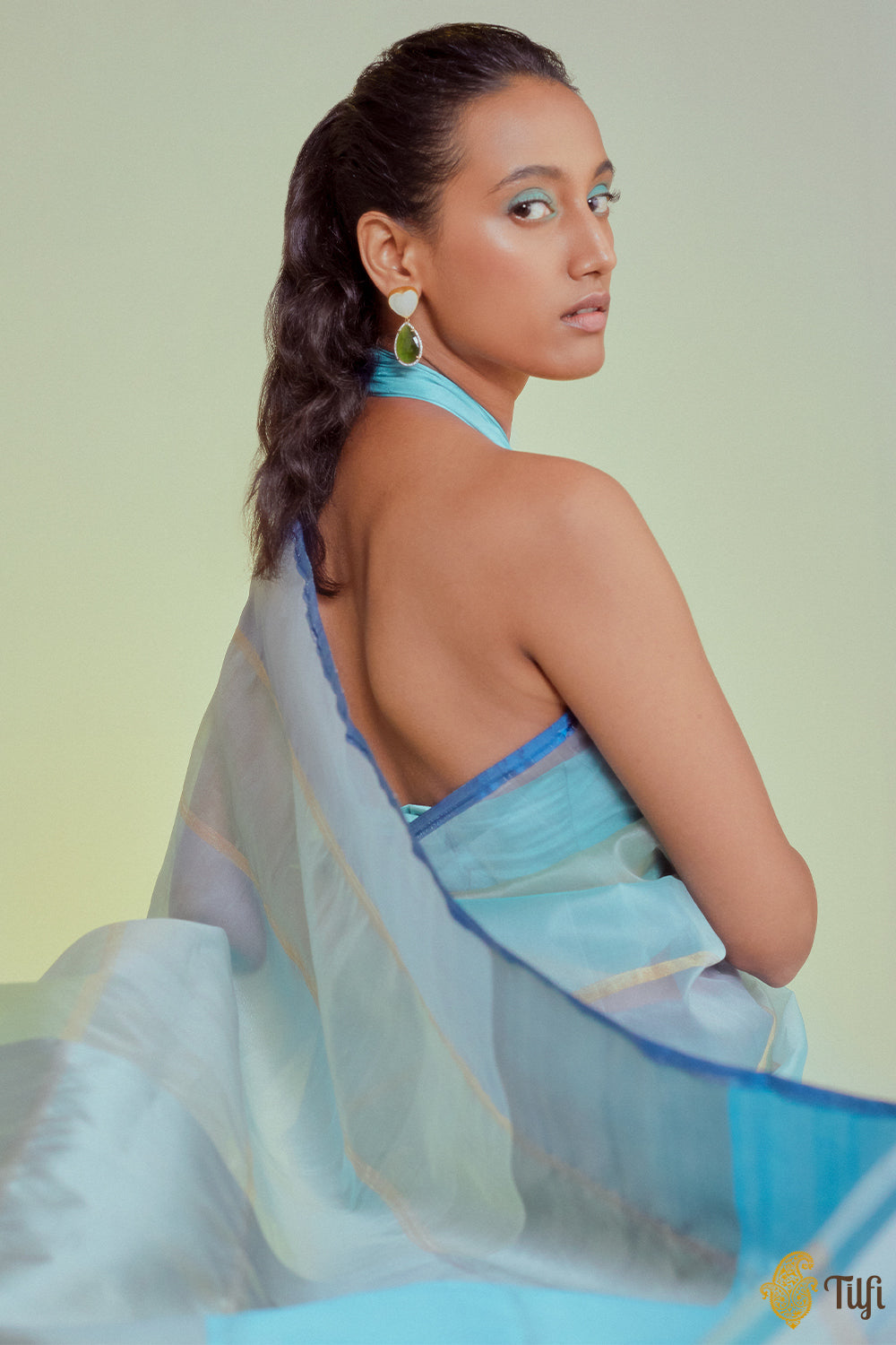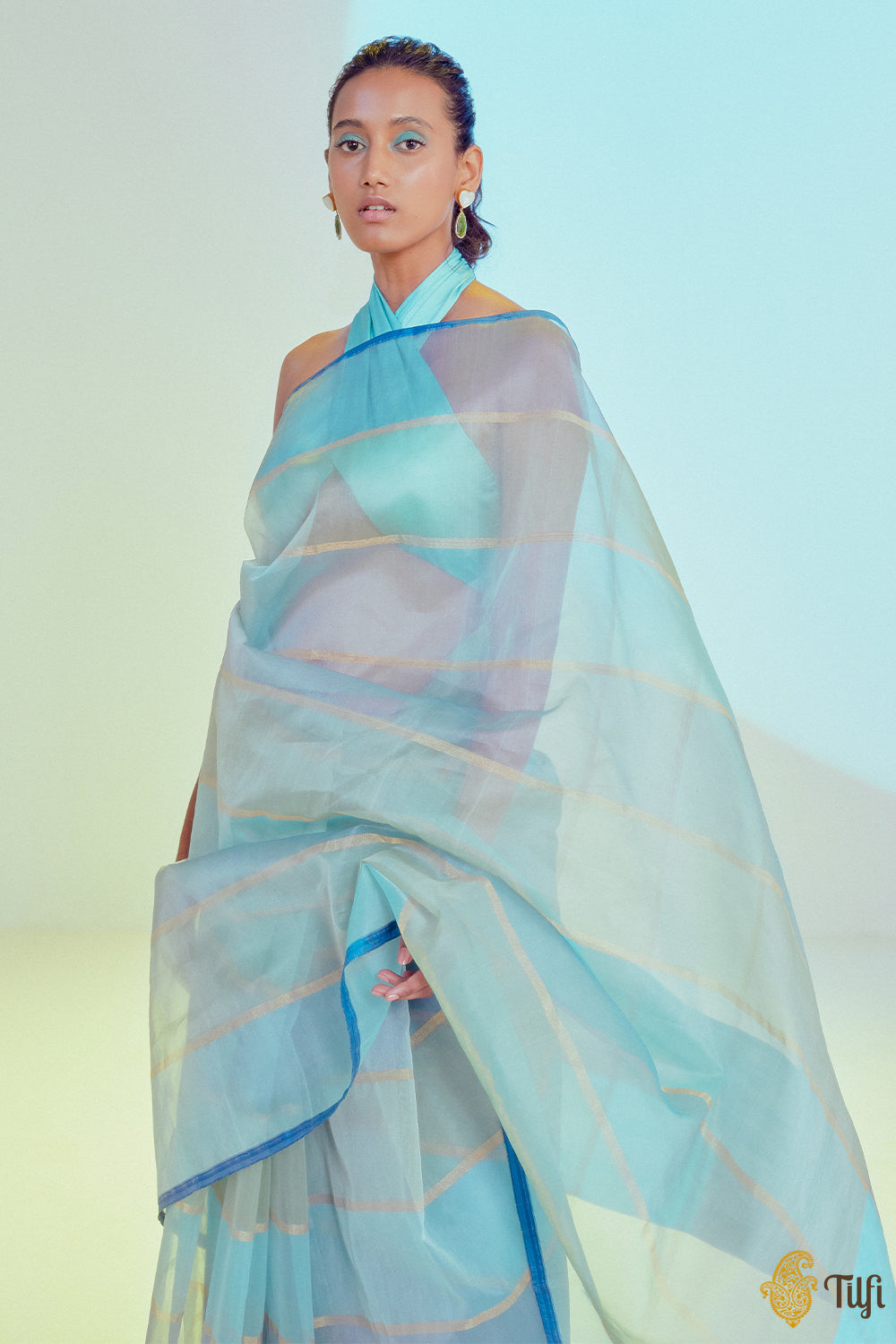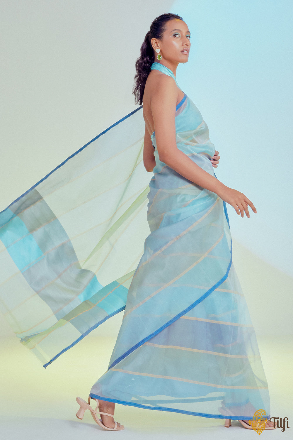 A joyful interplay of soft colours and zari. Sheer and light, this exquisite piece brings subtly harmonised colours with the drama of zari stripes for a beautiful expression of assertive femininity.