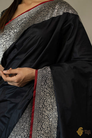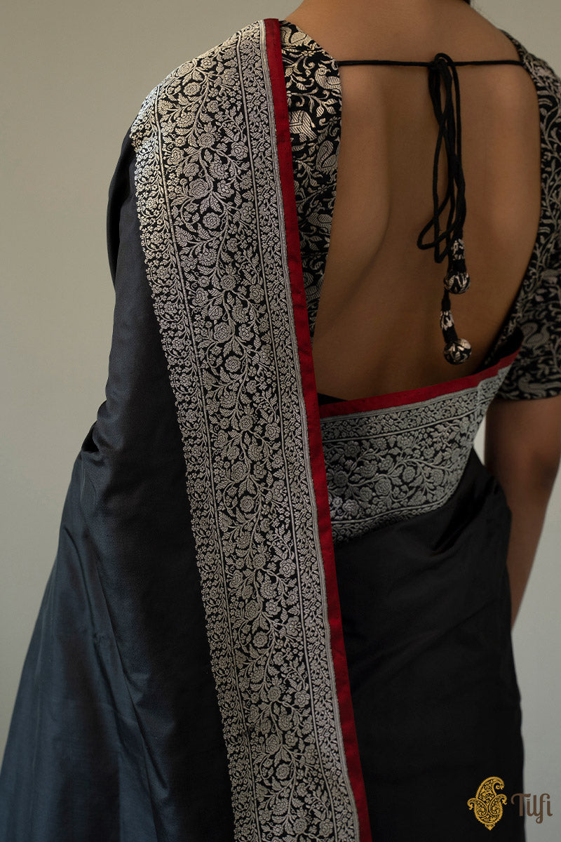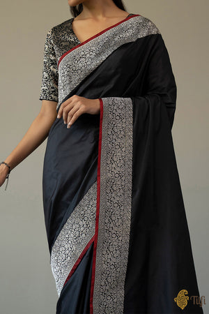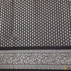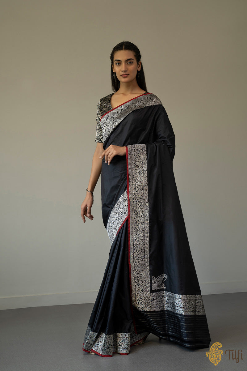 Enchanting like a new moon night, this is a ravishing katan silk saree. With an intricate silver zari border and a magnificent koniya aanchal on a bed of black like the night sky, this saree will take your breath away!