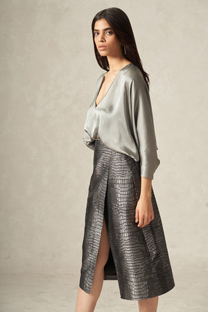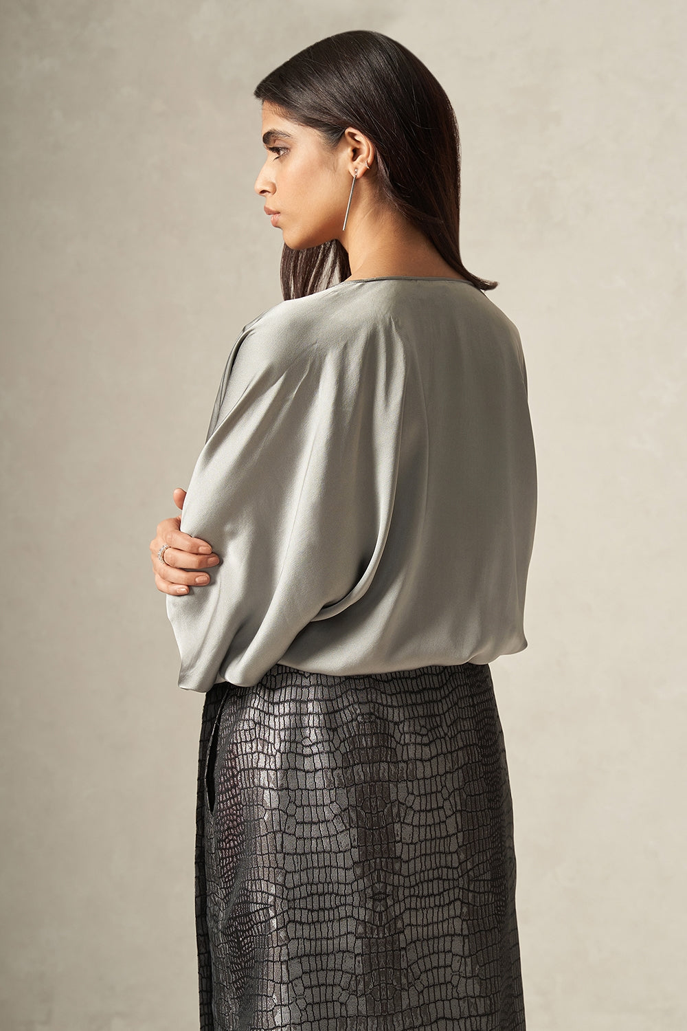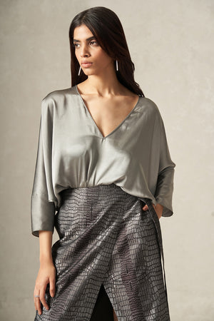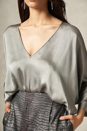 This loose-fitting silken v-neck top in a sleek shade of ash grey features an elasticated hem and quarter-length sleeves. Comfortable and delicate, the pure satin silk fabric brings about a gentle and alluring gleam.