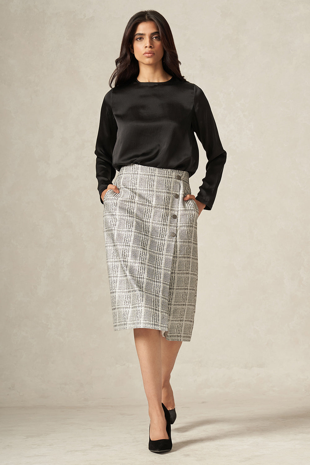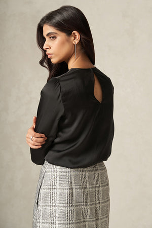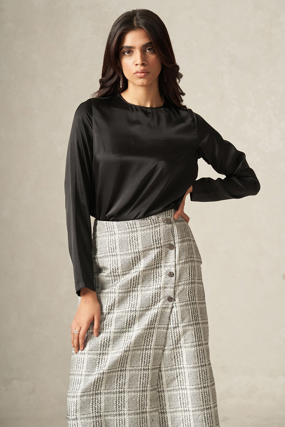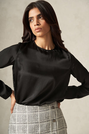Soft and simple, this pure satin silk top has a round jewel neckline with full sleeves in a classic shade of black. The top has a semi-loose fitting and an alluring lustre in the fabric.