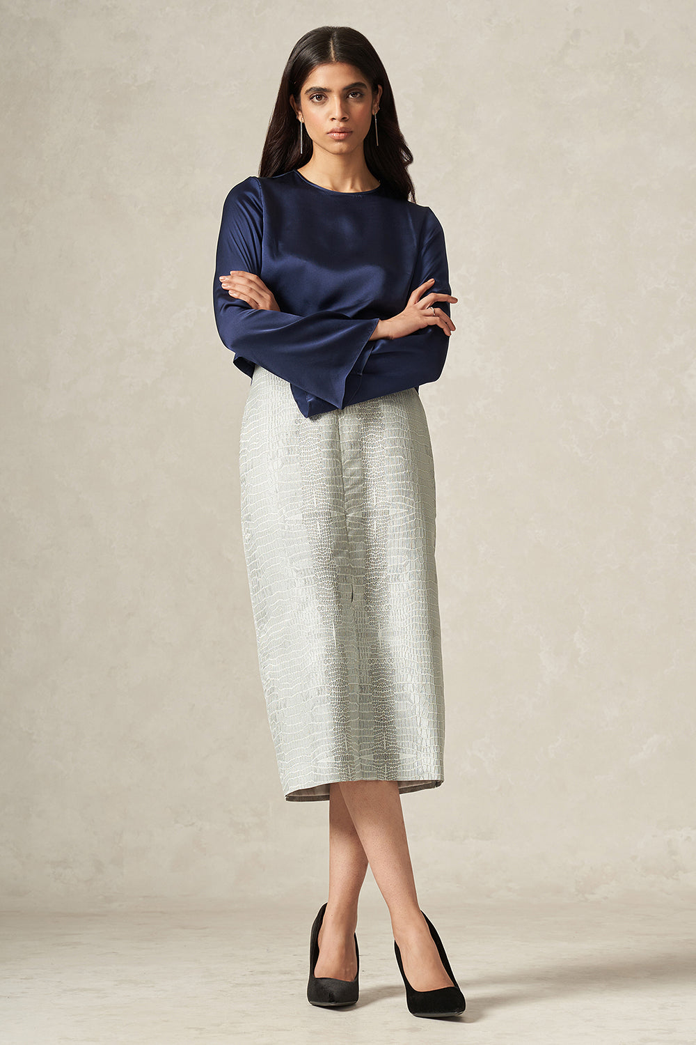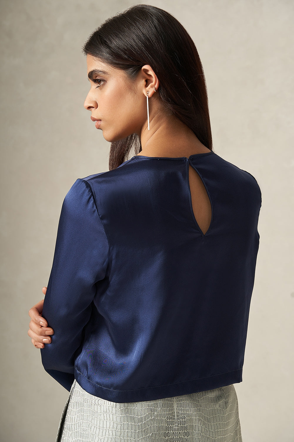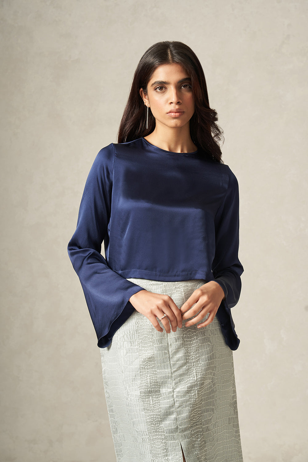 Soft and comfortable, this pure satin silk top has a round jewel neckline with bell sleeves for a sleek and feminine silhouette. The top has a flowy fit while maintaining a contemporary structured flare.