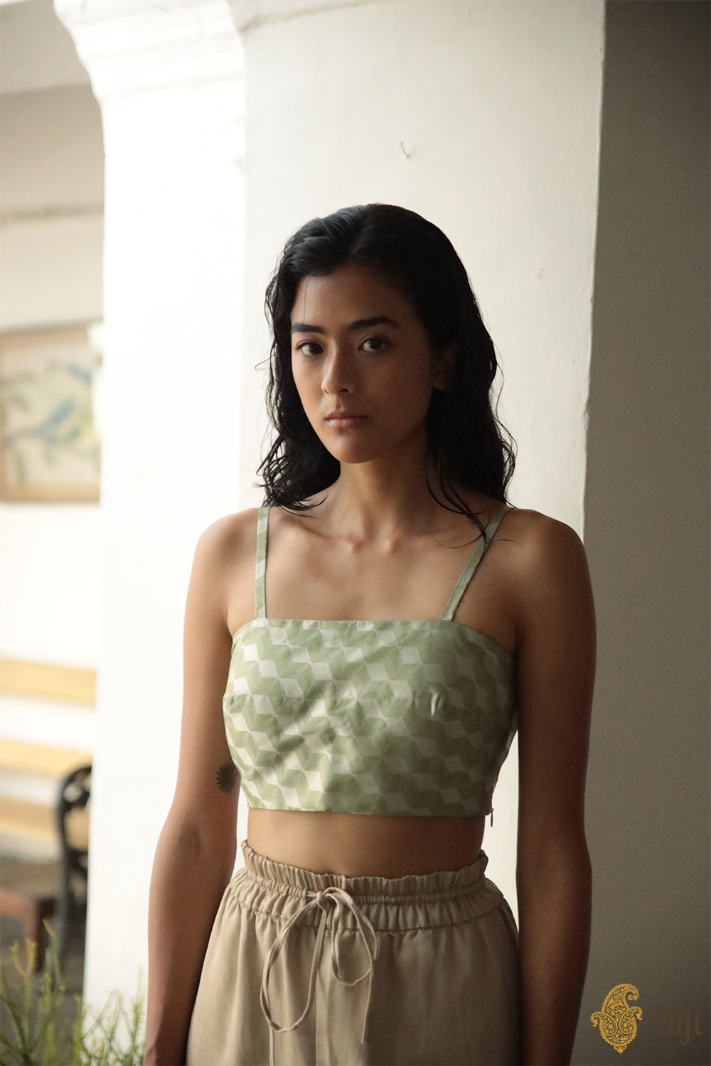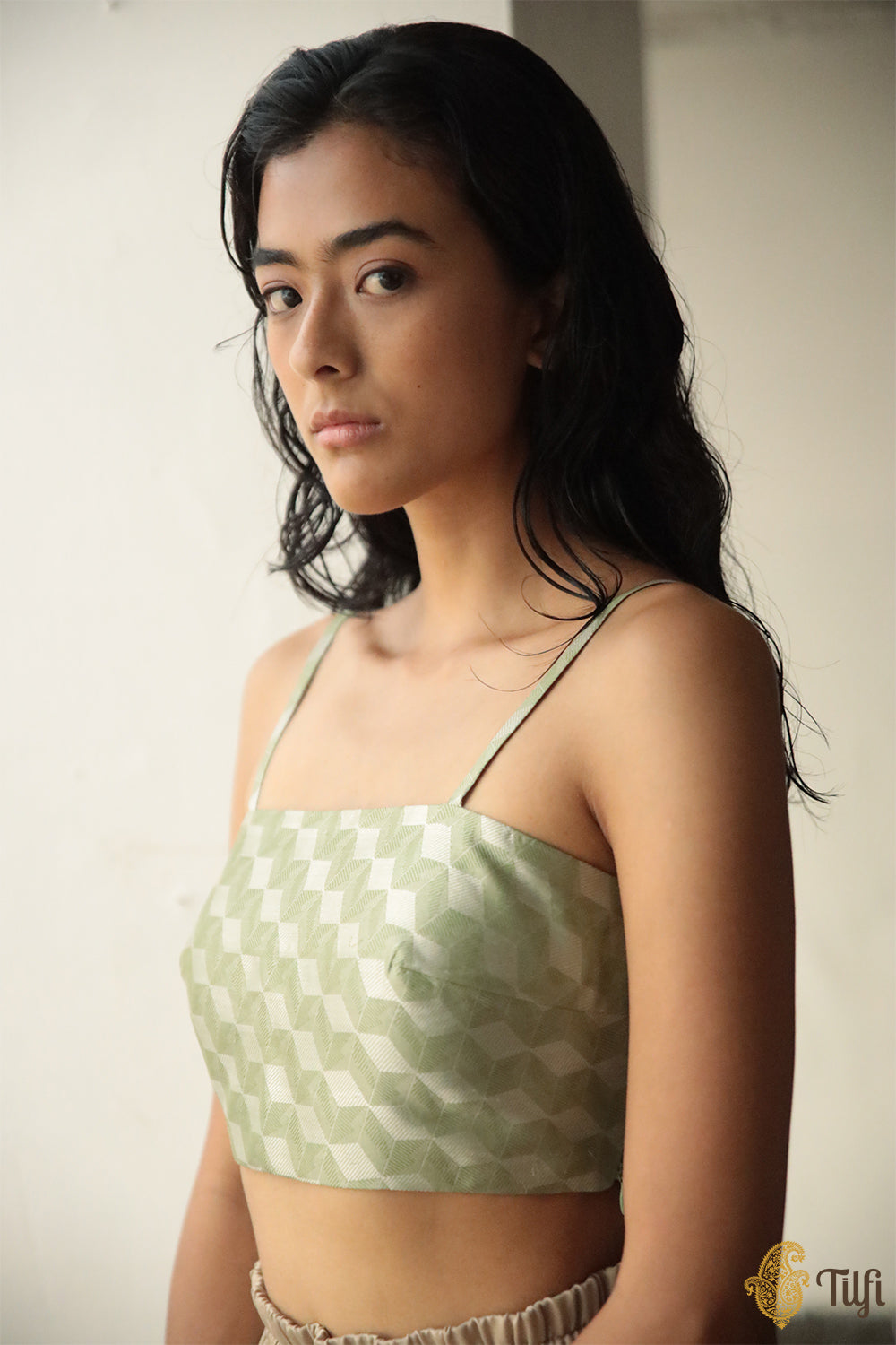 An effortlessly fabulous companion channeling retro glamour. Made using handwoven katan silk and patterned with an abstract web of cubes woven in resham, this is a versatile accent. Pair it with our bomber jacket, as a blouse with a saree or as is.