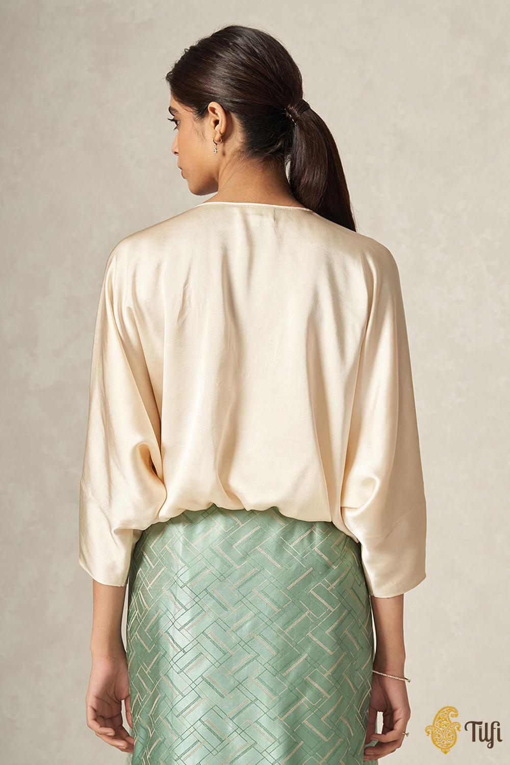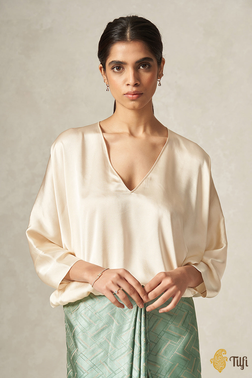This loose-fitting silken v-neck blouse features an elasticated hem and quarter-length sleeves. Comfortable and delicate, the pure satin silk fabric brings about a subtle gleam.