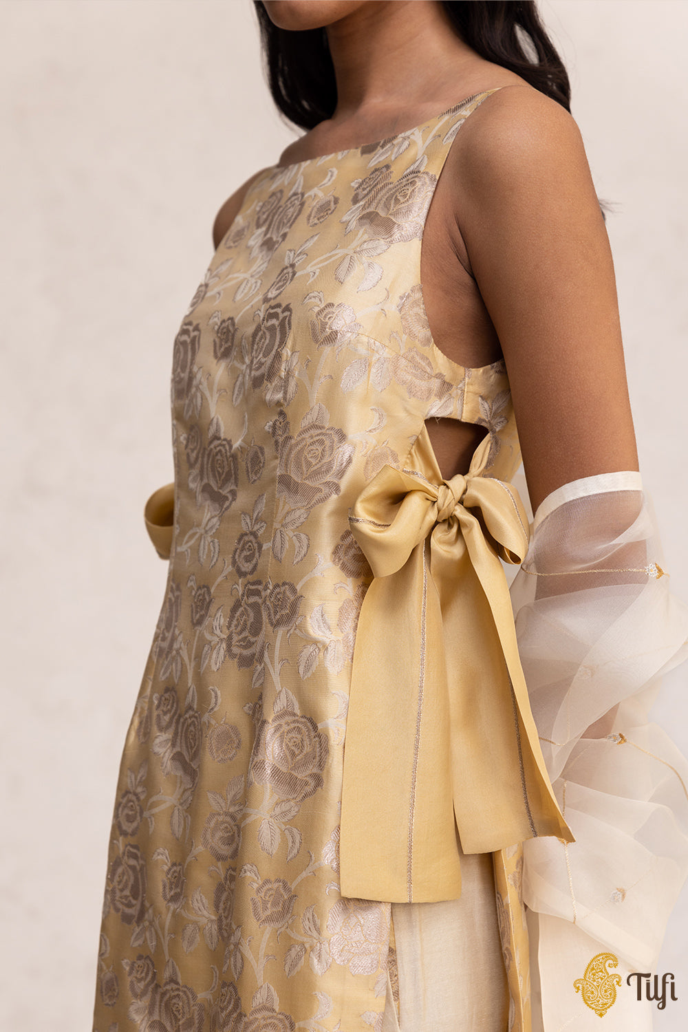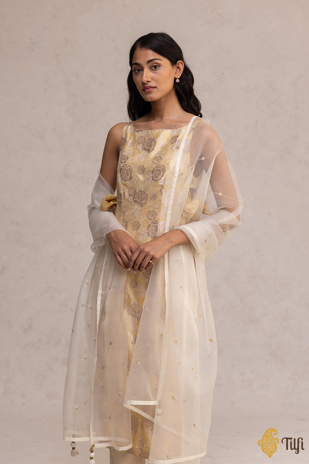 A beautifully striking collection of yellow Banarasi sarees, dupattas, lehengas, suits, blouses and fabrics, handwoven in pure katan silk, georgette, tussar, cotton, and kora-organza.