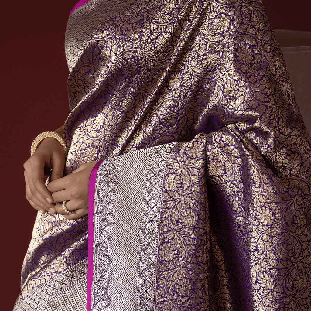 Zari Vasketis a Banarasi weaving technique that has been passed down through generations. It involves the meticulous use of a supplemental zari weft throughout the body, which leaves minimal float on the back of the fabric. Textiles woven in this weaving style are adorned with all-over zari, which gives them a rich and lustrous appearance.