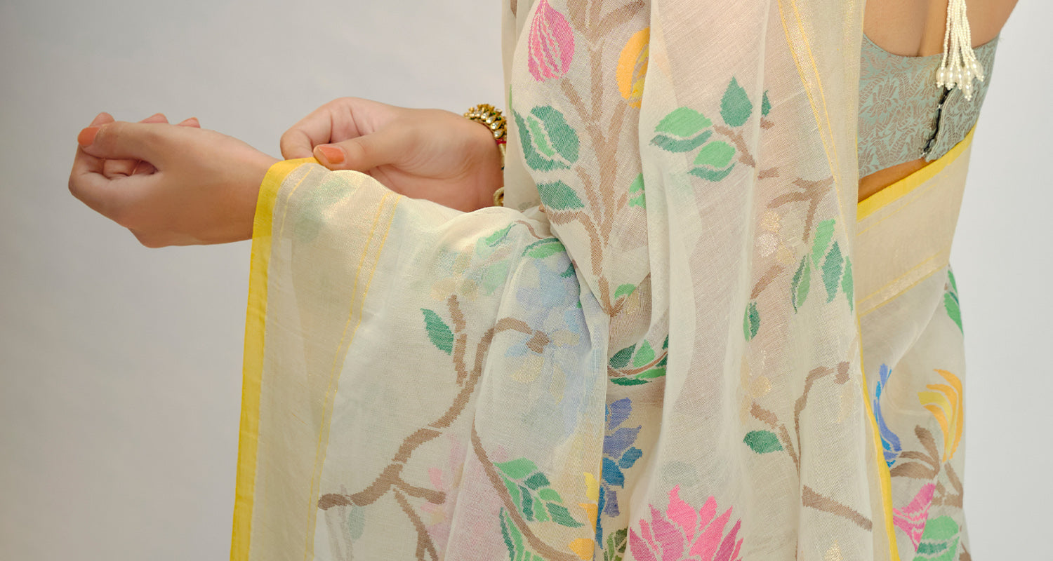 Jamdani is a weaving technique of fine loom-embroidery that traces its roots to the region of Dhaka in Bangladesh. Known for its extremely fine quality and ethereal appeal, Jamdani weaving comprises a discontinuous extra weft yarn that is woven into the threads of the warp. Most often, the patterns are made using heavier threads on a lighter, translucent fabric such as handwoven cotton or muslin. The painstaking process of patterning results in a light and comfortable textile with a reverse that is nearly indistinguishable from the front and has no float.