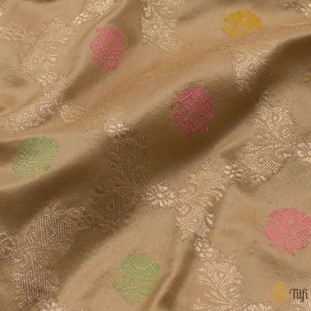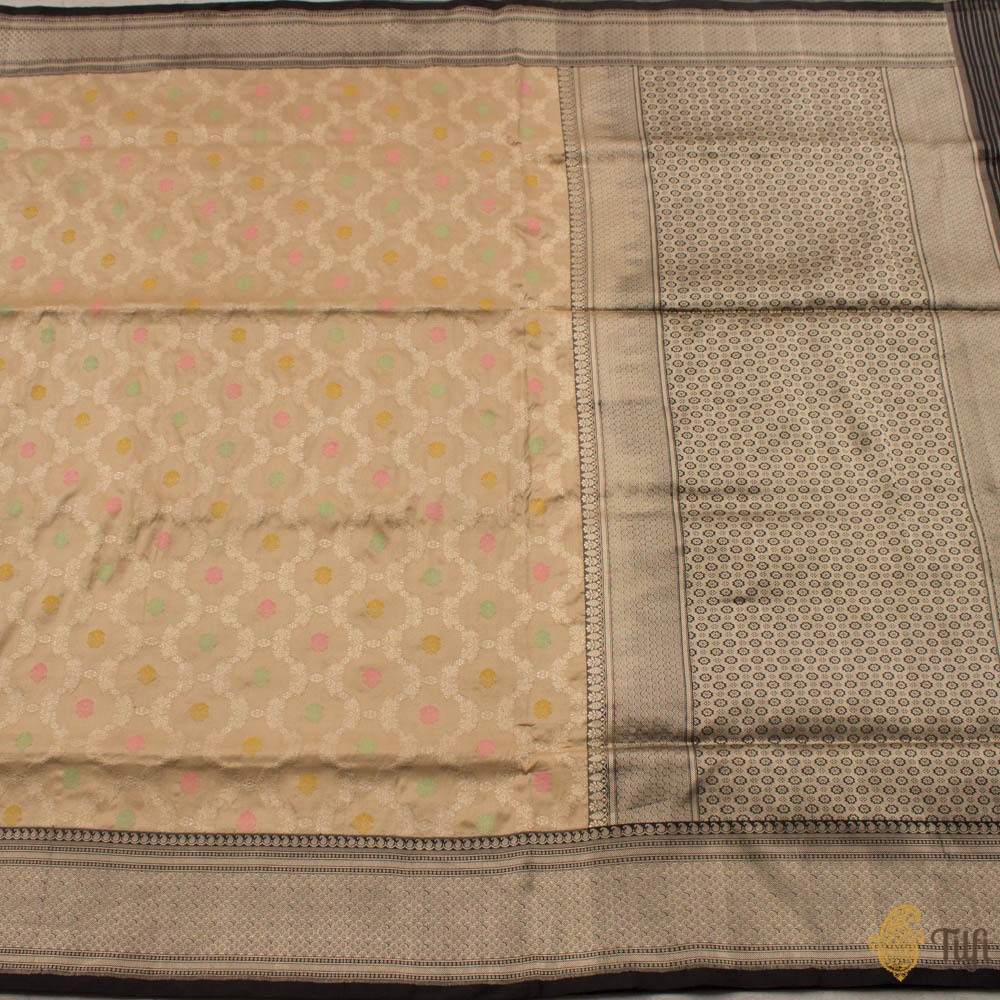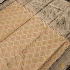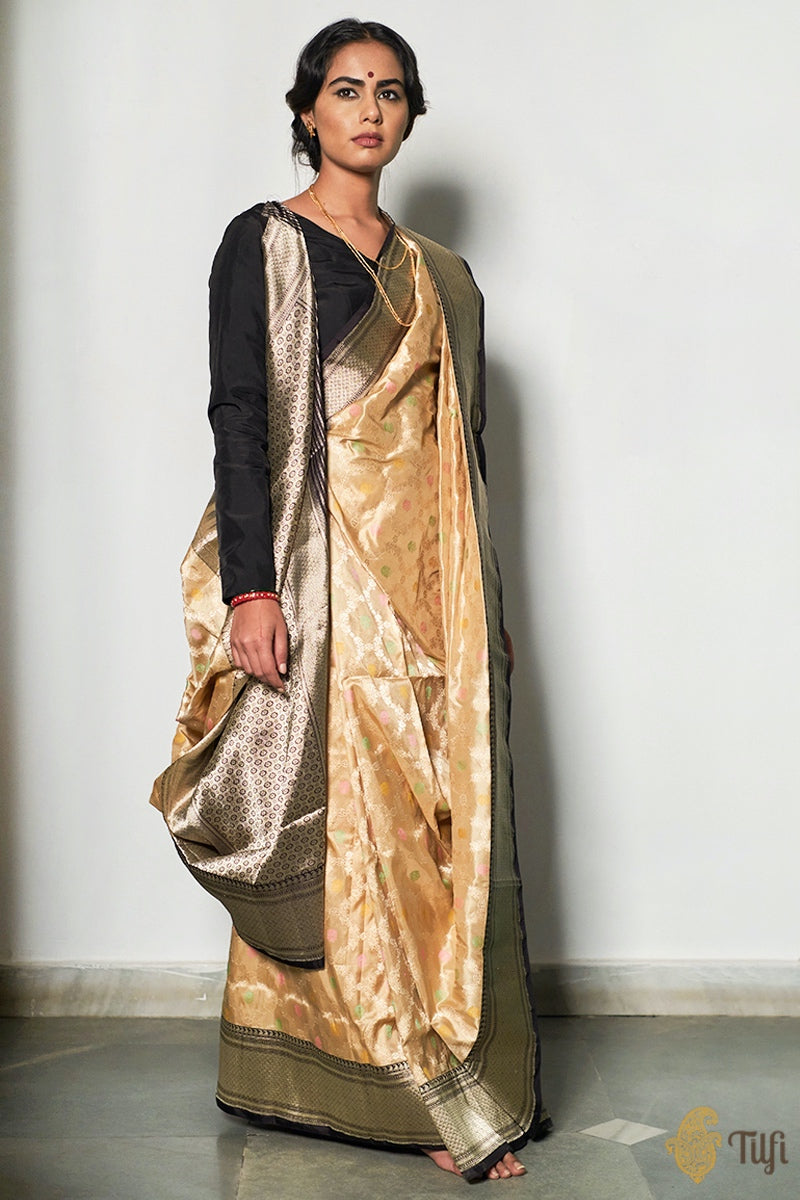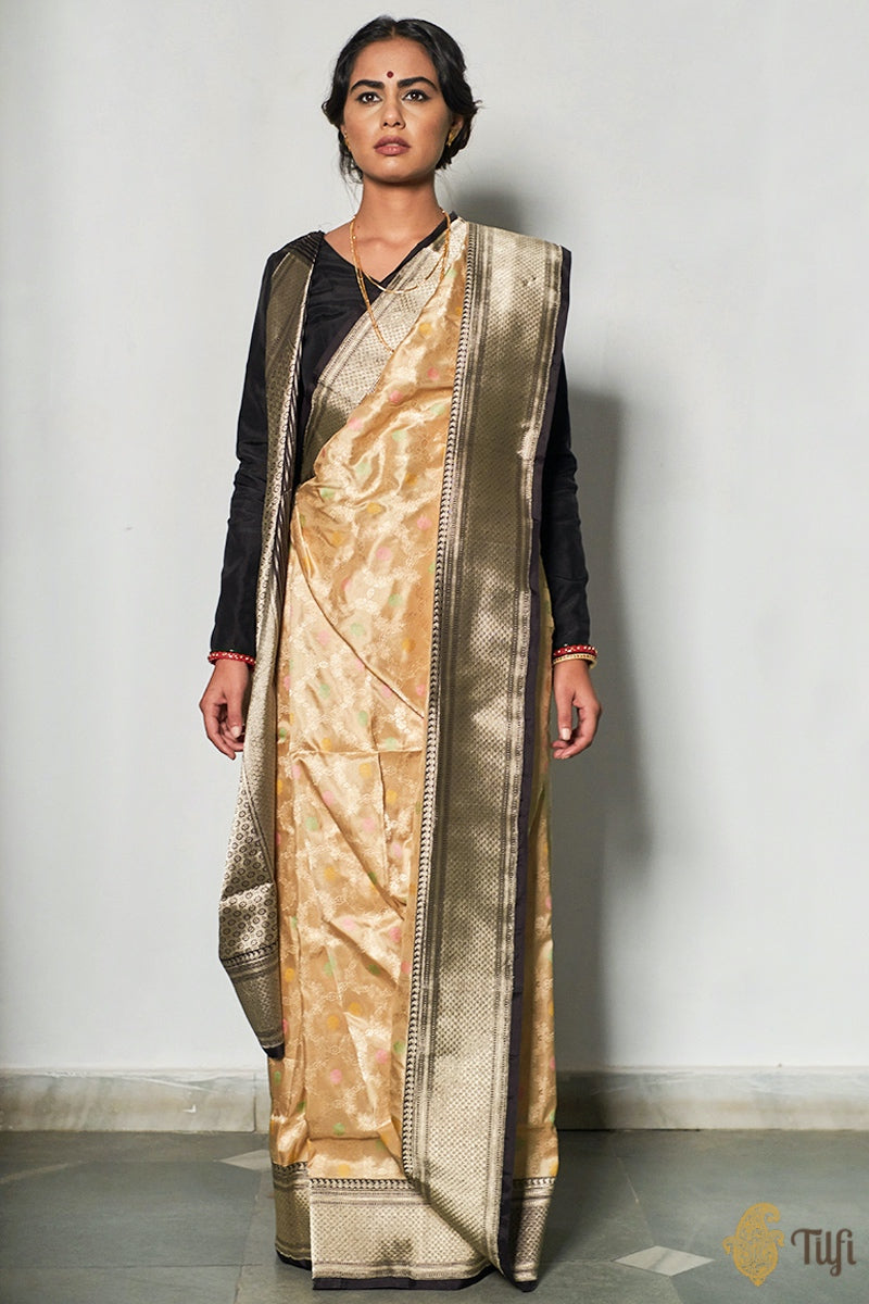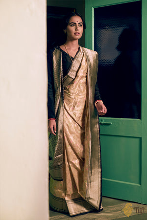 This gorgeous saree with its vintage Banarasi inspirations and exquisite kadwa weave can be handed down through generations! A quintessential kadhua lattice with elaborate use of zari, dainty meenakari floral motifs and a beautiful kadiyal border - classic Banarasi opulence!