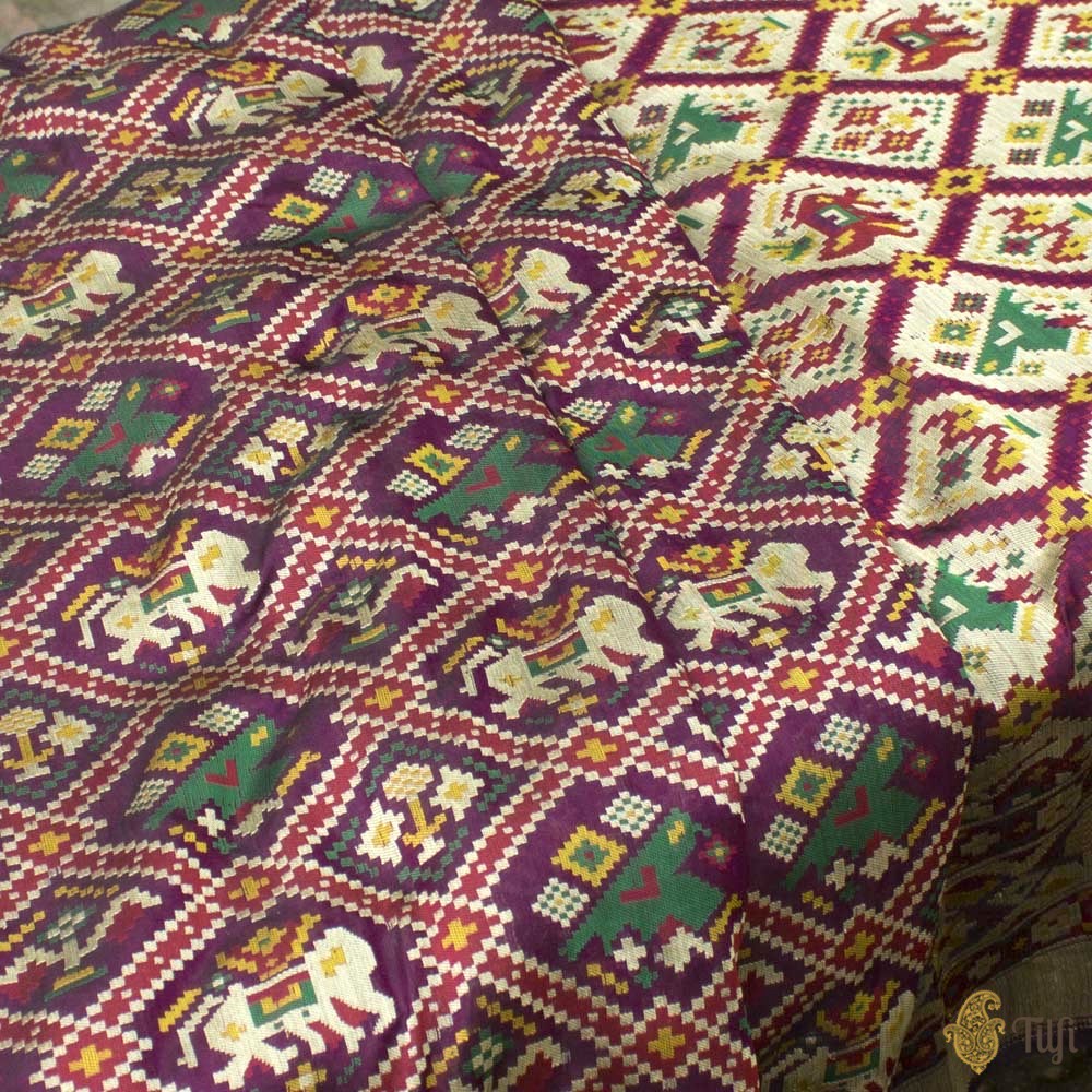 Technique - A Gujarati Patola design created using a classic handwoven Banarasi Meenakari art passed down through generations. Meenakari involves the painstaking addition of supplementary coloured resham threads during the hand-weaving process.