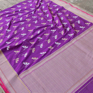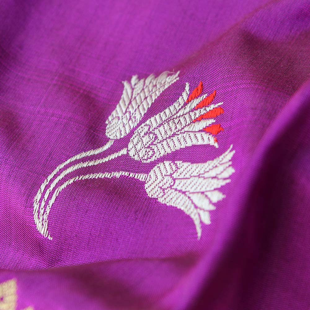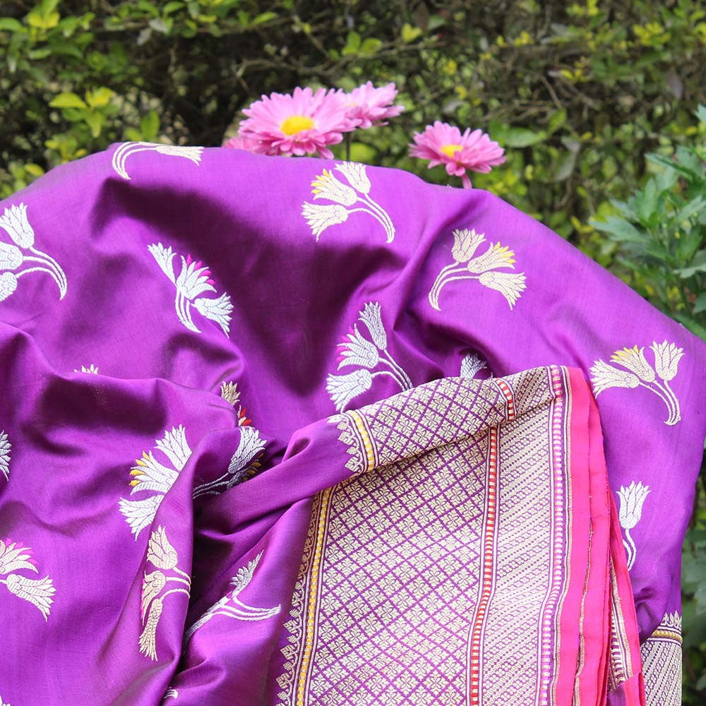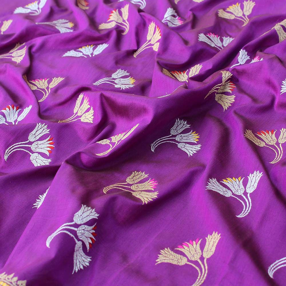 Technique - An enduring Kadwa weave and fine Meenakari technique. The elaborate and laborious Kadwa (Kadhua) technique involves hand-weaving each motif separately. It takes longer on the handloom, but makes a more robust pattern, which stands out on the fabric.