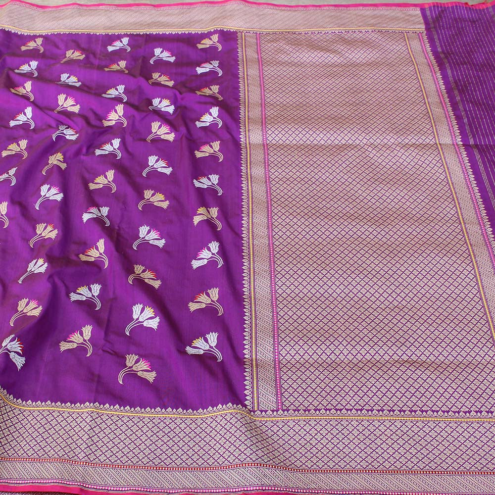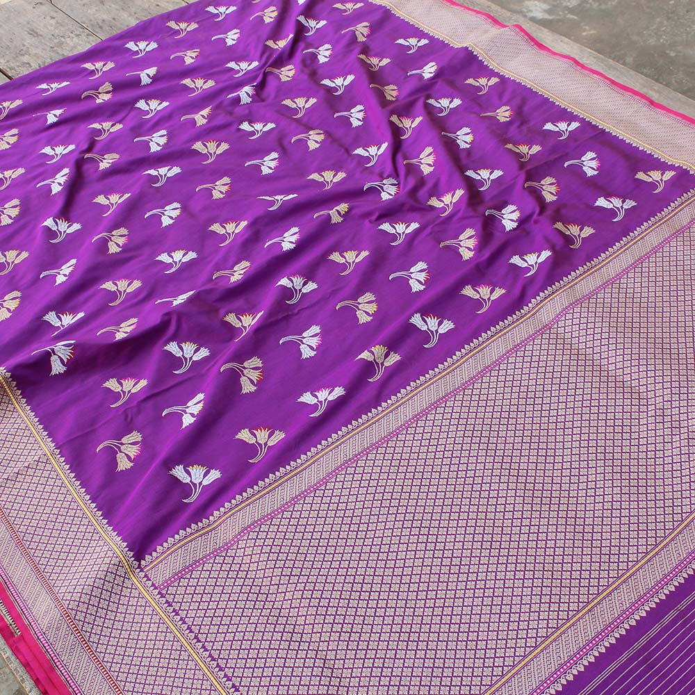 Speciality - A dainty floral booti pattern with intricate borders and aanchal and a beautiful, elaborate blouse to go. A timeless, luxurious and quintessential Banarasi.