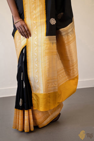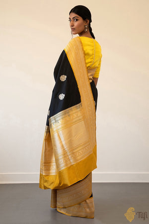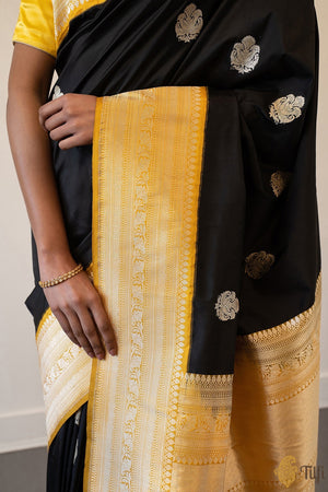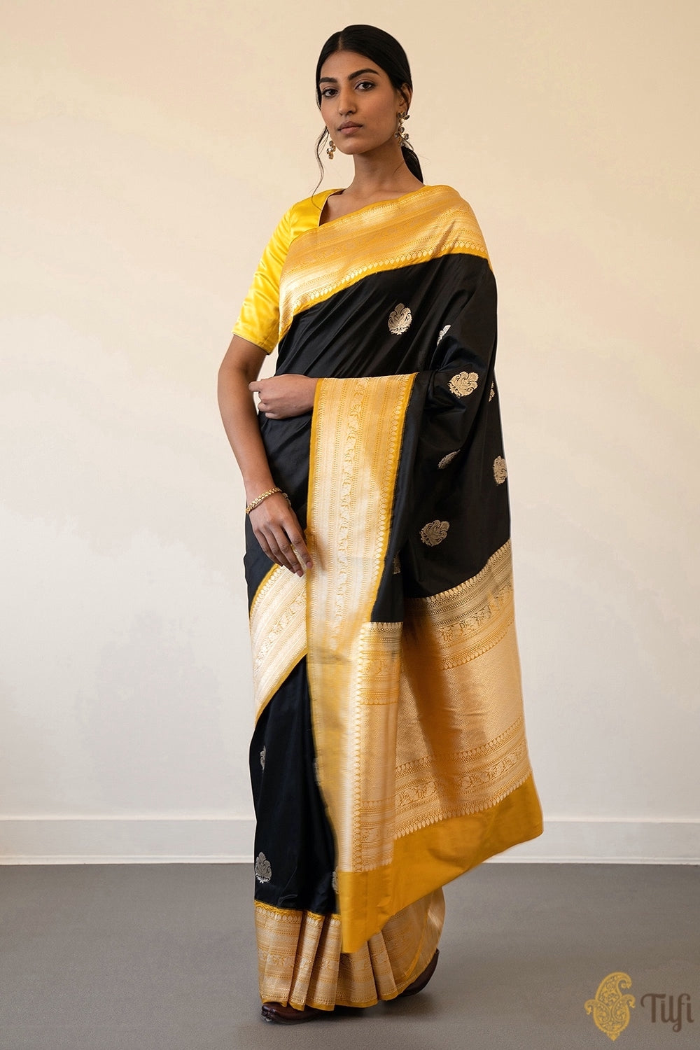 Color - A stunning shade of Black, with a contrast border and aanchal in Mustard