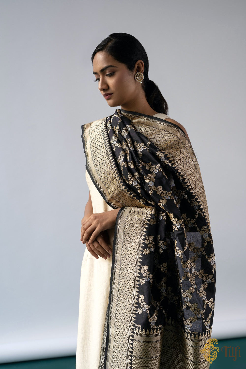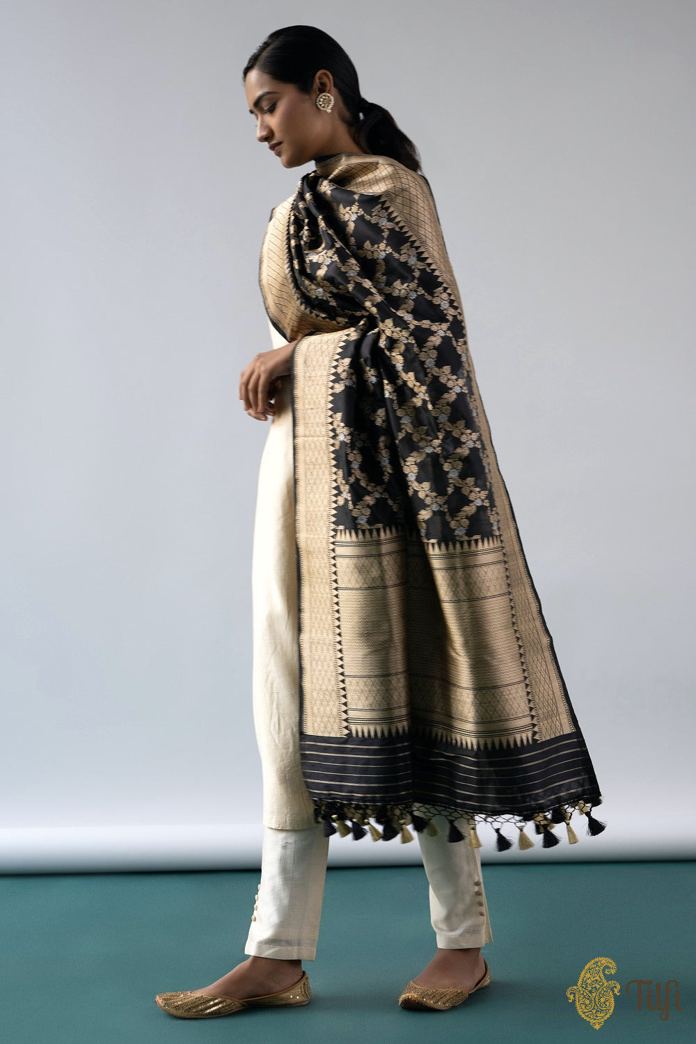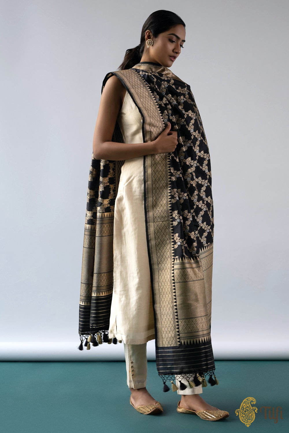 Black Pure Katan Silk Banarasi Handloom Dupatta