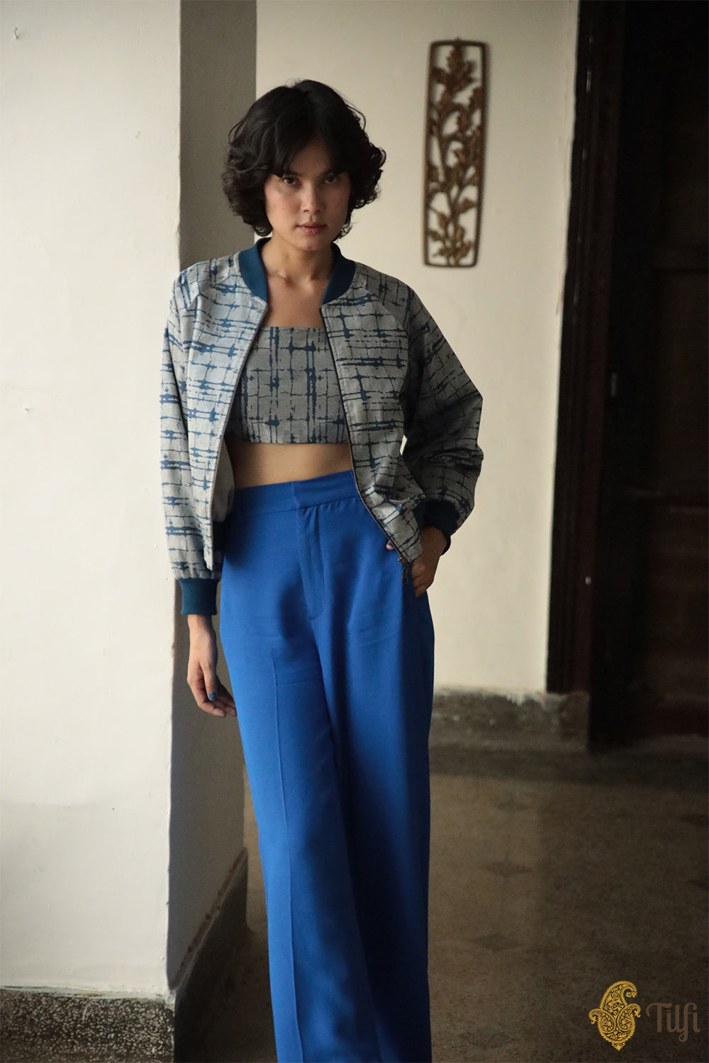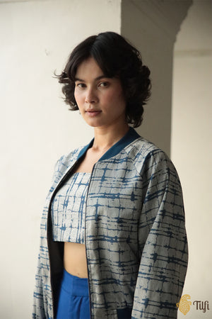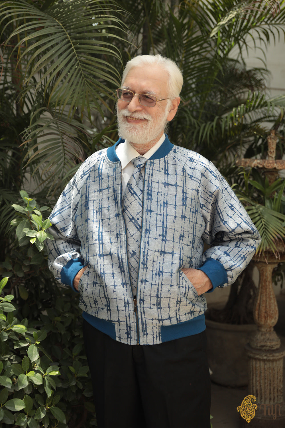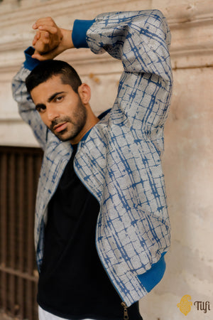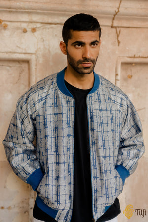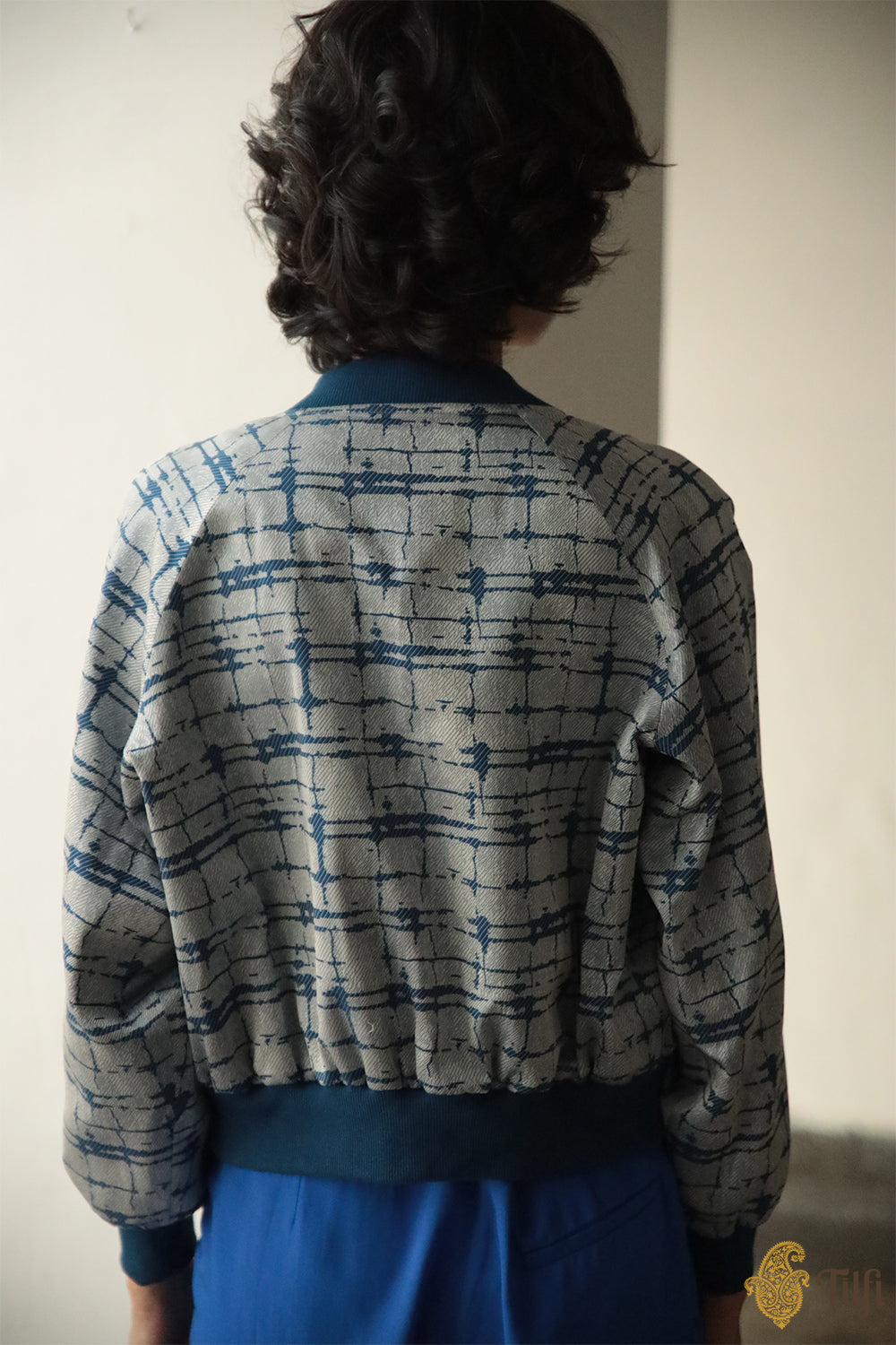 Blue Handwoven Katan Silk Abstract Bomber Jacket