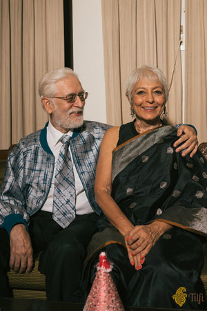 Made using the finest handwoven silk, our Bomber jacket presents a delightful play between relaxed silhouettes and traditional Banarasi weaves. Patterned with an abstract web woven in resham, this easy accent has all hallmarks of the classic -  quintessential ribbed collars, front zip closure, effortless side-pockets and a generous fit.