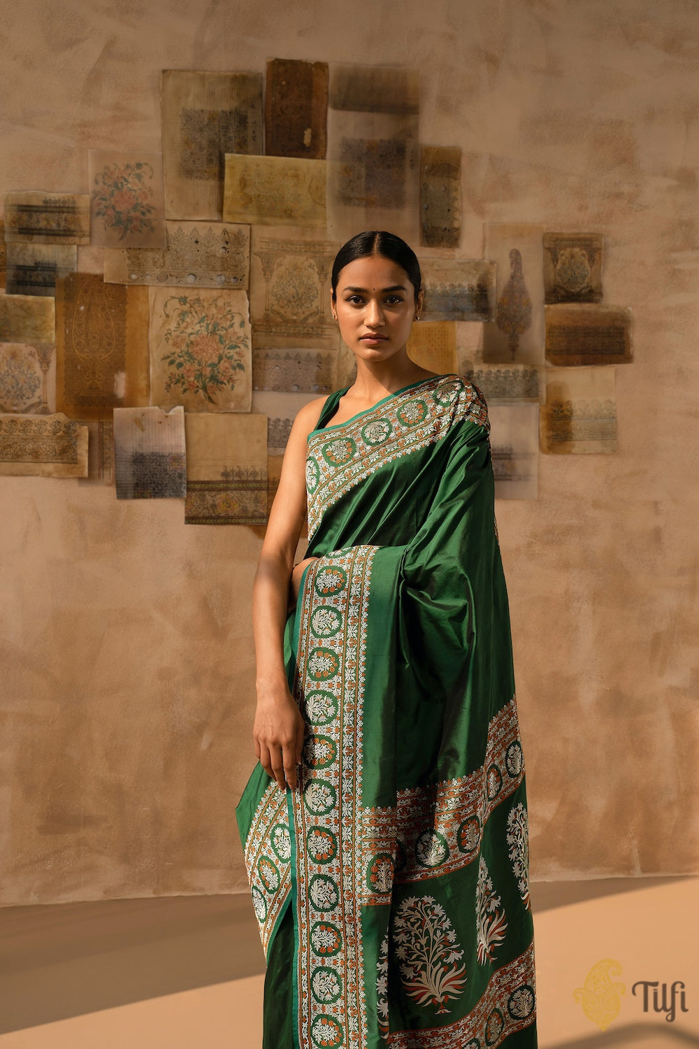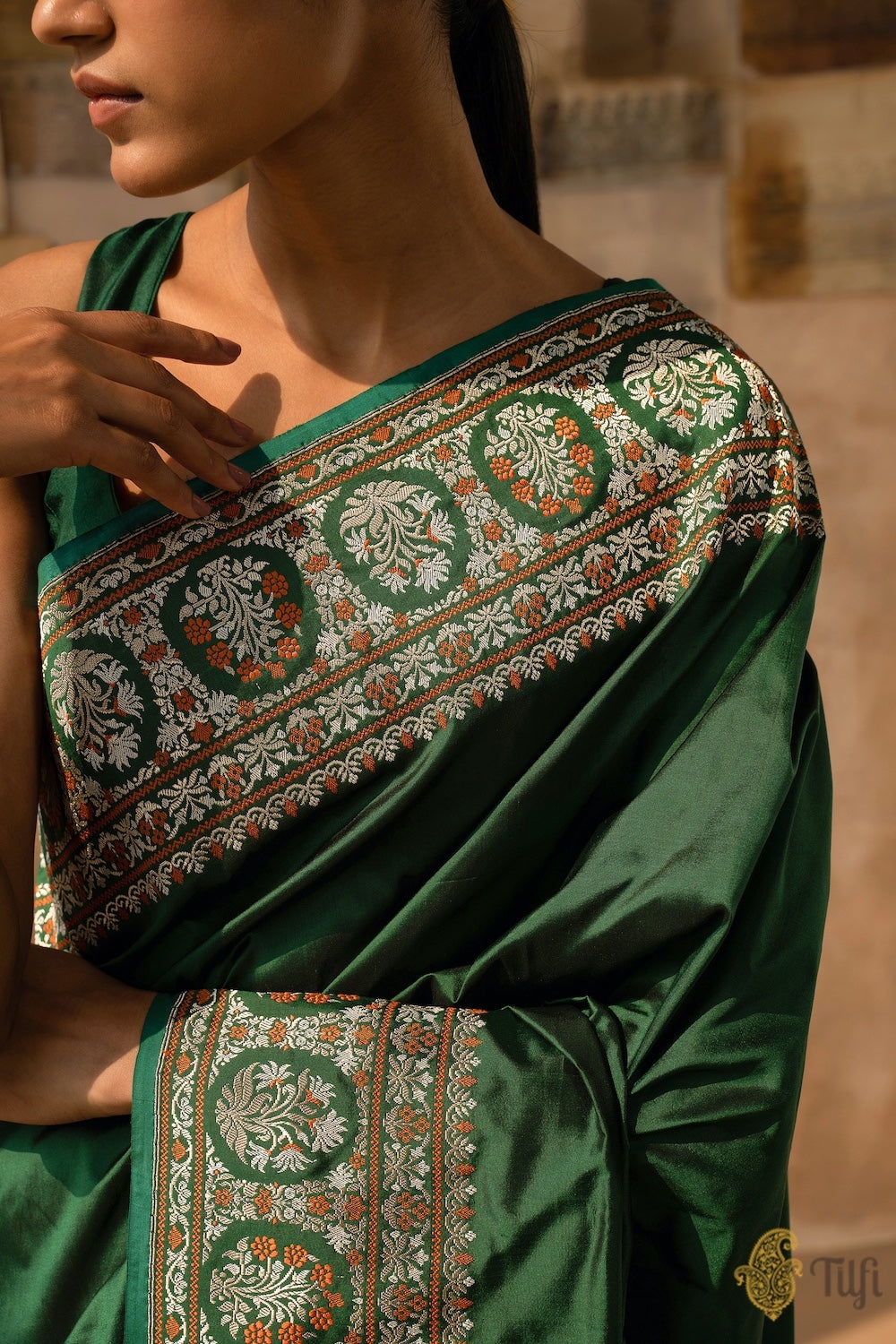 An understated, luxurious drape. A beautiful plain silken body, set against thoughtfully handwoven floral borders and pallu in exquisite kadwa meenakari. Wrap yourself in the most graceful silken drapes that embody heritage artistry and craftsmanship from our beloved Banaras.