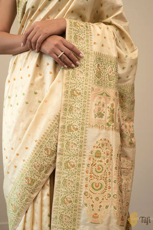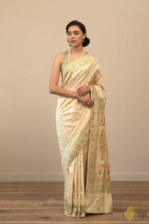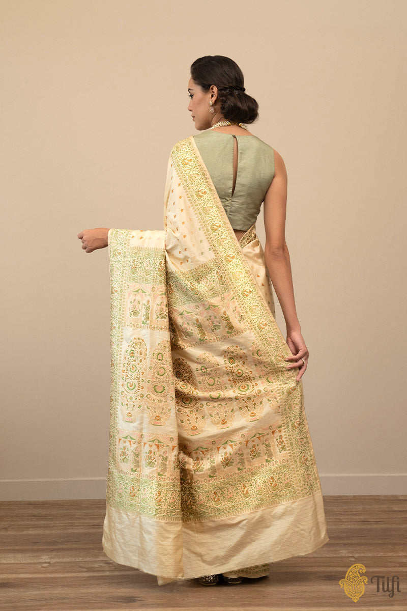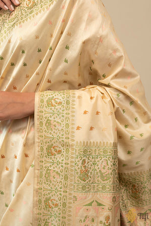Specialty - An entrancing drape with a plethora of rare woven motifs - nawabs, begums and Baluchari bootas - perfectly balanced against a delicate shower of meenakari leaves. This is a painstakingly handwoven masterpiece with extraordinary craftsmanship for those that seek quiet discretion.