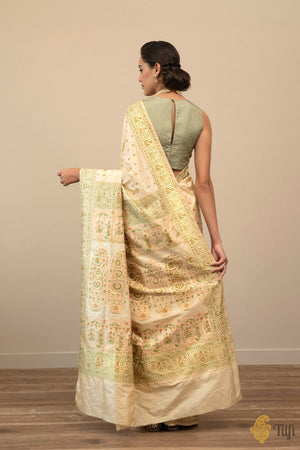 One of our wondrous archival designs. Indulge in this heirloom Banarasi Baluchari treasure, alluding to a bygone era. Adorned with the most delicate, many-hued meenakari and classical motifs on a smooth silken bed, this saree is a timeless rendition of heritage Banarasi artistry.
