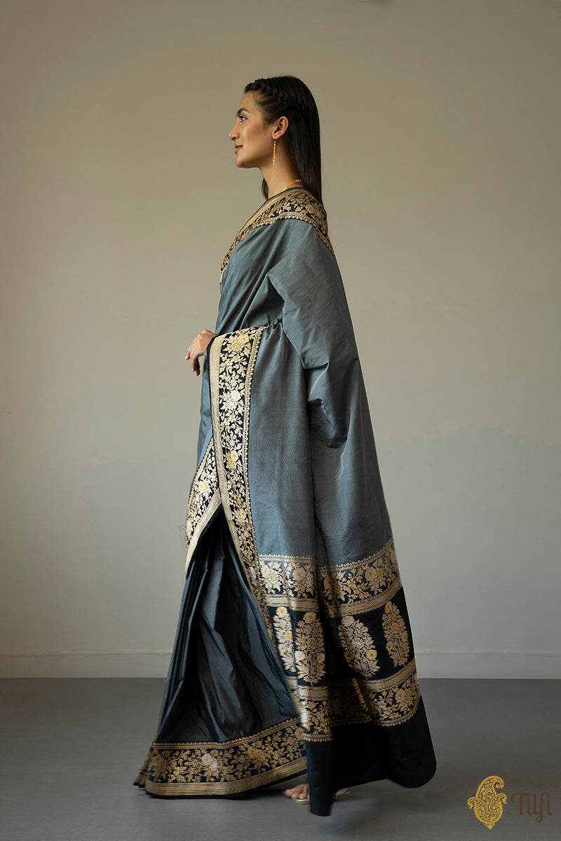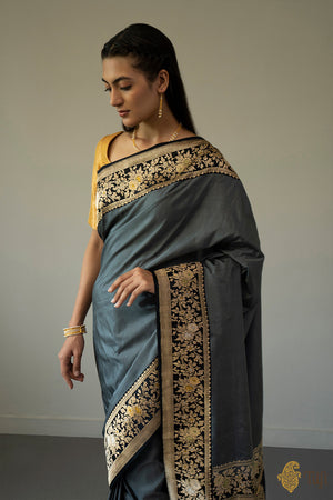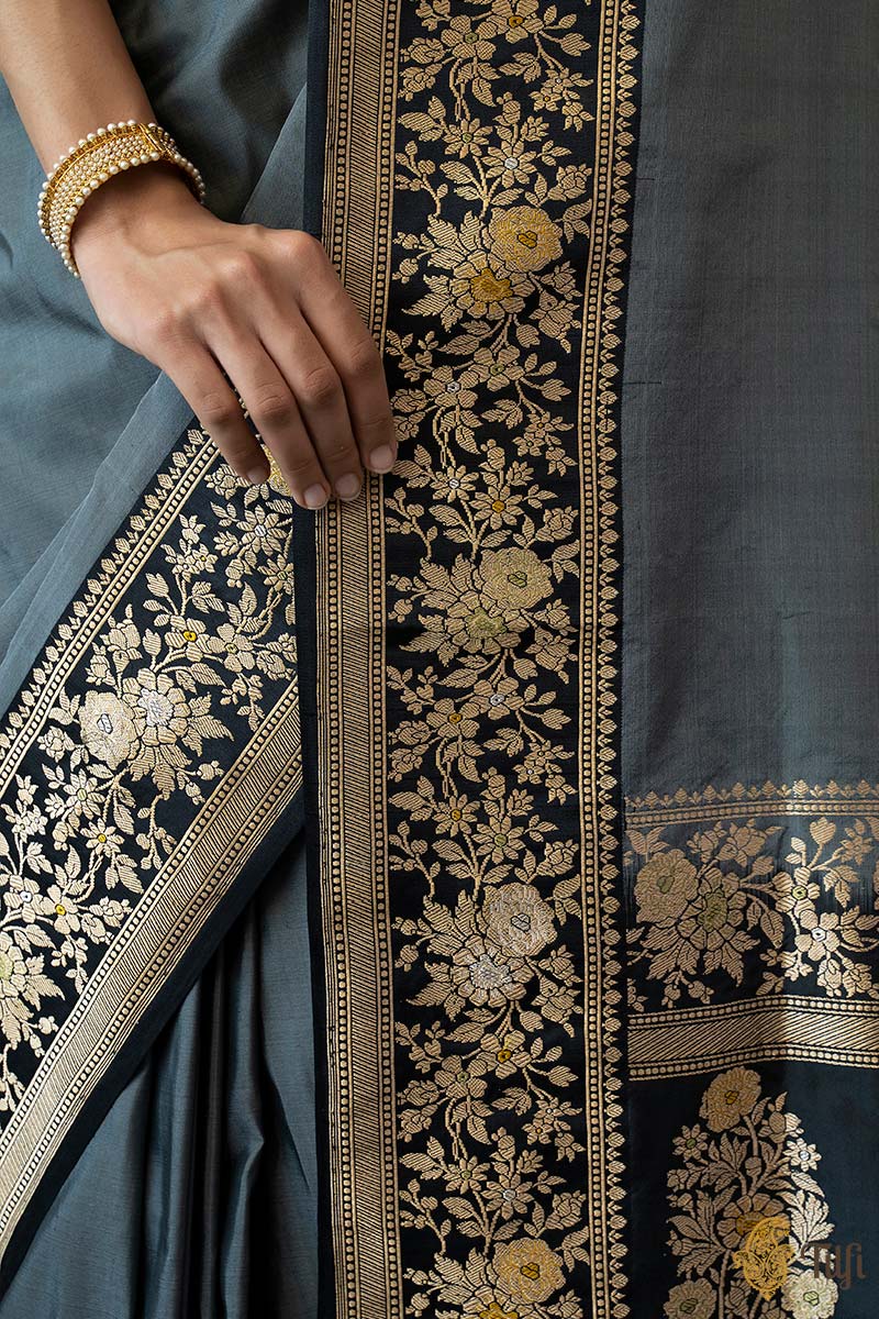 Speciality - A gorgeous plain katan silk body woven in the finest kadhua style with a detailed gold meenakari floral border and pallu.
