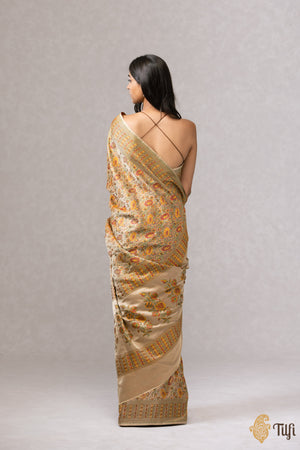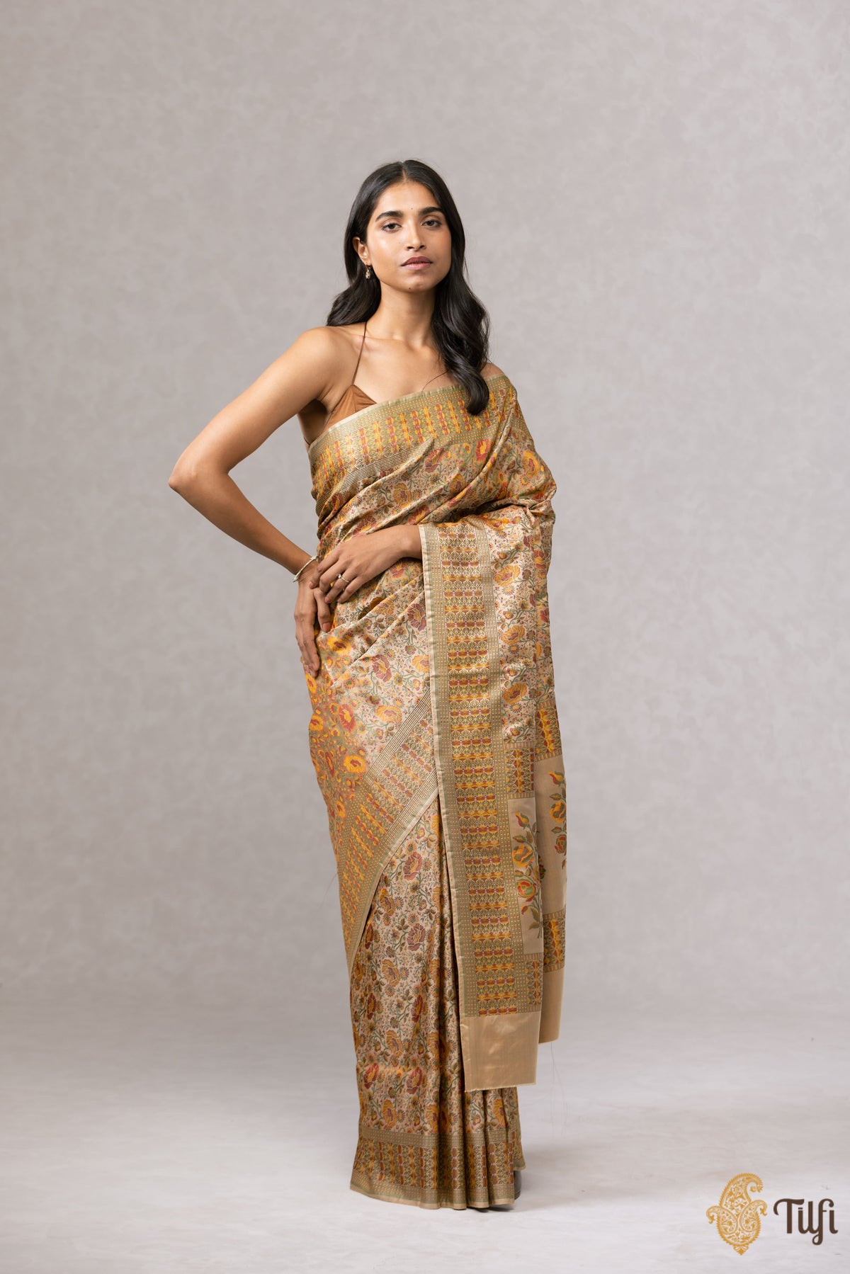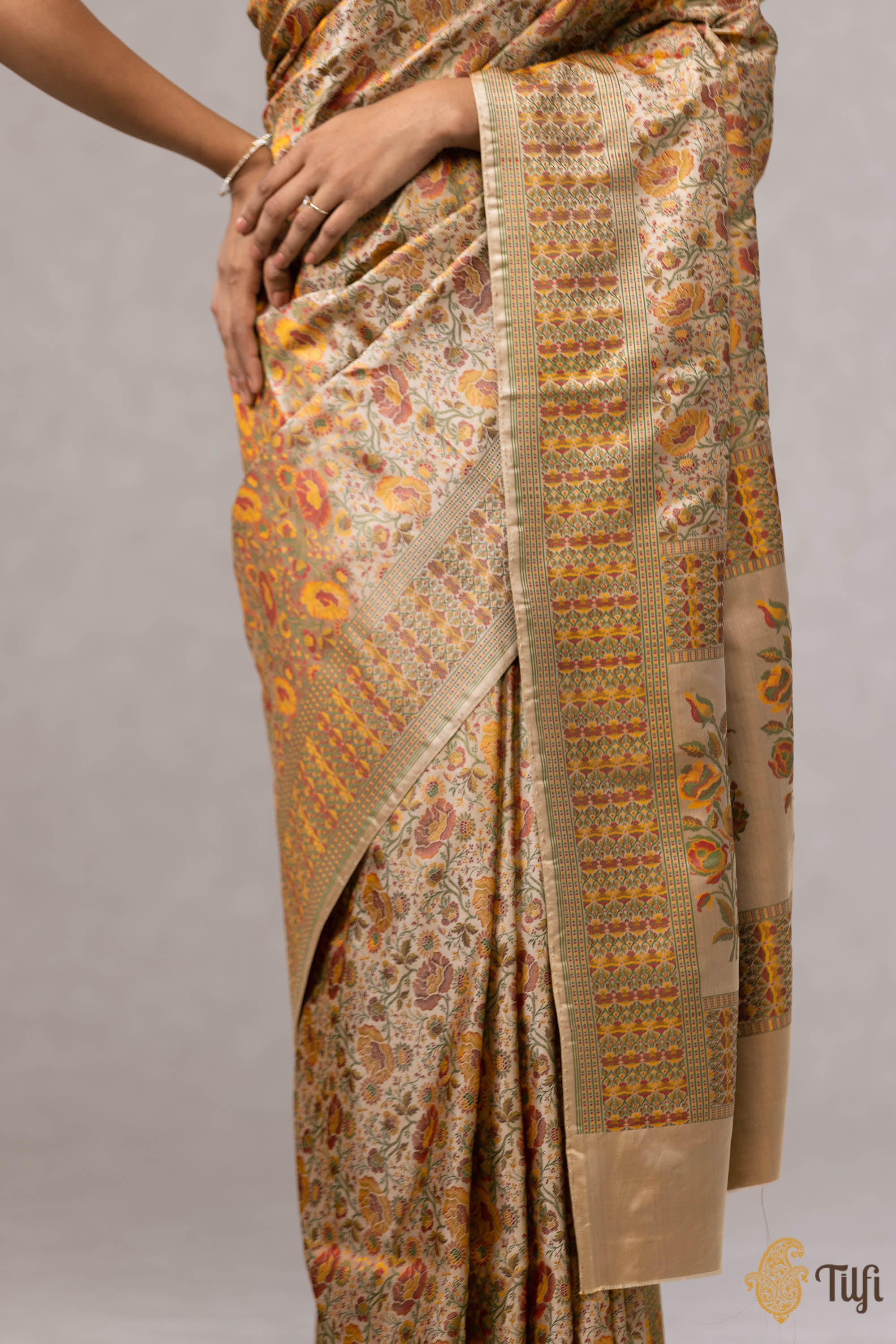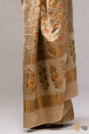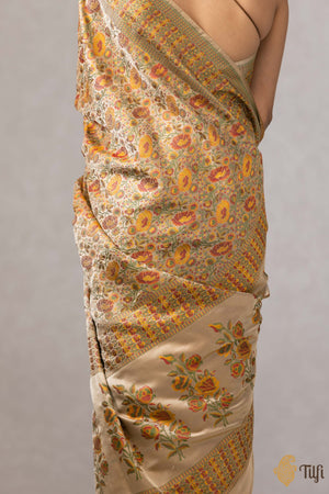 Speciality - A beautifully handwoven allover floral jaal on the finest Satin with exquisite 4-colour Tanchoi Meenakari. Tanchoi ensures that there is no float on the back of the saree.
