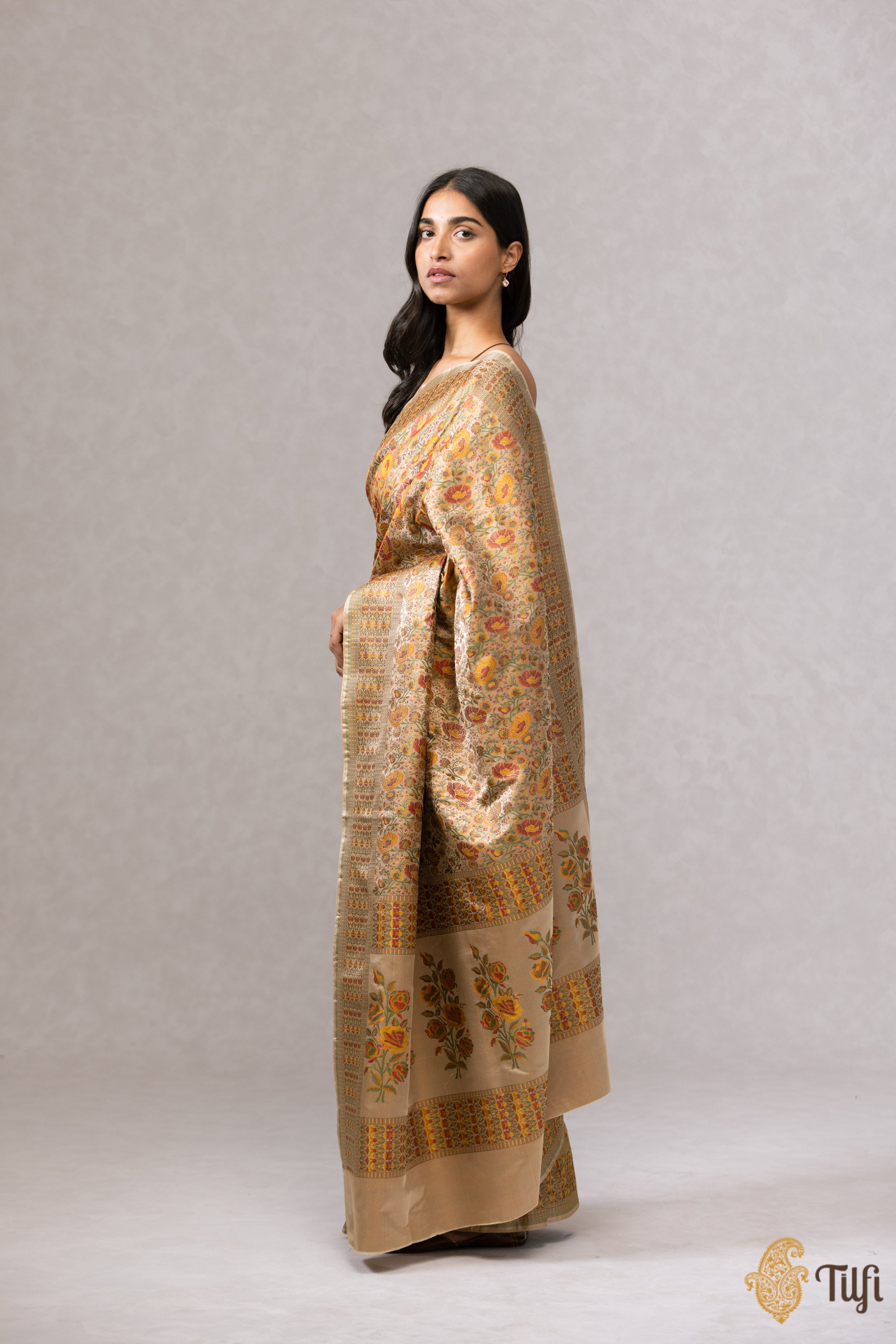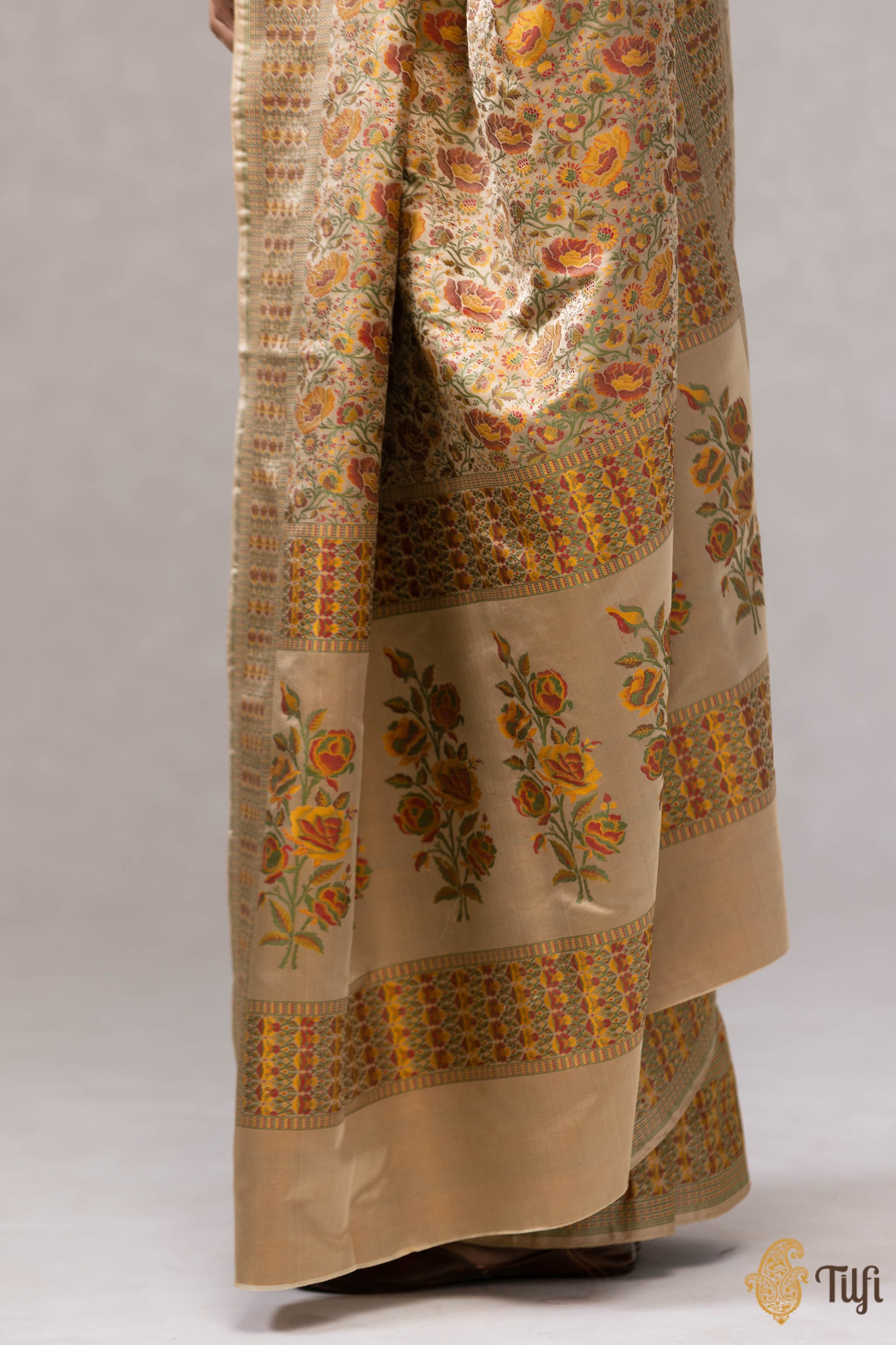 The romance of yesteryears and enduring craftsmanship come together in this spellbinding Banarasi classic, handwoven in an intricate Tanchoi pattern and accentuated with vibrant Meenakari florals.
