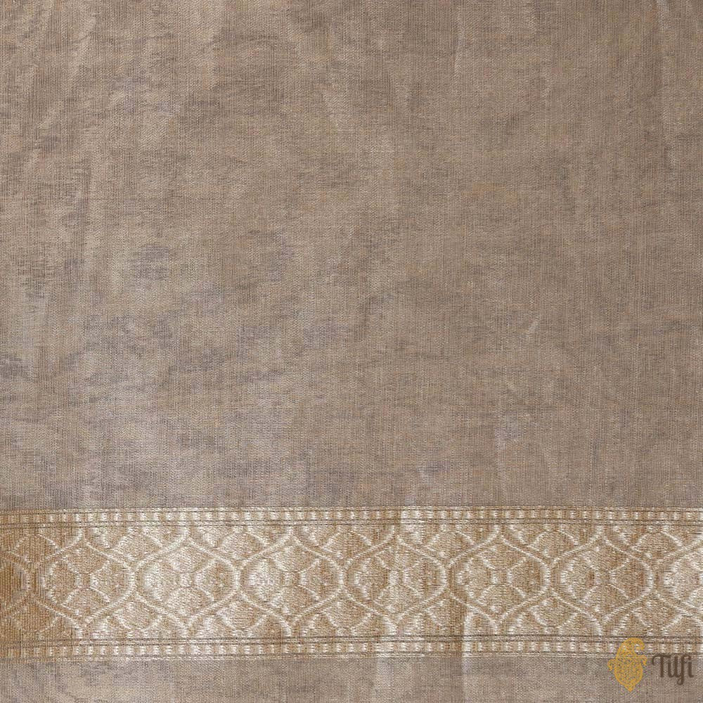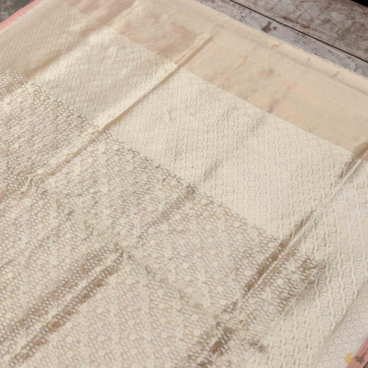 A picture of perfection. This is a gorgeous and lustrous saree for days when nothing can dull your sparkle! It has beautiful gold zari and resham bootis in a diagonal (aadha) pattern, all on a gossamer bed of Kora Tissue. Delicate and dreamy Banarasi!