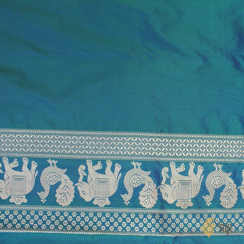 A rich and luxurious Shikaargah handloom saree. Zari vines, animal motifs and intricate jungle scenes make this a piece of woven art. An ode to handloom and a true Banarasi masterpiece.