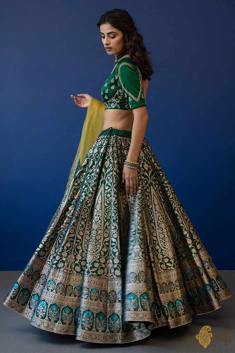 Centuries of handloom craftsmanship and fine hand-embroidery come together to create a soulful rendition of heritage artistry. Paying homage to Mughal design sensibilities in art and architecture, this enchanting lehenga encapsulates the true beauty of the art of hand.