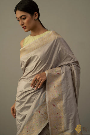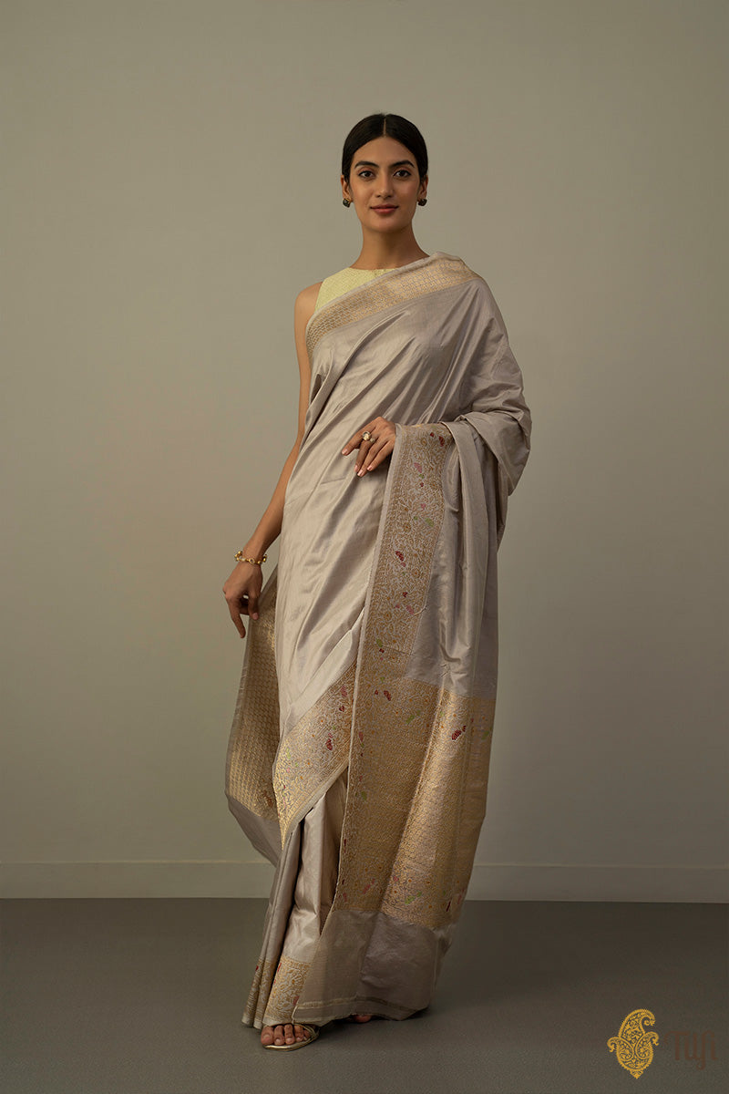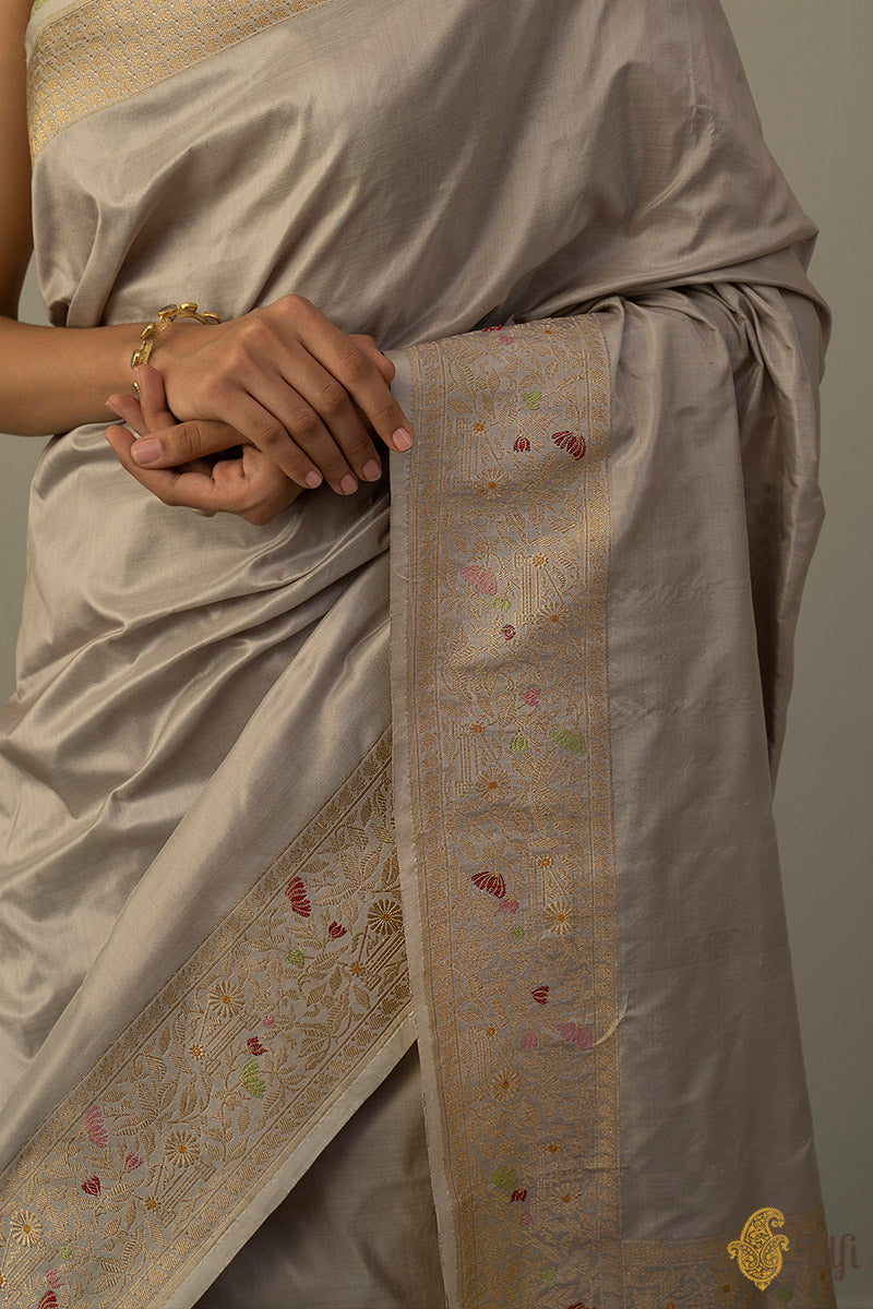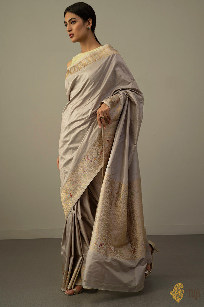 Technique - An enduring Kadwa weave and fine Meenakari technique. The elaborate and laborious Kadwa (Kadhua) technique involves hand-weaving each motif separately. It takes longer on the handloom, but makes a more robust pattern, which stands out on the fabric. Meenakari involves the painstaking addition of supplementary coloured resham threads during the hand-weaving process.