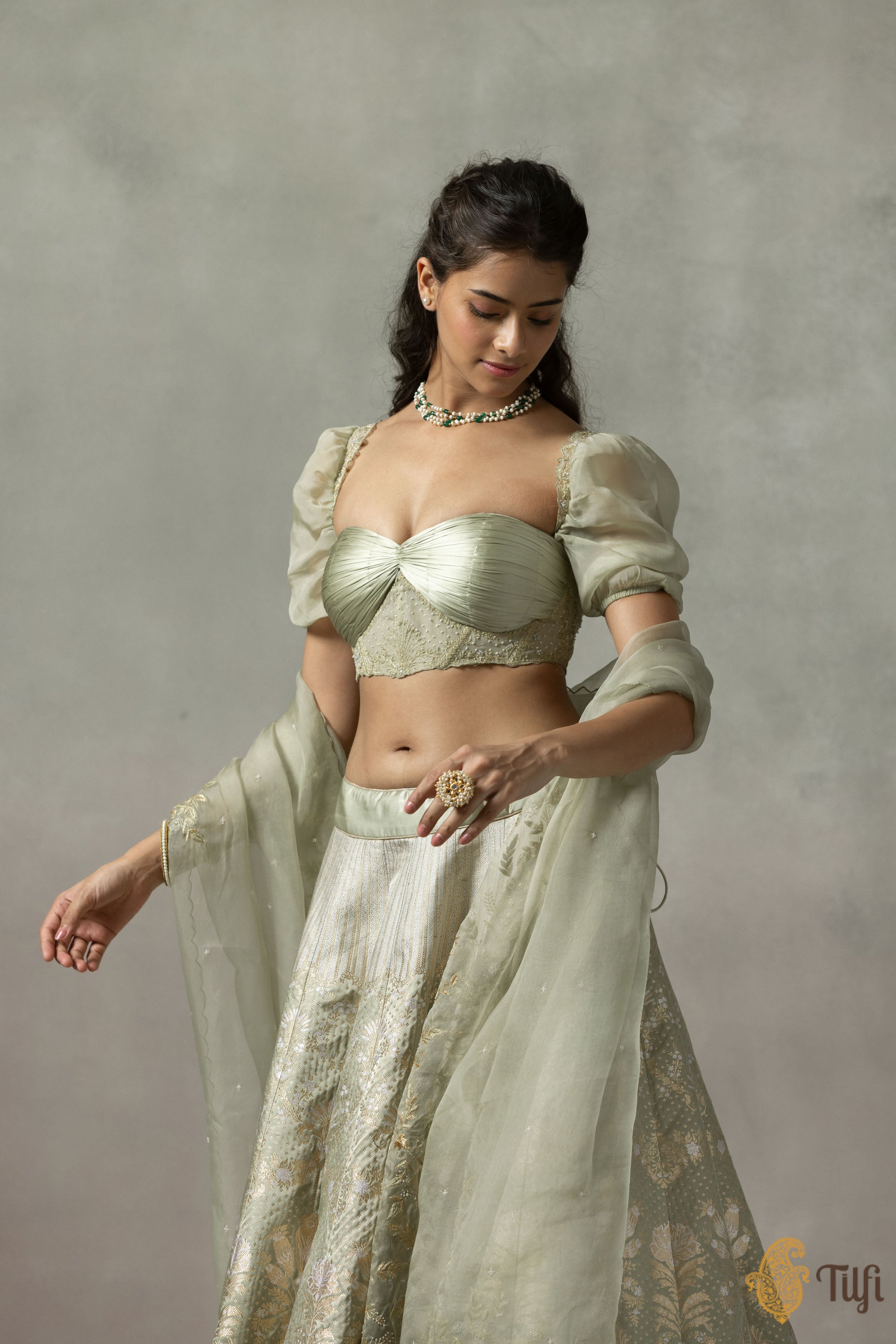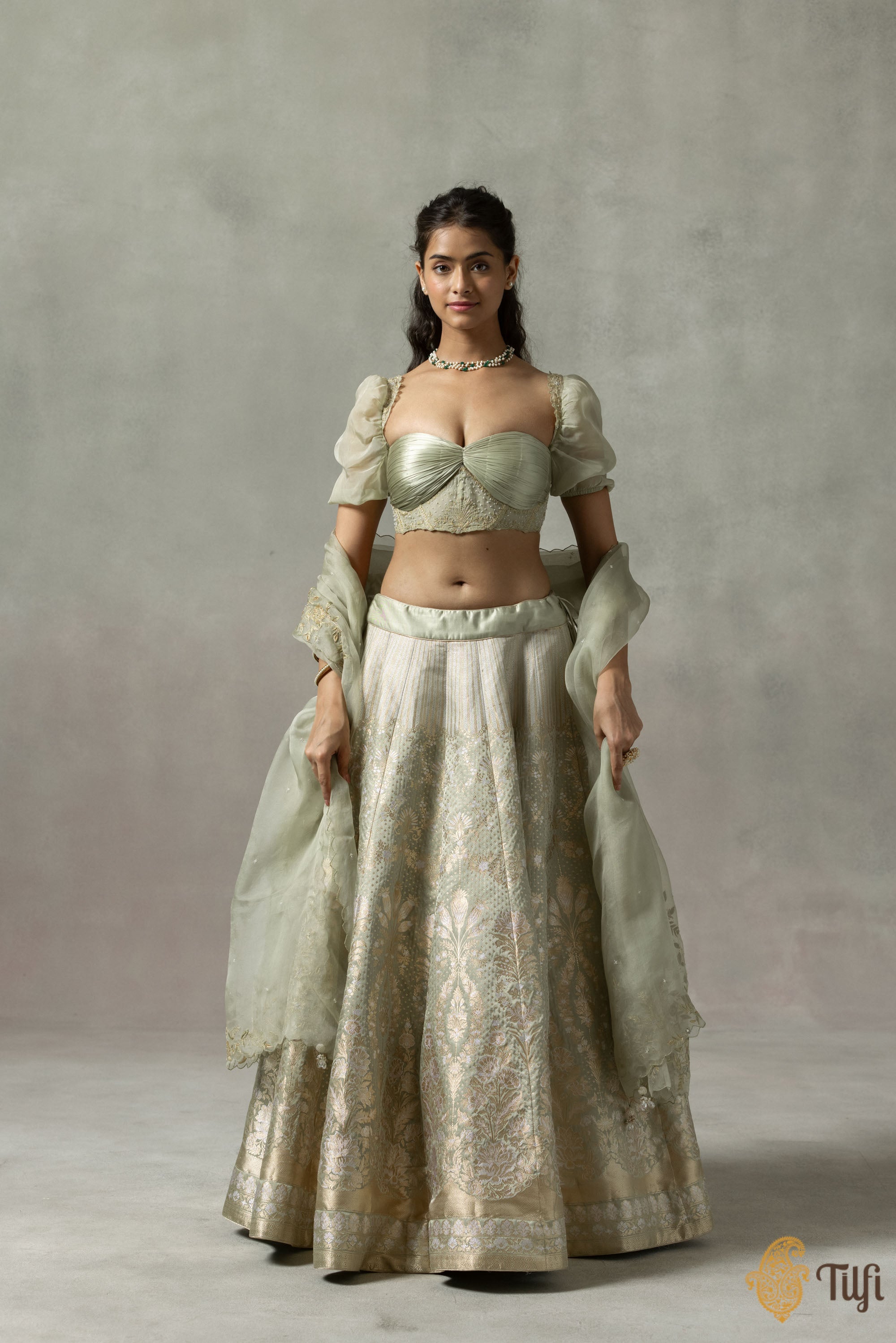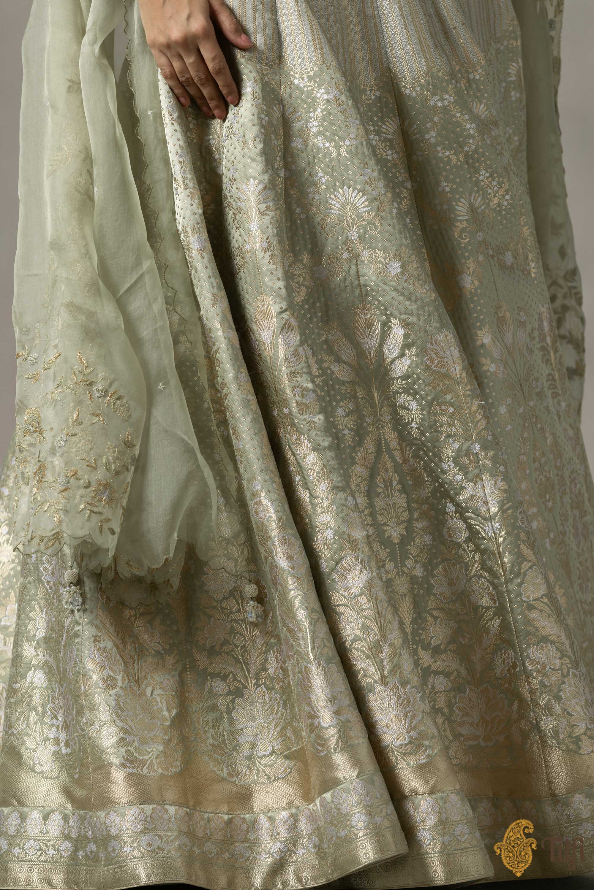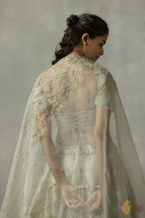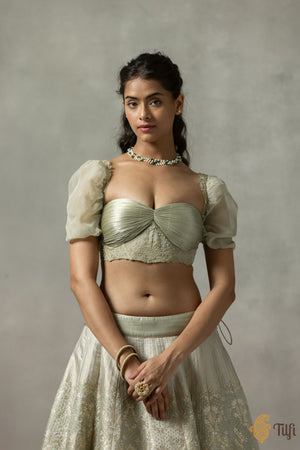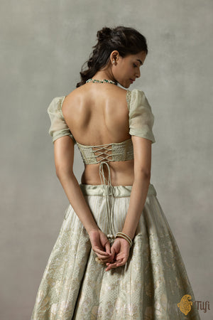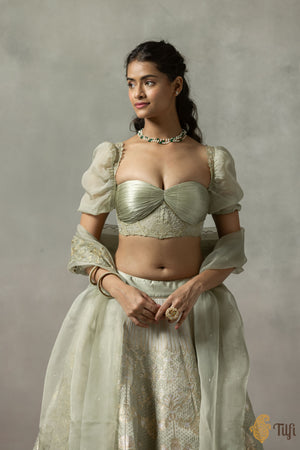 'Juliette' Sage Green Pure Satin Silk Banarasi Handloom Lehenga Set