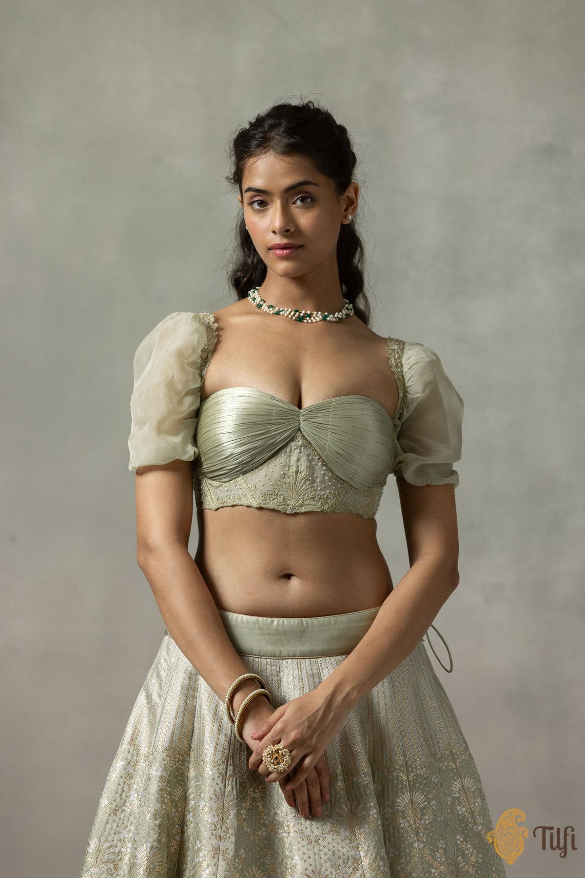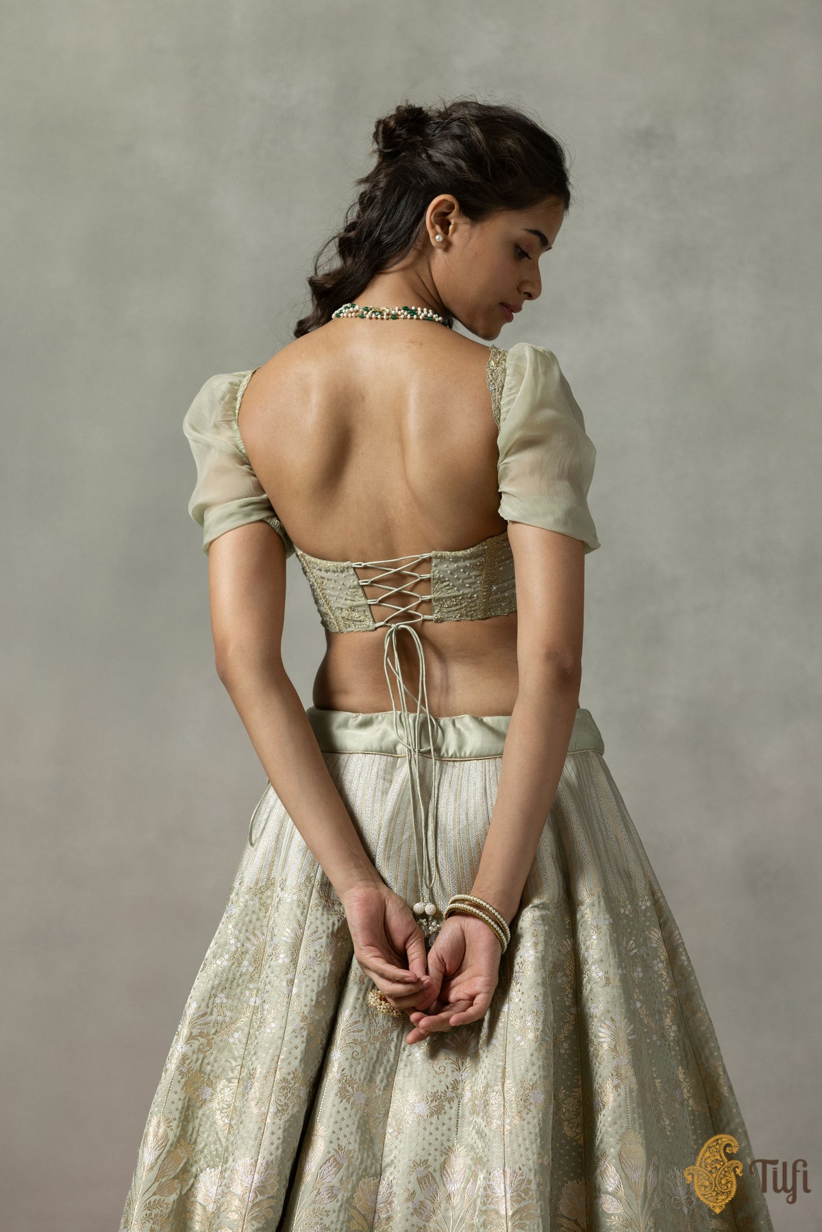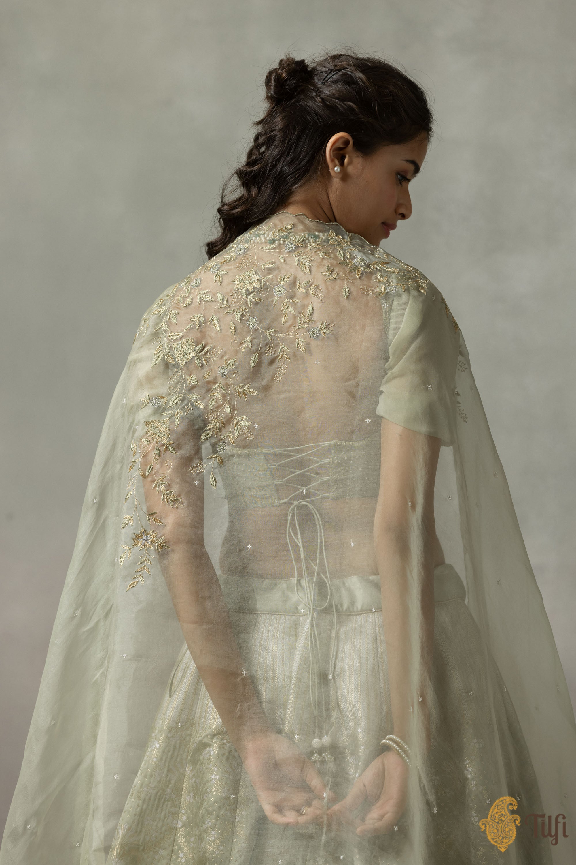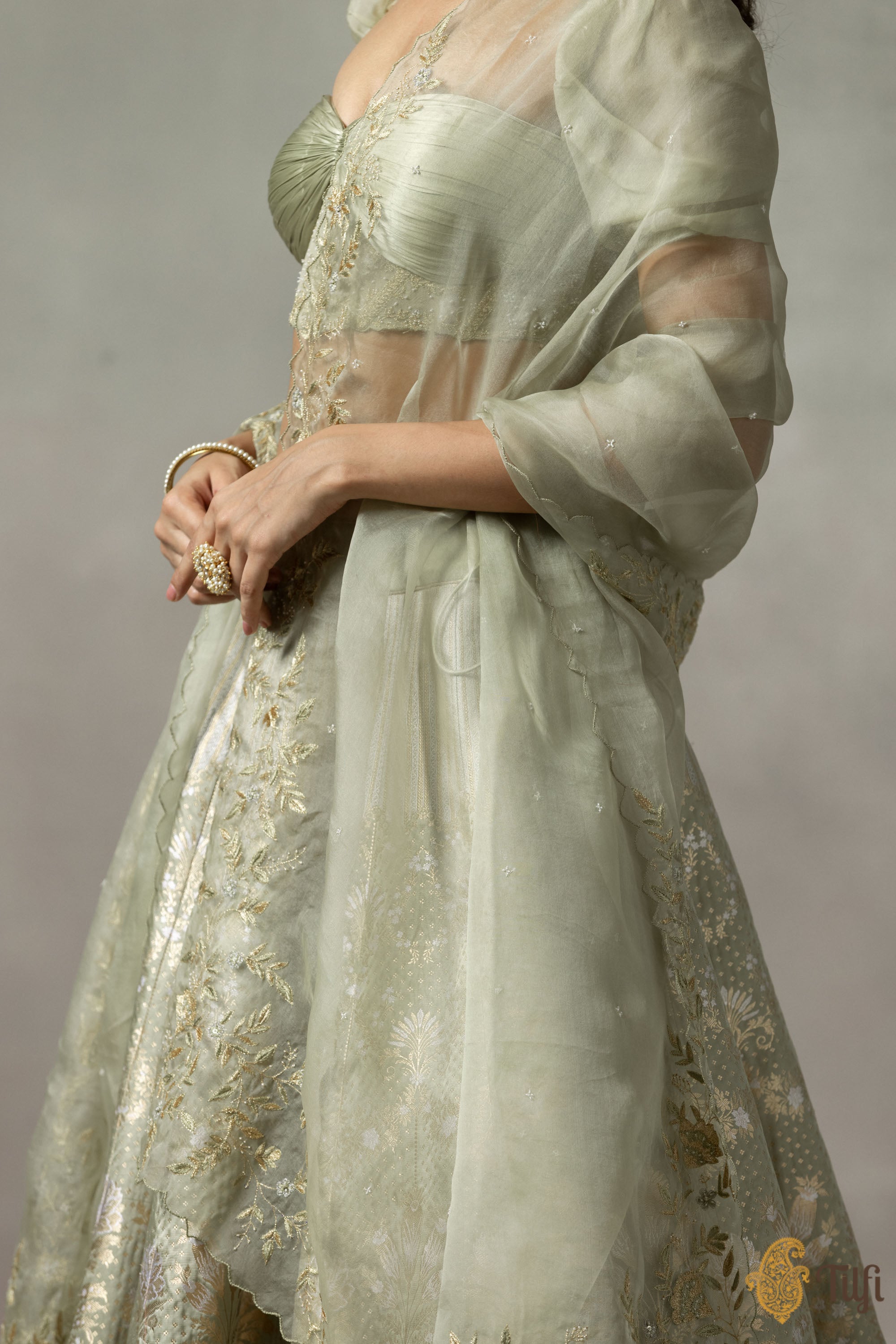• Collection note - A pioneering take on the Banarasi brocade, Tilfi's Quarter to Time collection finds artistic synergies between 18th century French Rococo art and heritage Banarasi craftsmanship, marrying silhouettes that have defined feminine wardrobes across diverse cultures and eras.