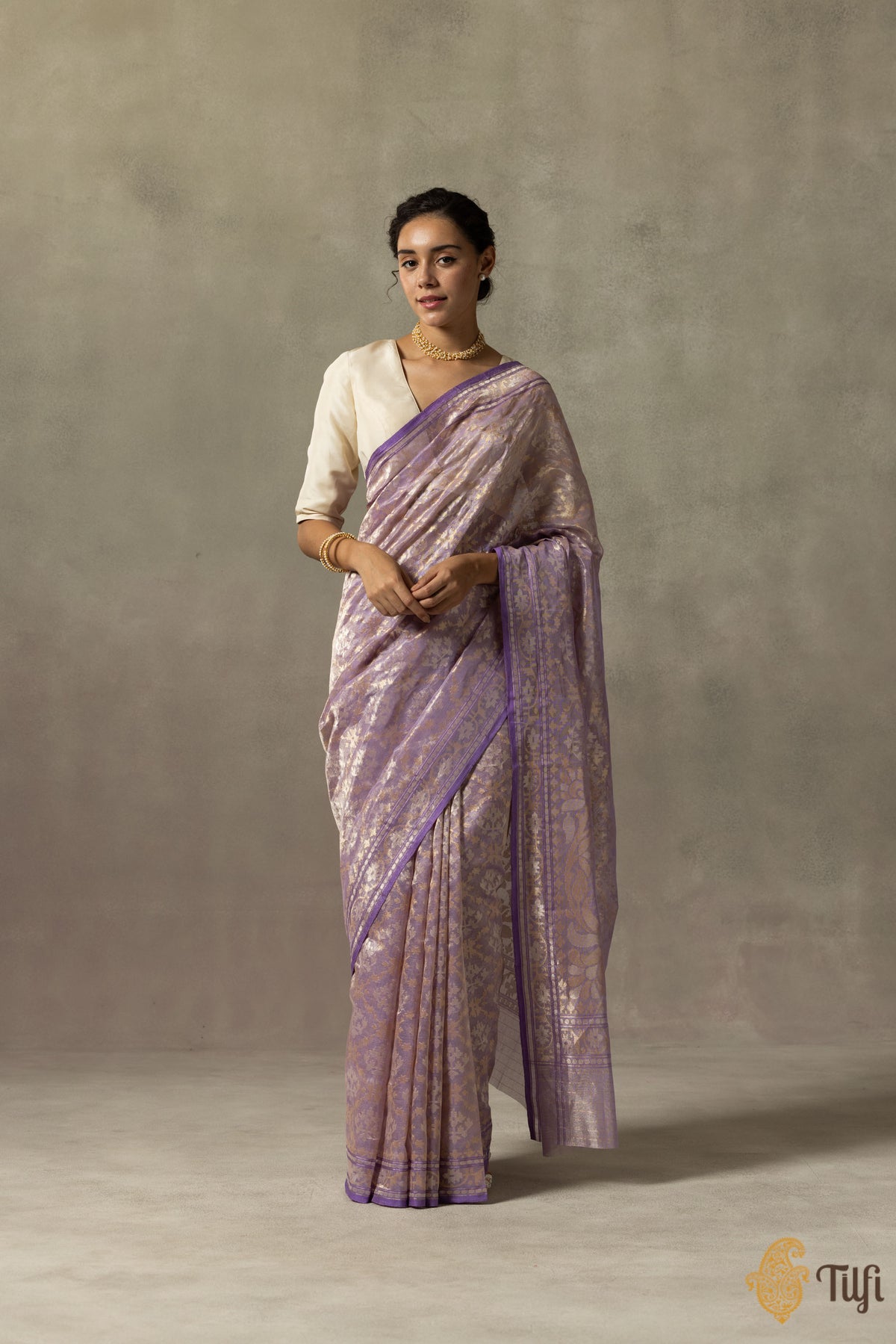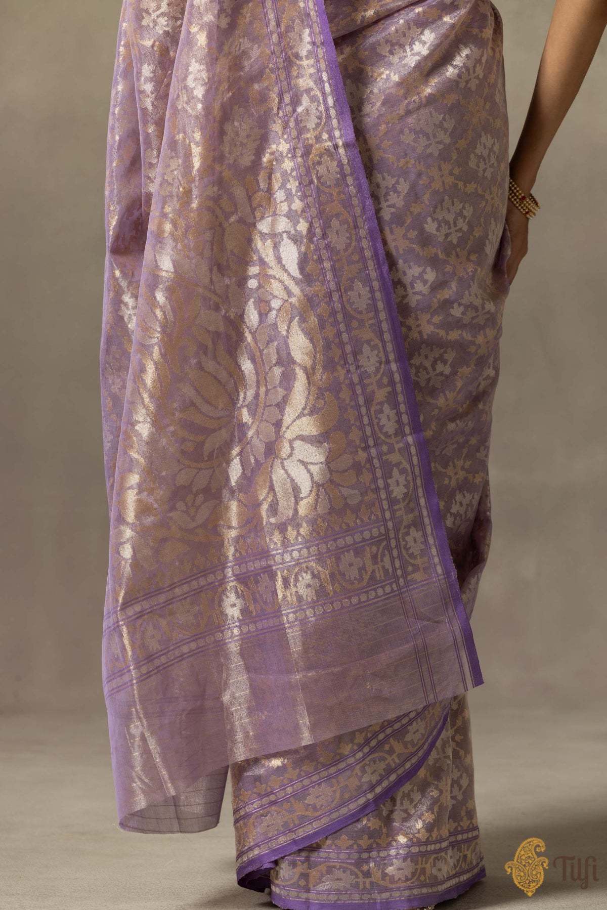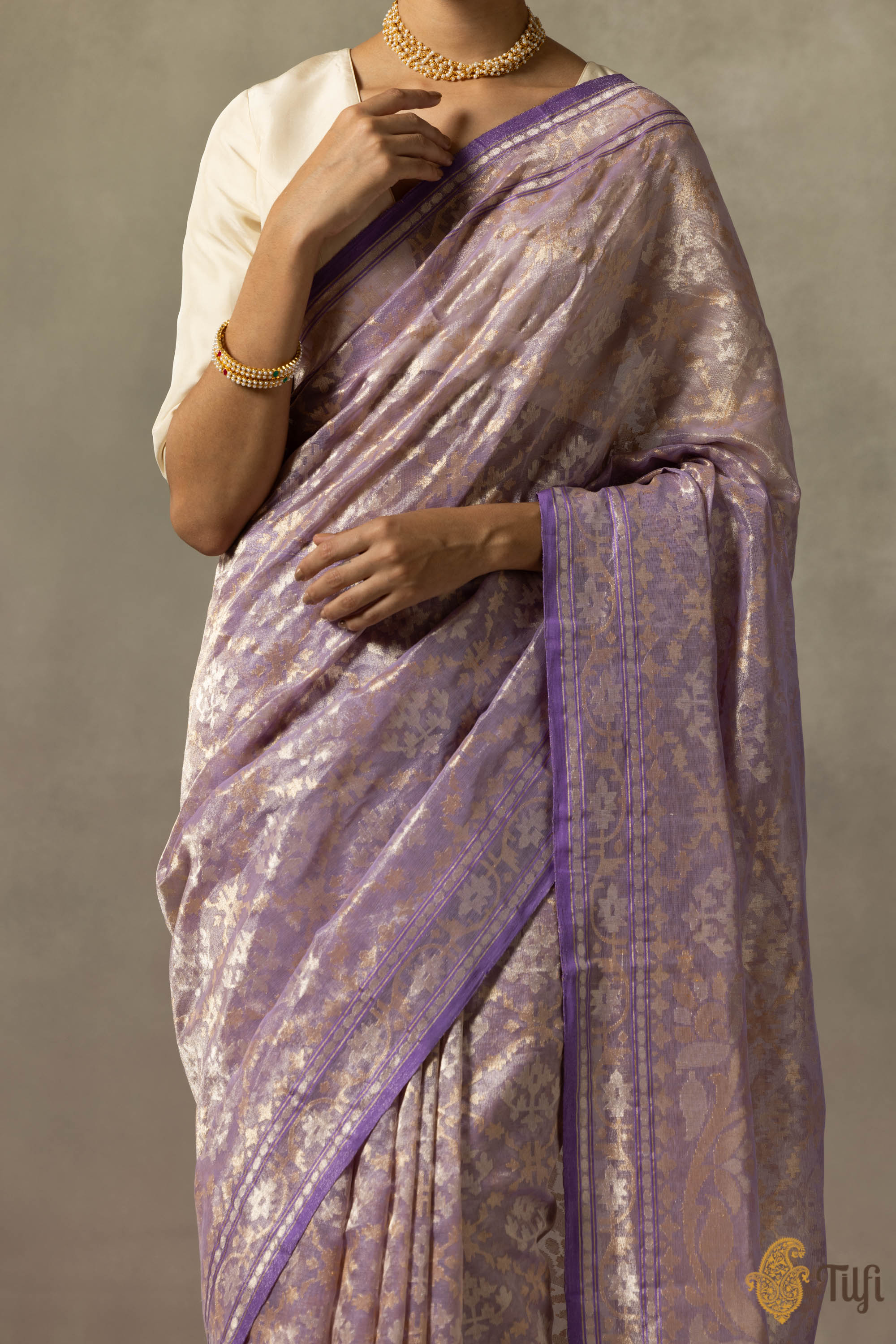 Speciality - With zari threads made of real silver, this is a Banarasi gem. Fine shimmering tissue, deftly woven with light as air Jamdani patterning, makes this a weave of extraordinary distinction. A magnificent jaali in roopa sona zari adorns the body with an elaborate, artistic pattern. This is a rare saree, made especially for the discerning.